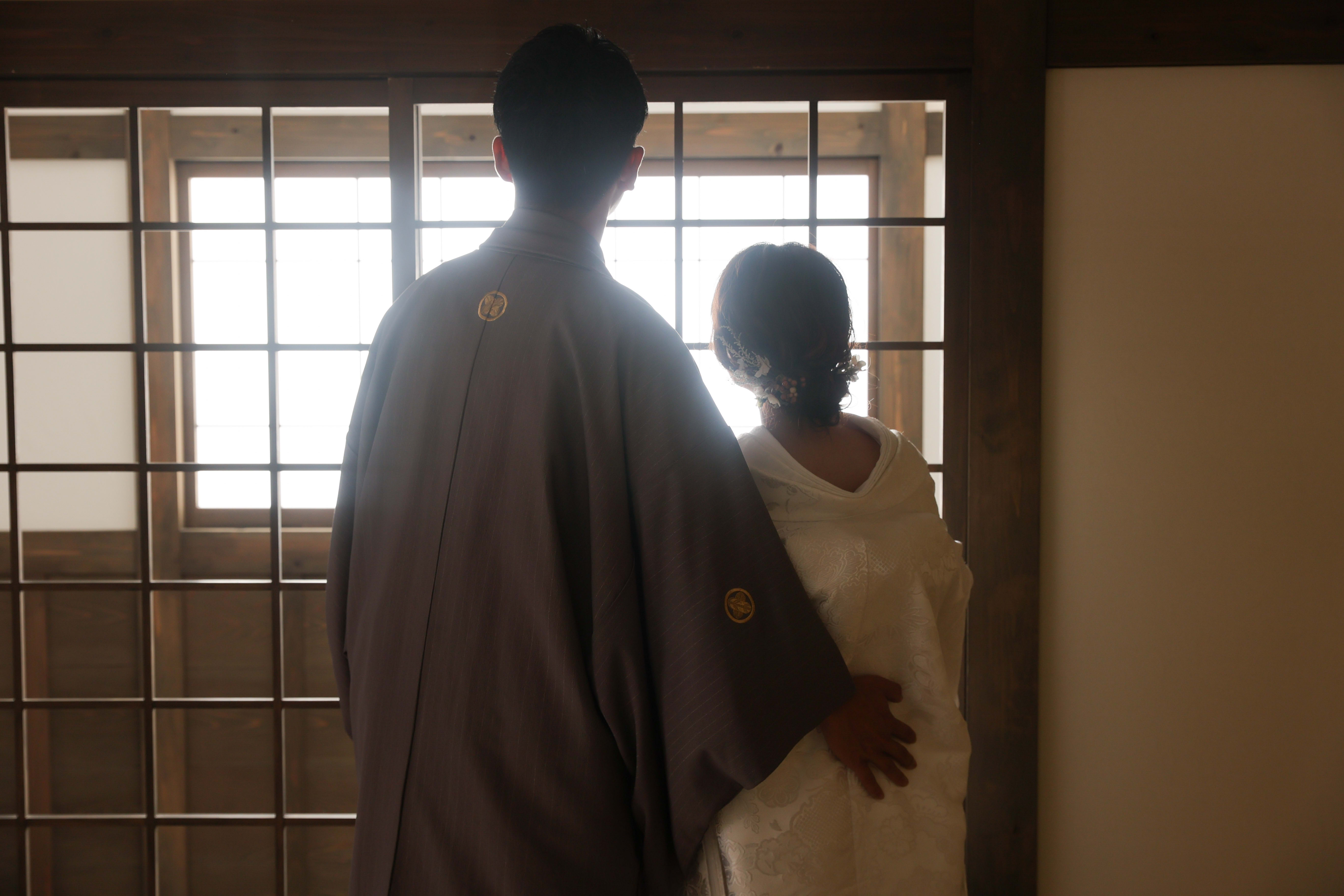 水墨画の背景で白無垢とグレーの紋付袴がマッチしてます♪