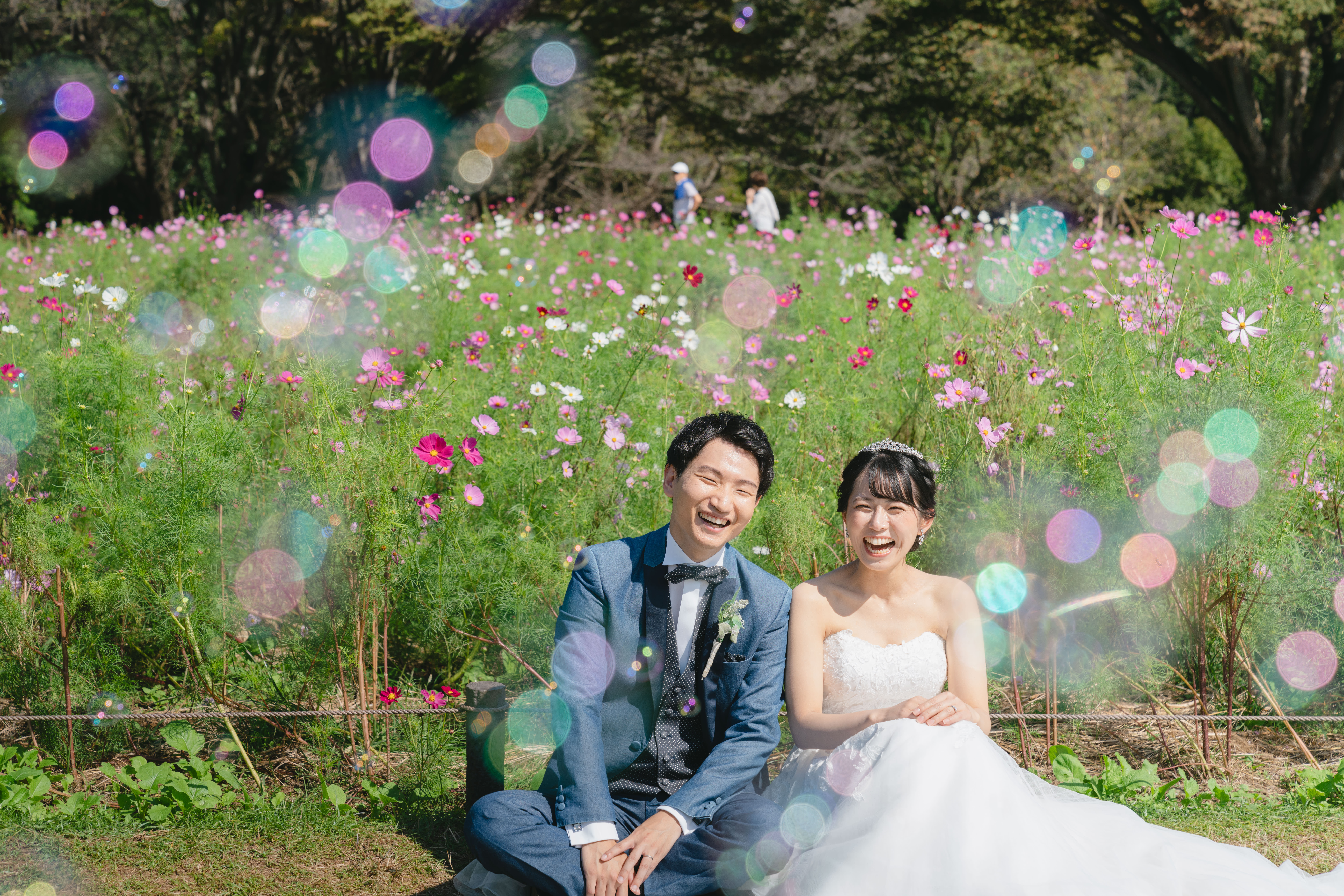 今回のメインはピンクのコスモス!ふわっとした雰囲気に似合うよう、ご新郎様に思いっきりぎゅっとしていただき、笑顔の瞬間を残すことができました!