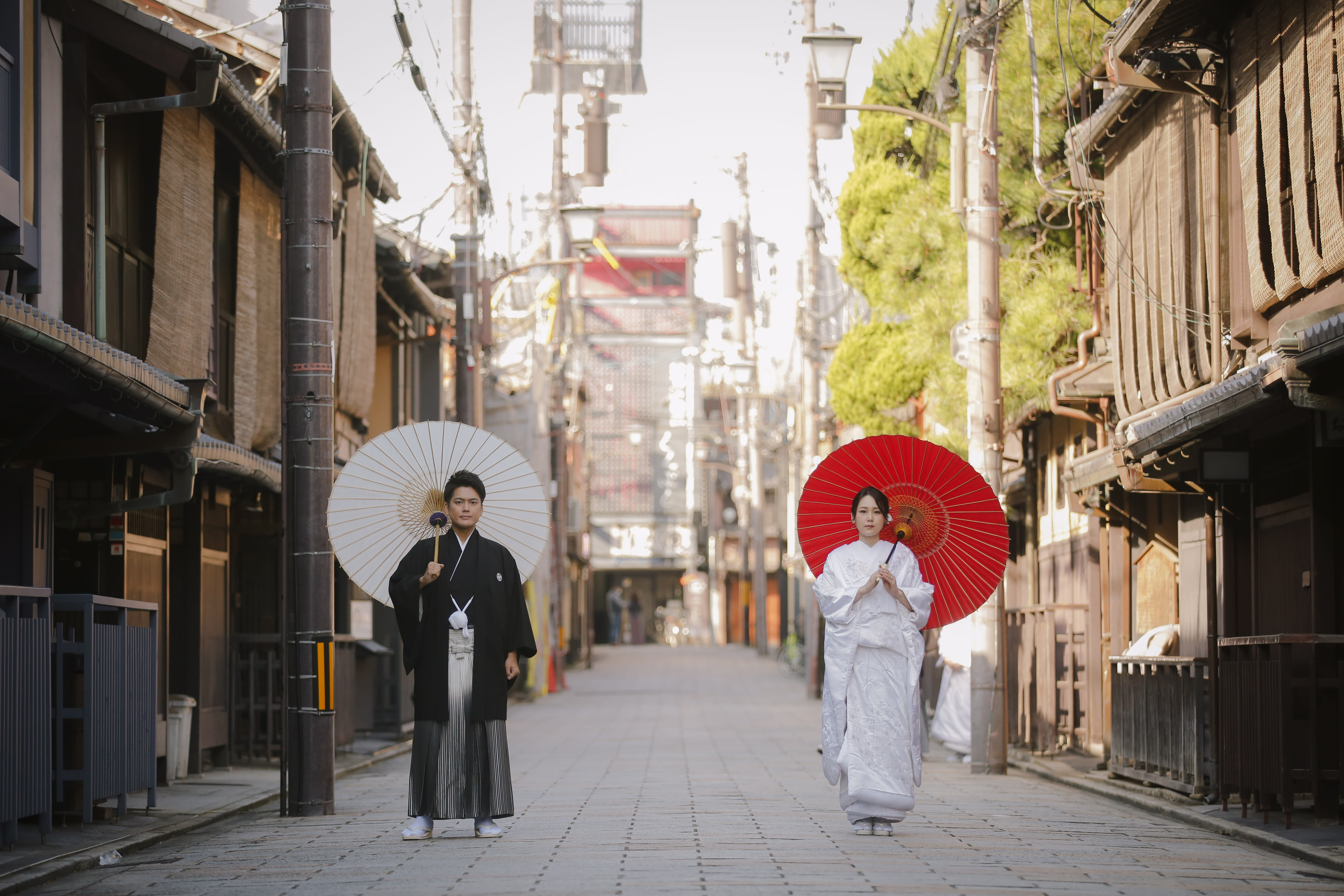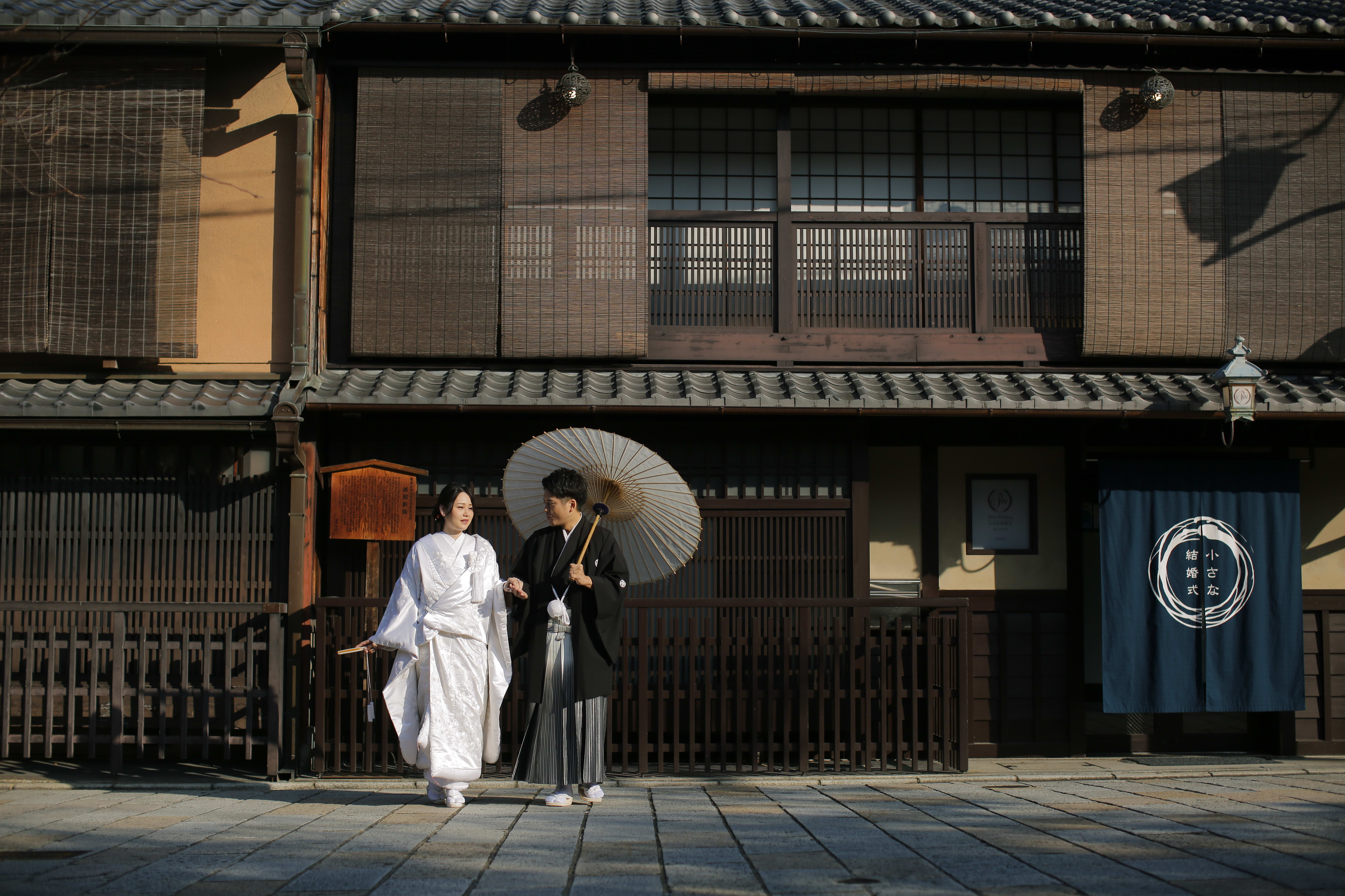 祇園の街並みと白無垢の相性がバッチリでとても美しいです♡