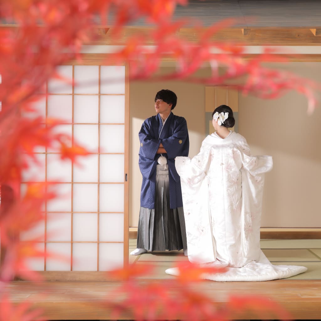 優しい光に包まれて、思わずお二人もにっこり^^紅葉の赤色と白無垢の白色が相性ばっちりです!