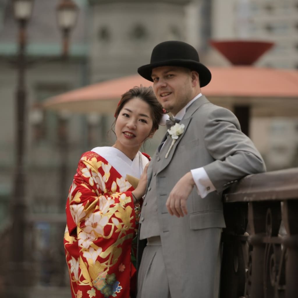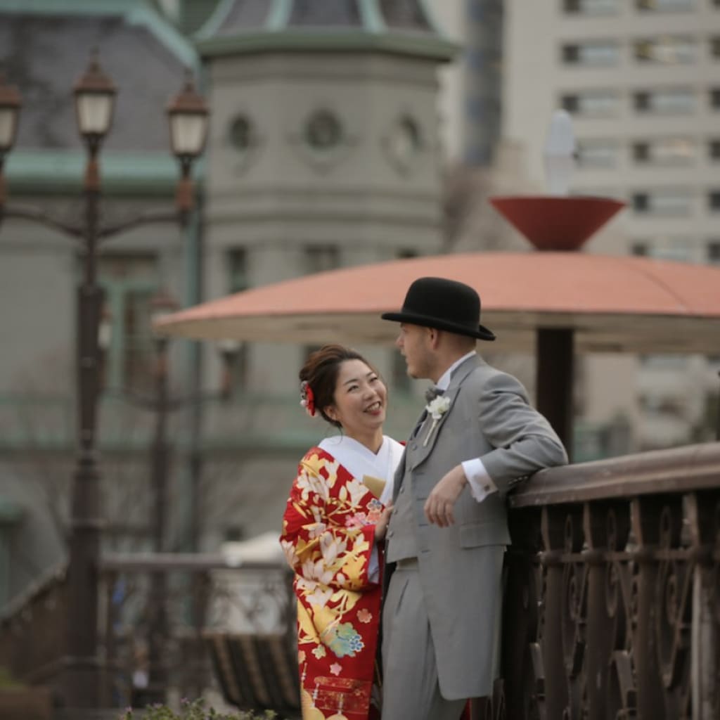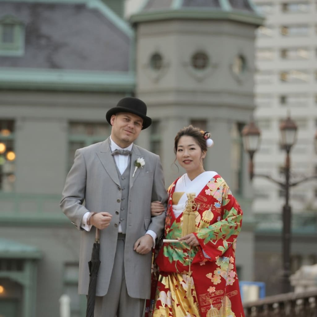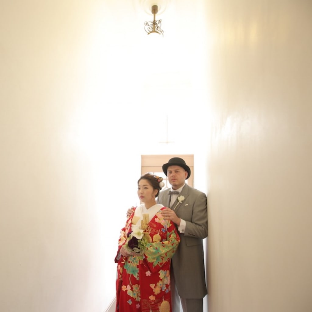 新郎様はタキシード、新婦様は色打掛で。
