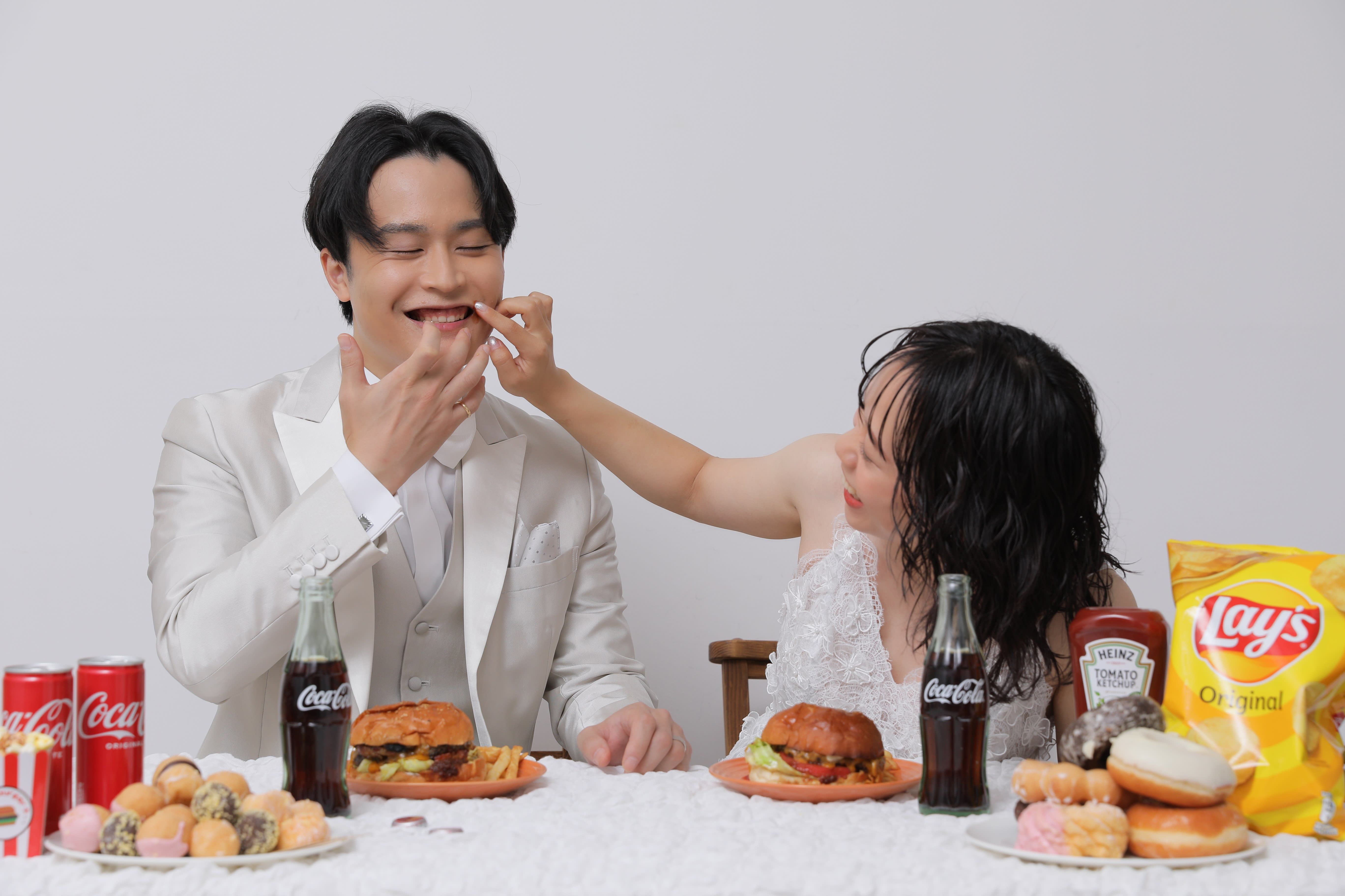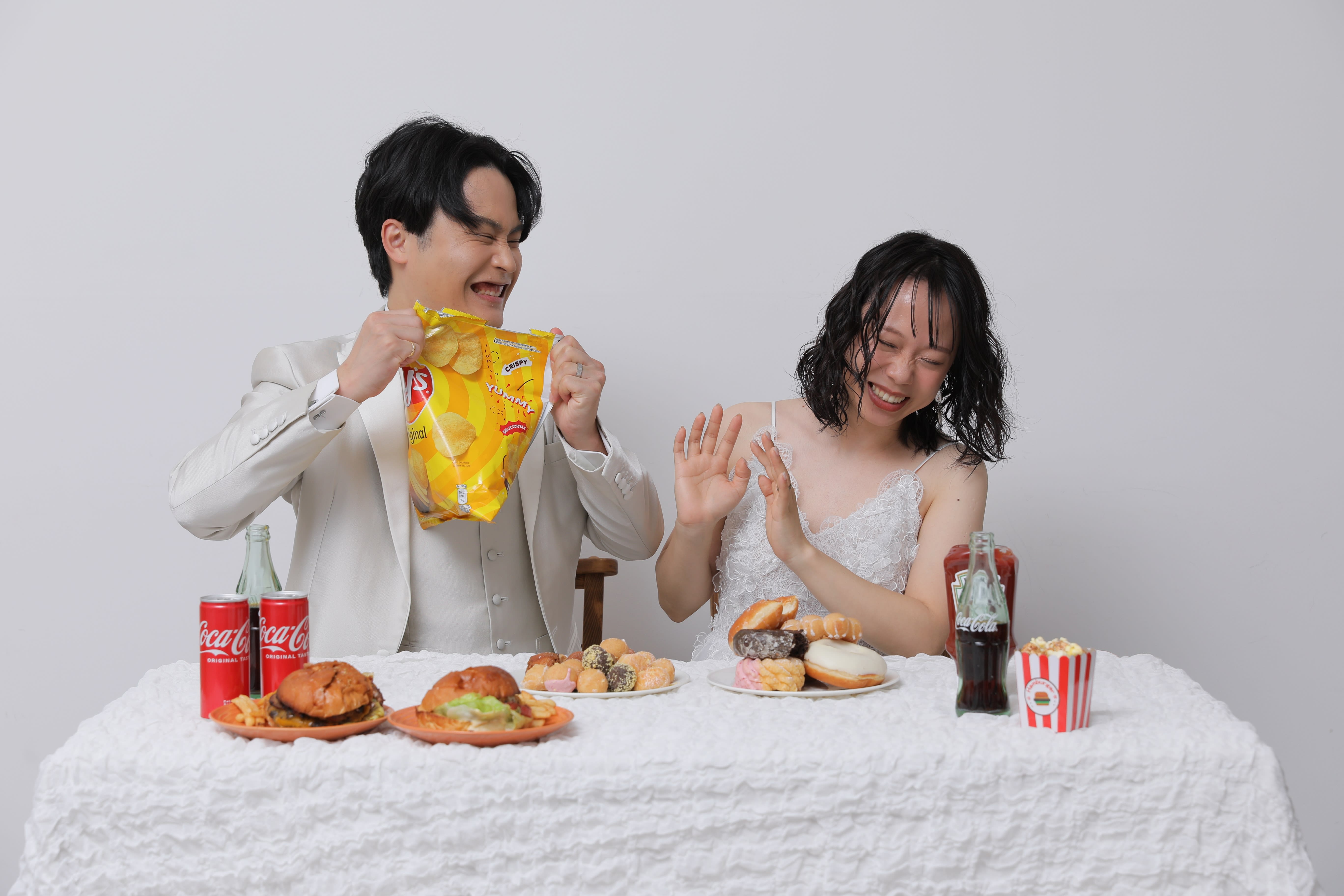 ウェディングフォトで食べ物と撮るのが夢だったお二人。 写真映えする食べ物をいっぱいお持ち込みいただきました!