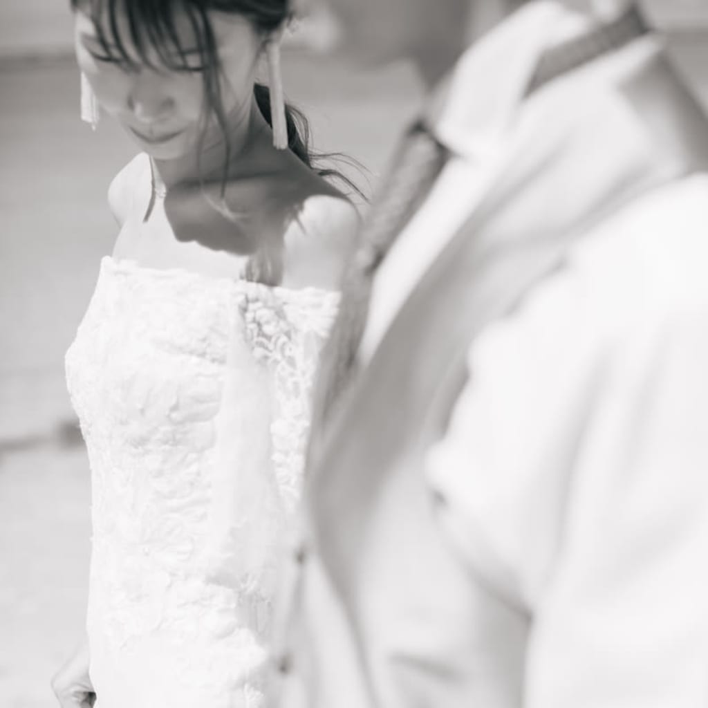 笑顔の新婦様と、海を眺める新郎様。カメラ目線の新婦様がお茶目です