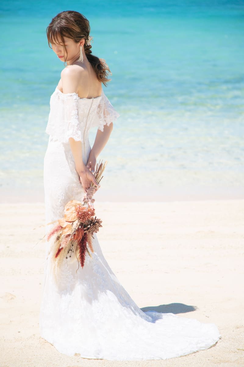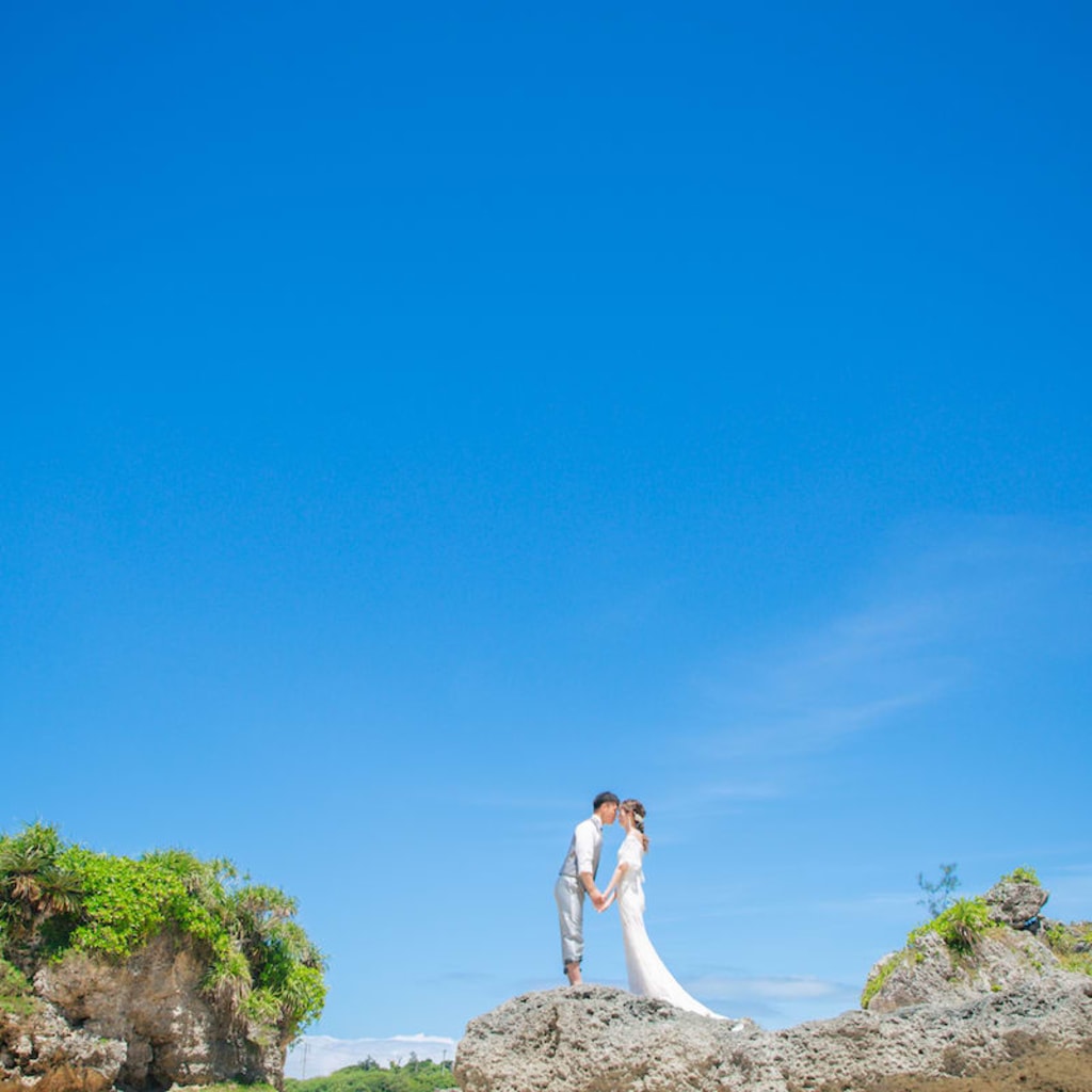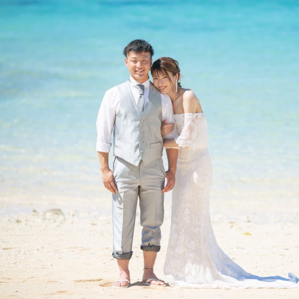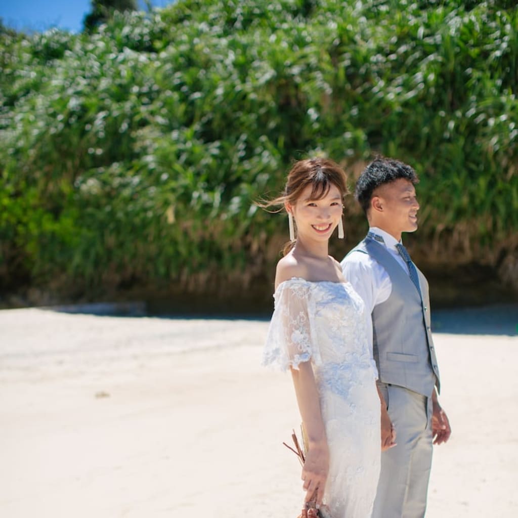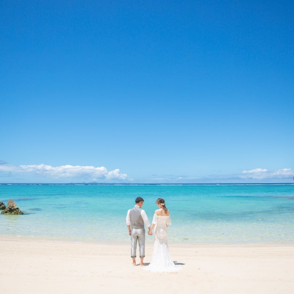 透き通る海をバックに。沖縄らしいウェディングフォトです