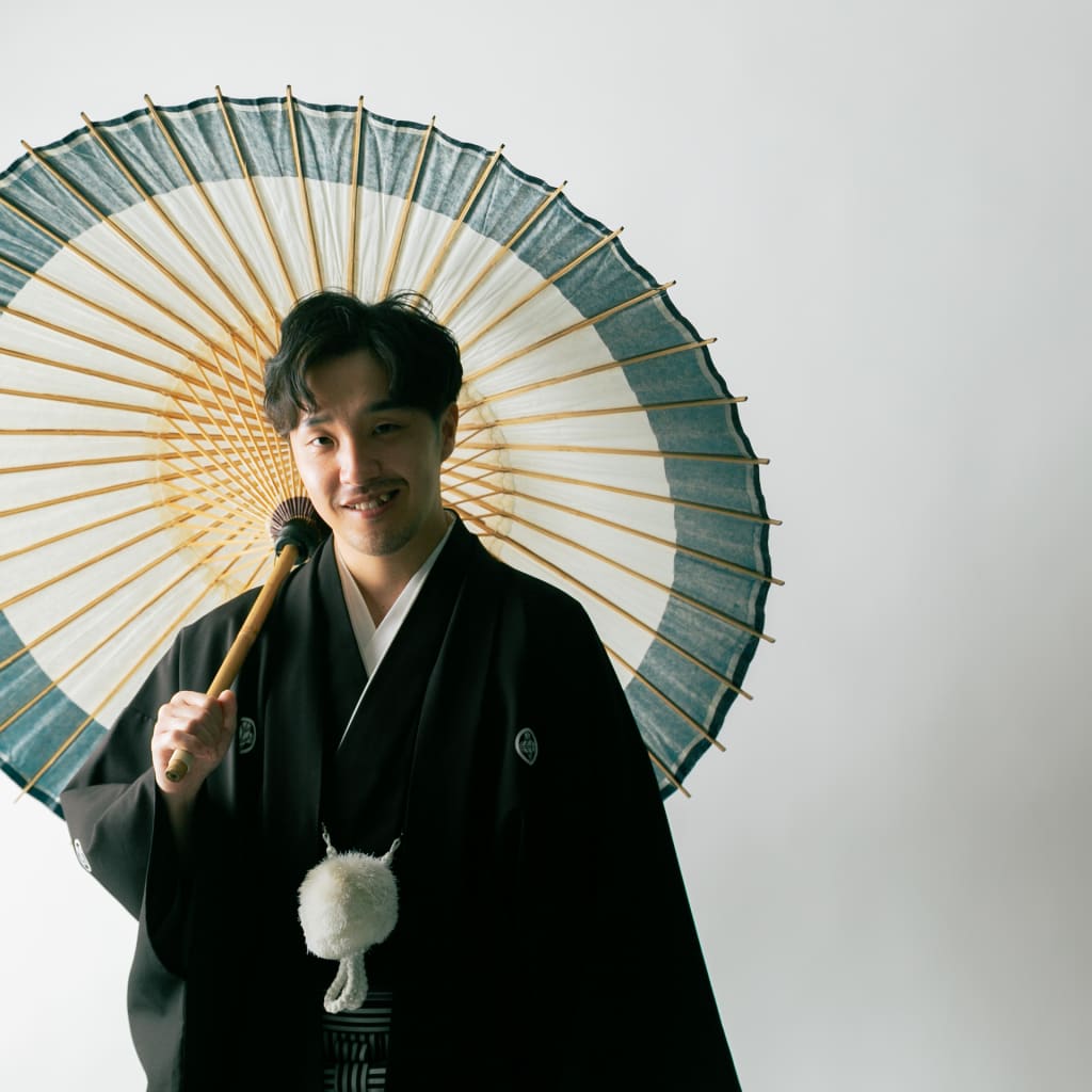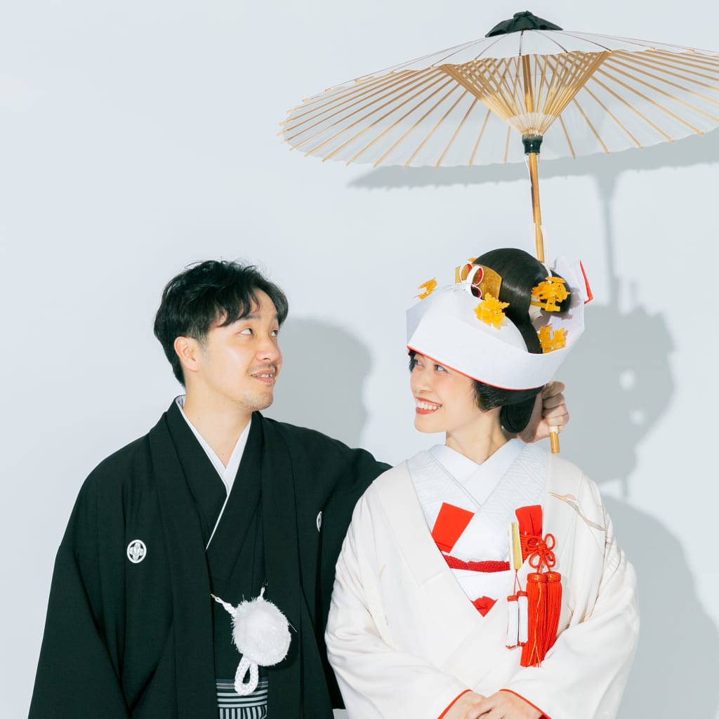 小物の和傘を使用しての1枚!お2人の笑顔がとても素敵です♡