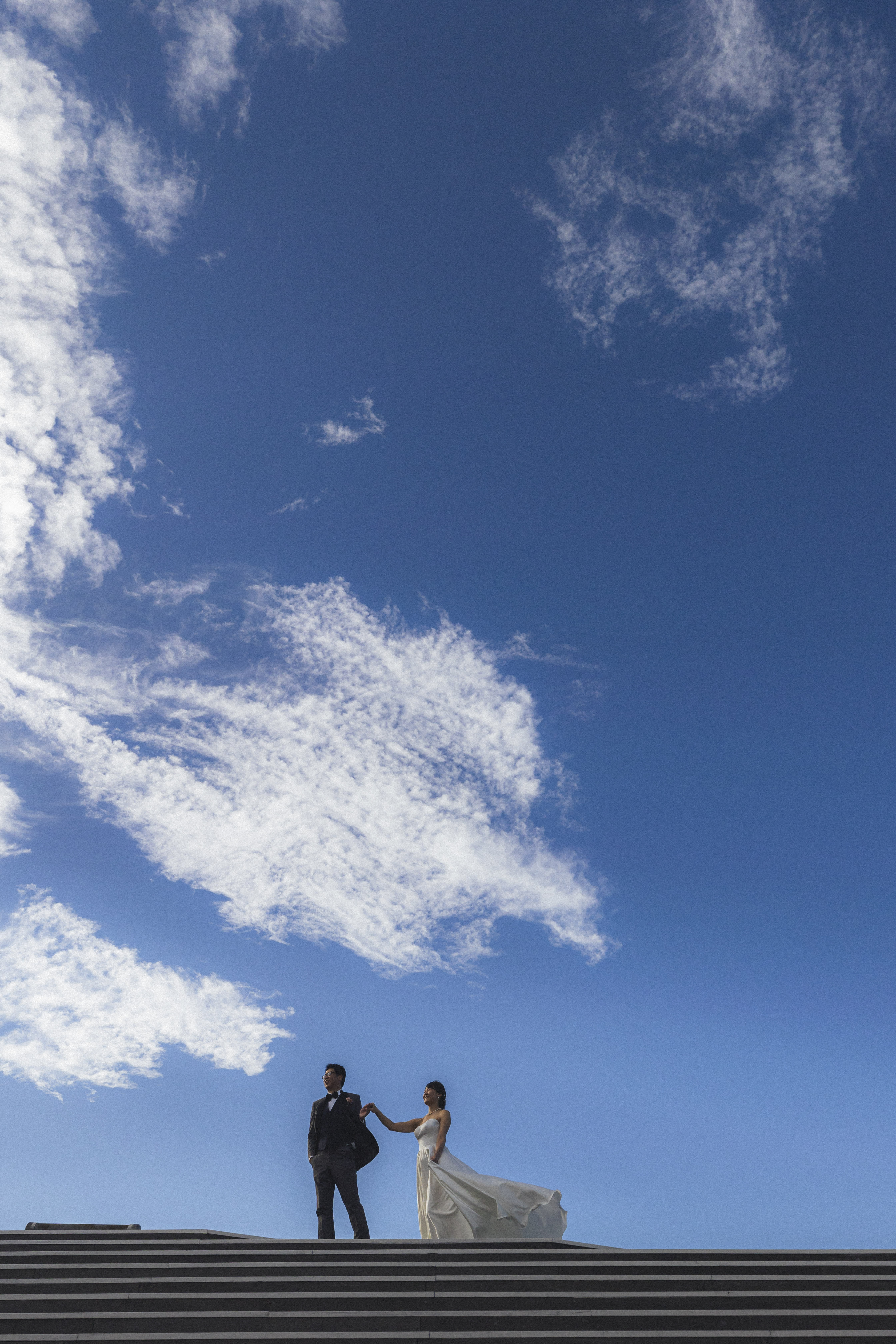 みなとみらいだけでなく空一面を背景にした写真も素敵です!お2人の表情や衣装に目が惹かれます。
