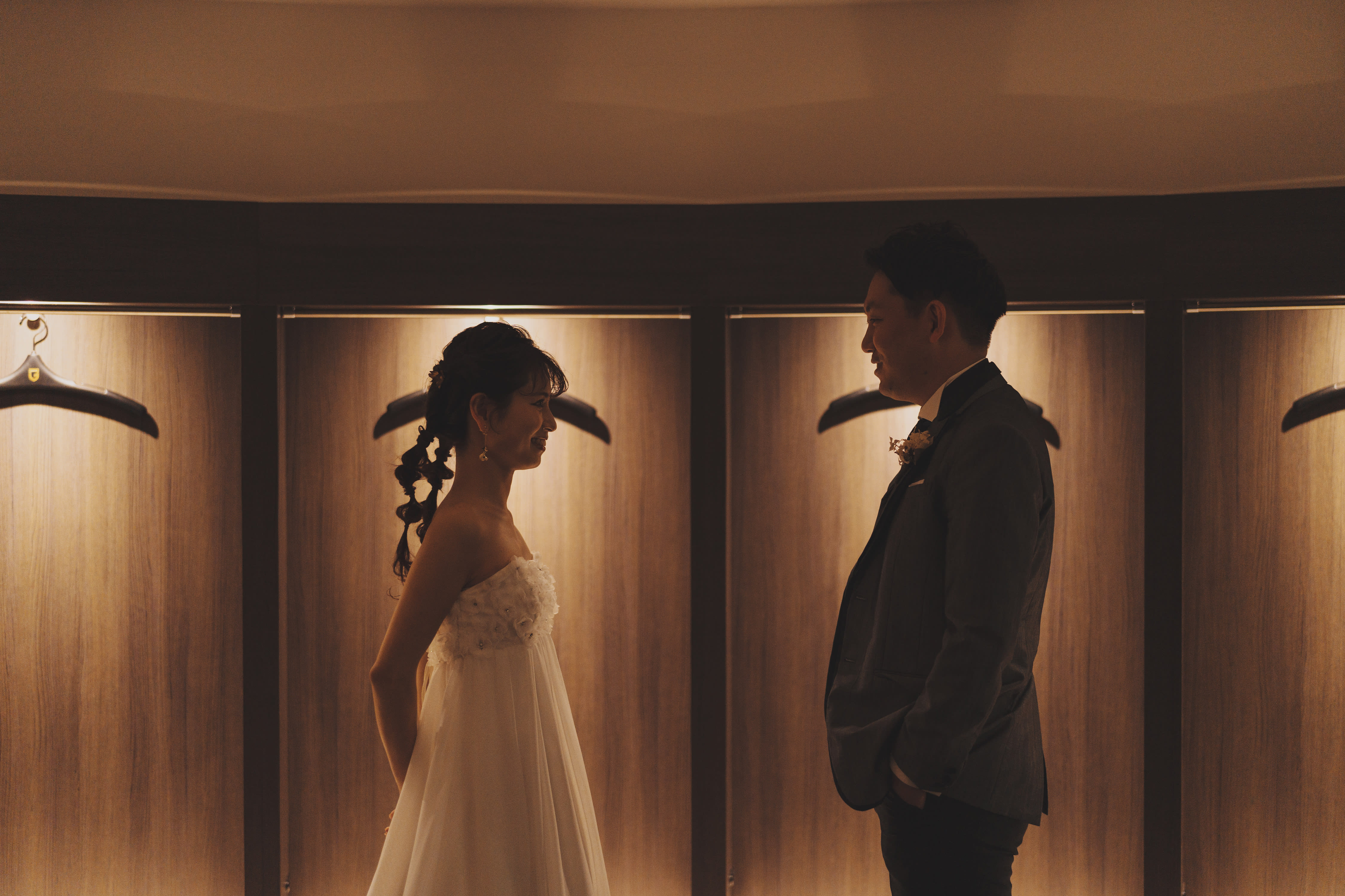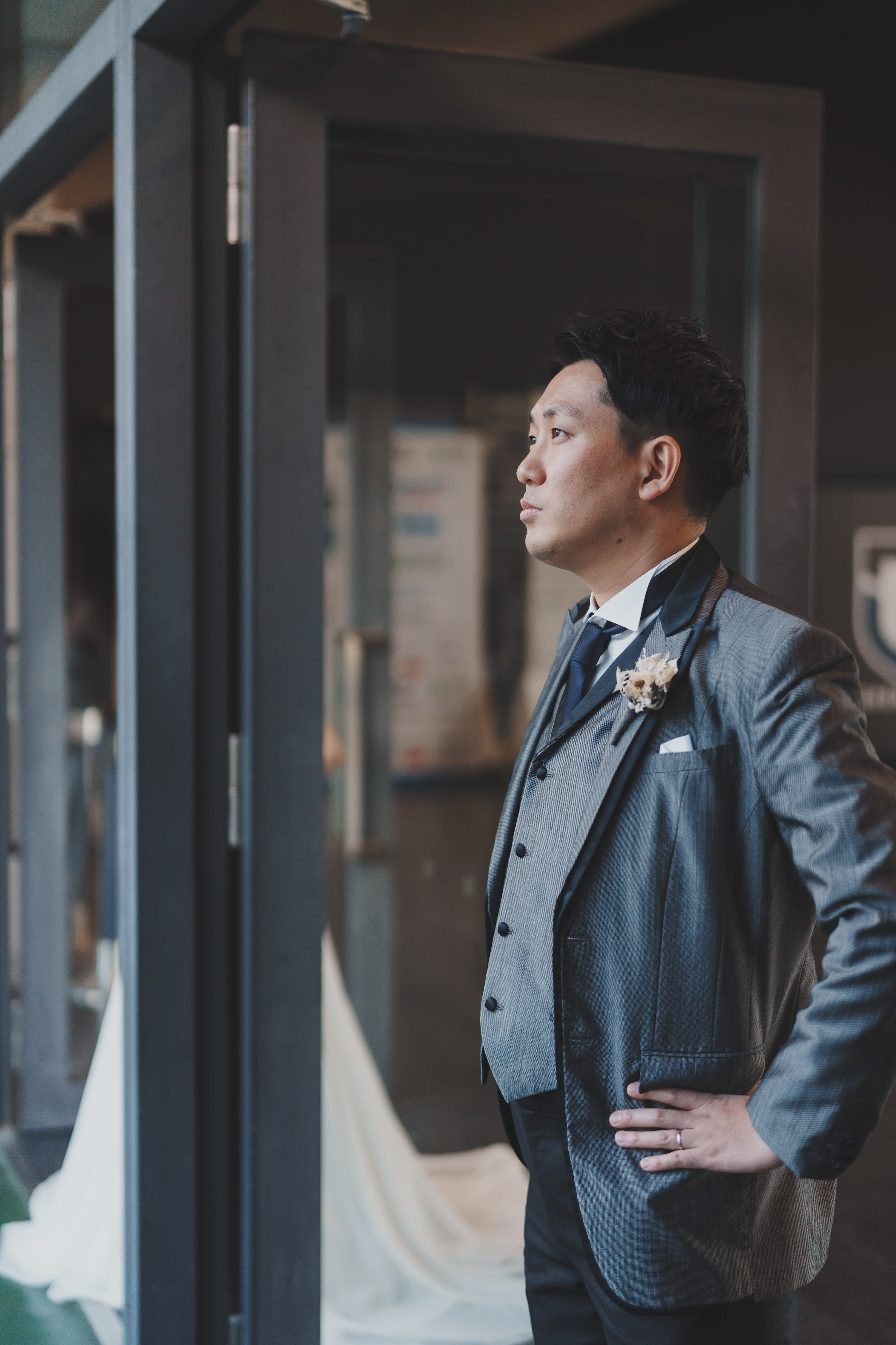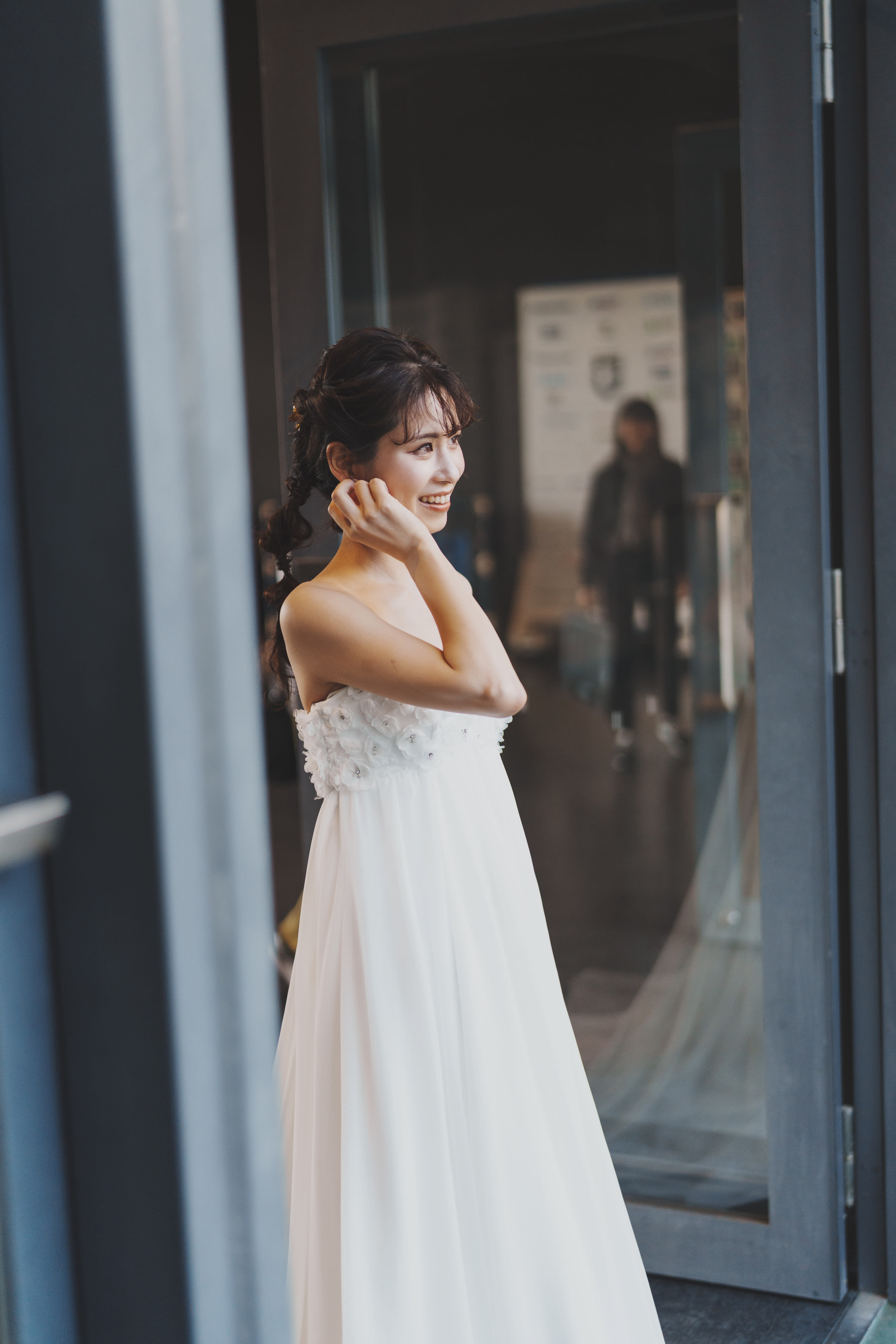 コンクリートの壁にドレス姿の新婦様、やわらかな日差し 不思議なあたたかさです