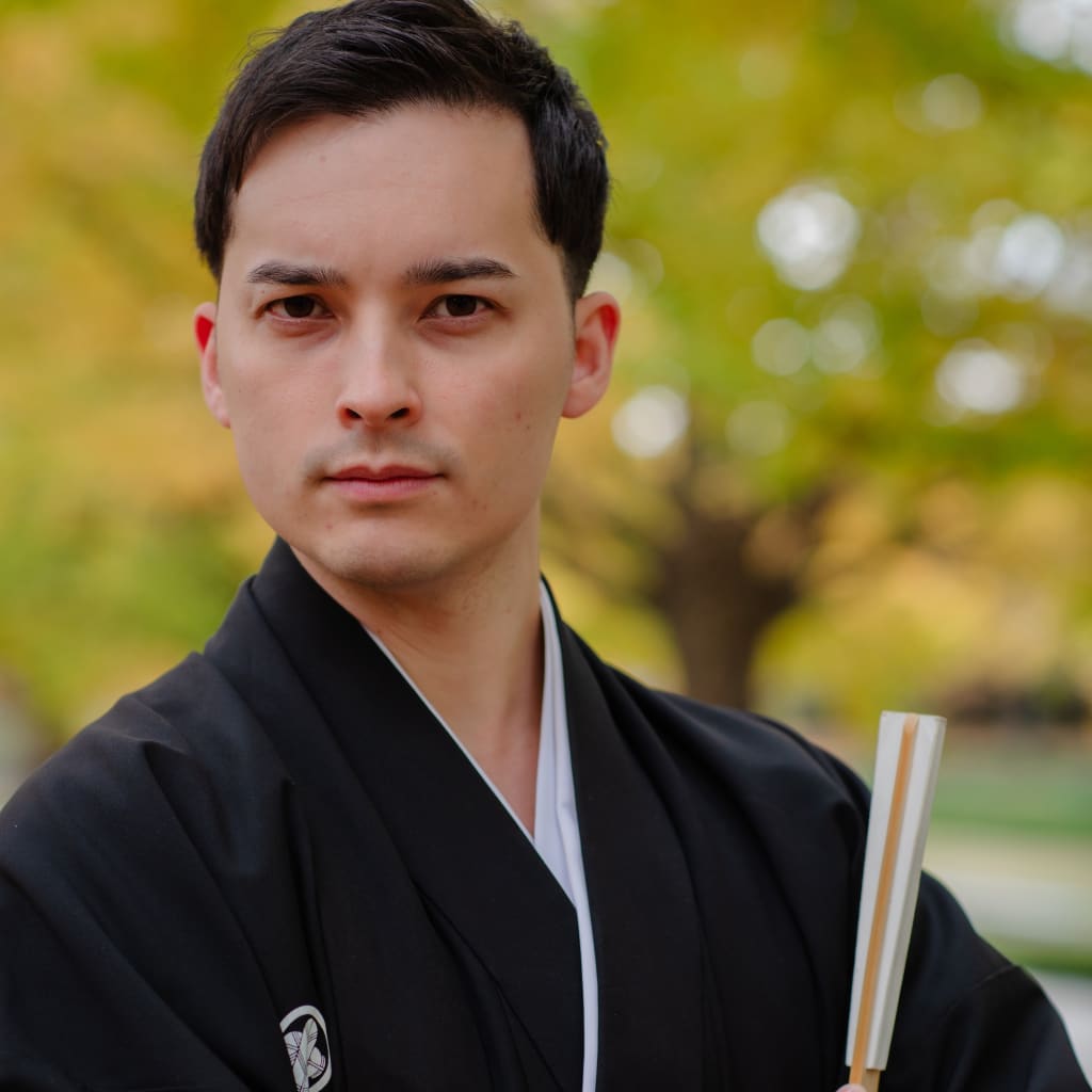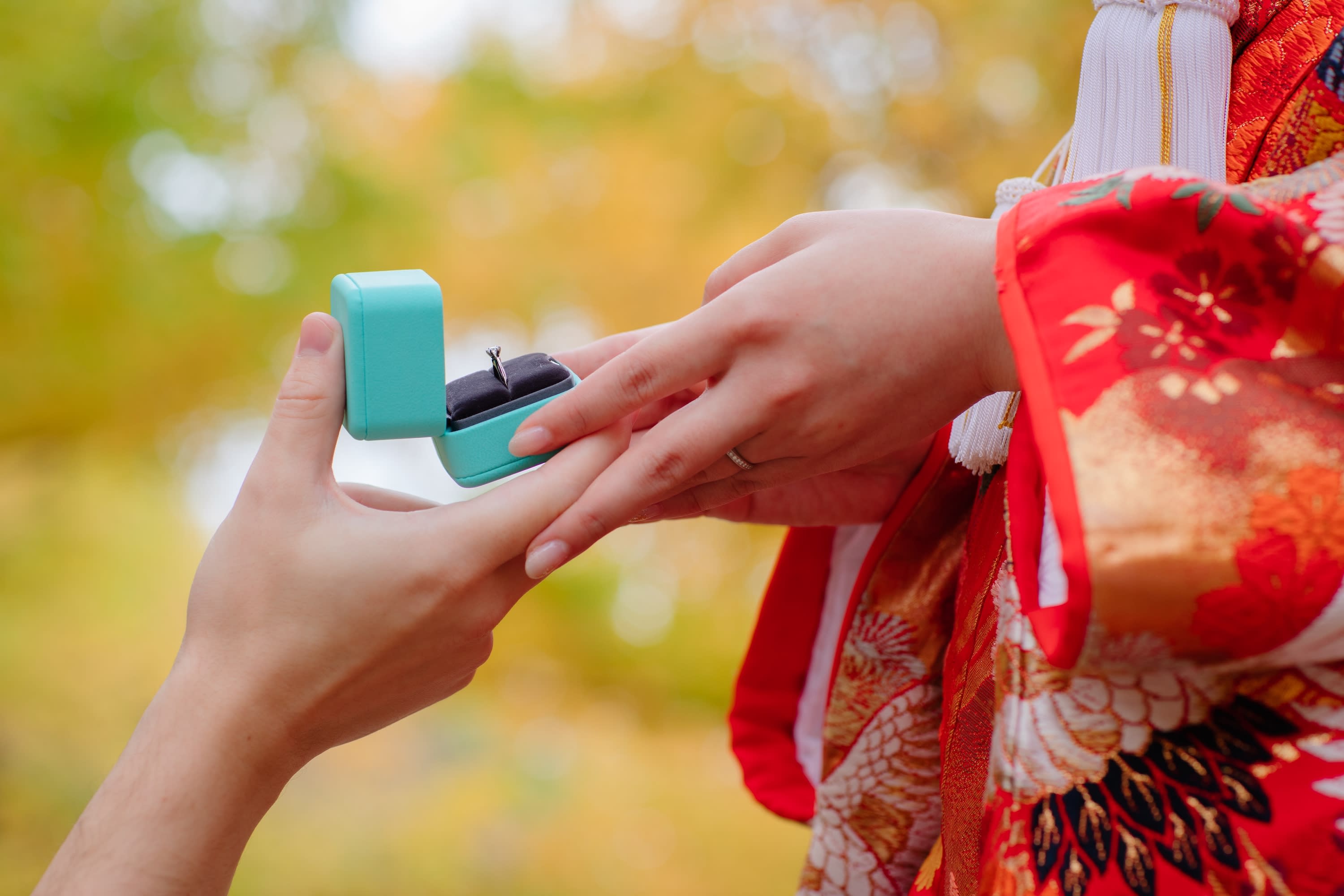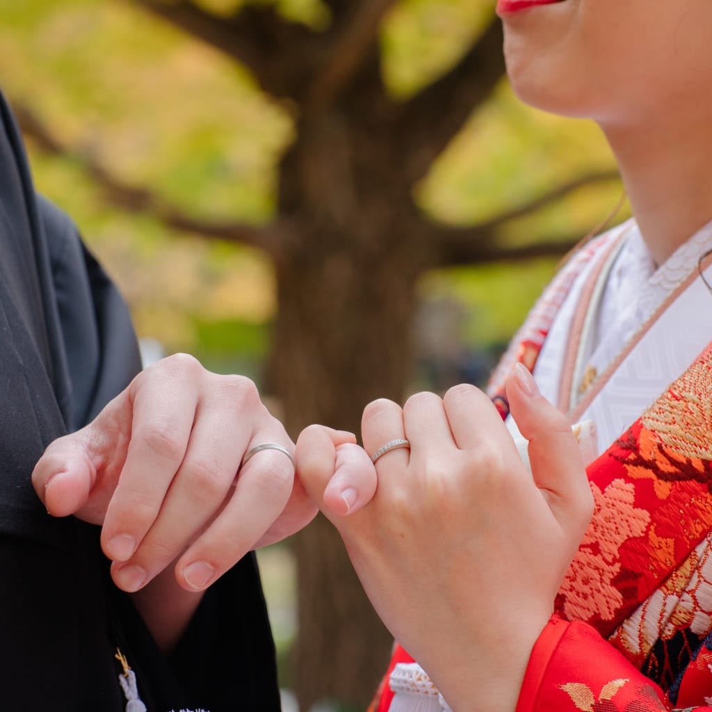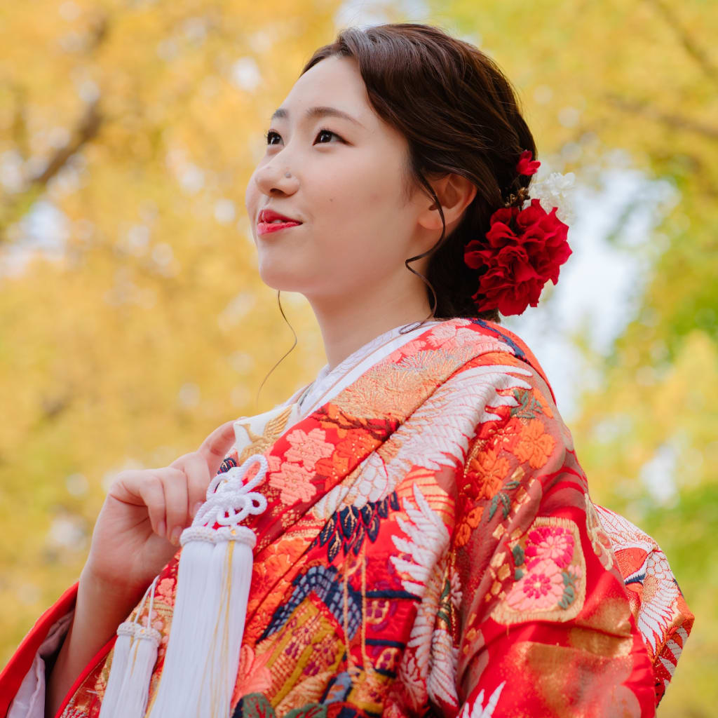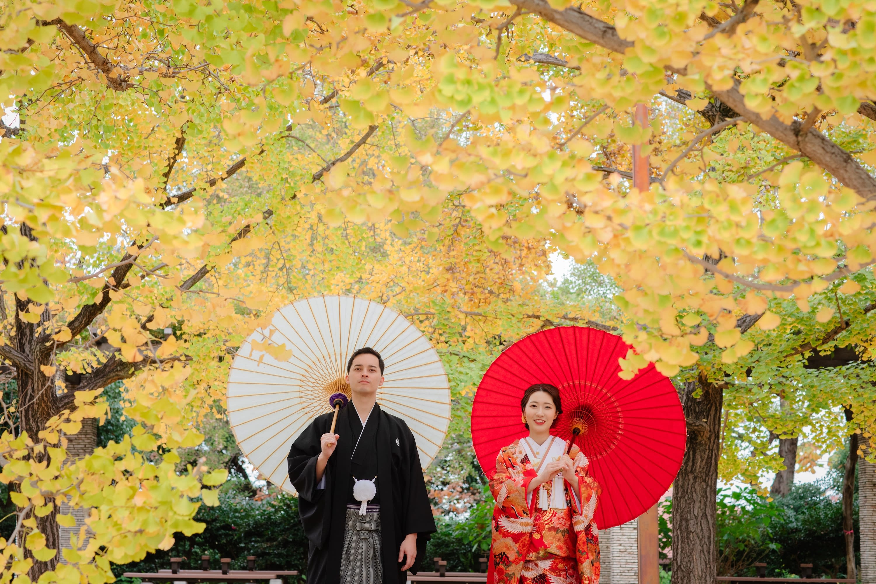 とっても素敵なお二人。黄色のイチョウに赤の置物がよく映えます。手つなぎショットも可愛いです。