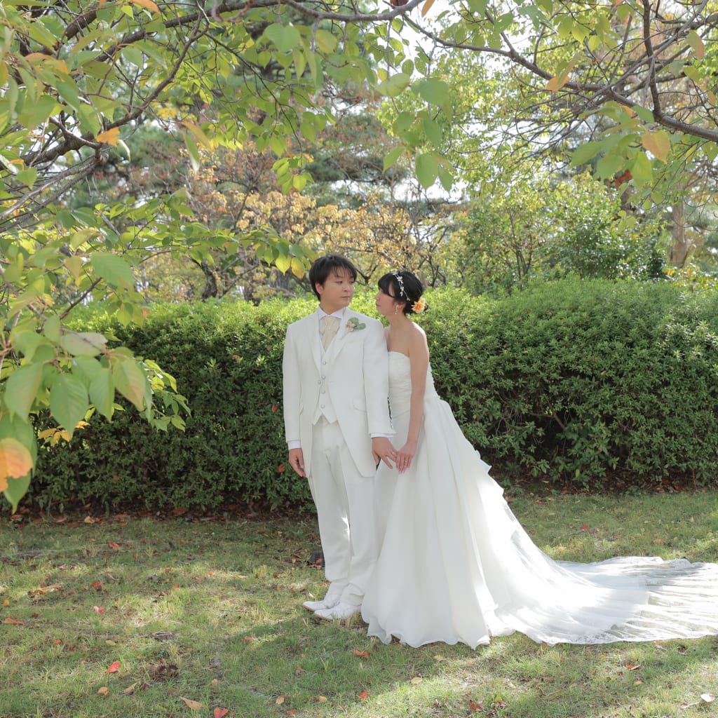青空と後ろ姿のおふたり。この日は暖かい日差しの中で撮影しました!