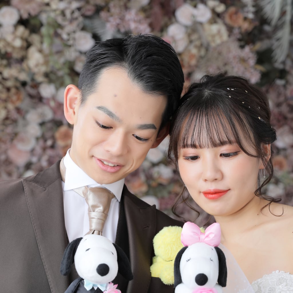 ウェディングの衣装のスヌーピー越しのお二人をお撮りしました!同じポーズなのもカワイイです!!