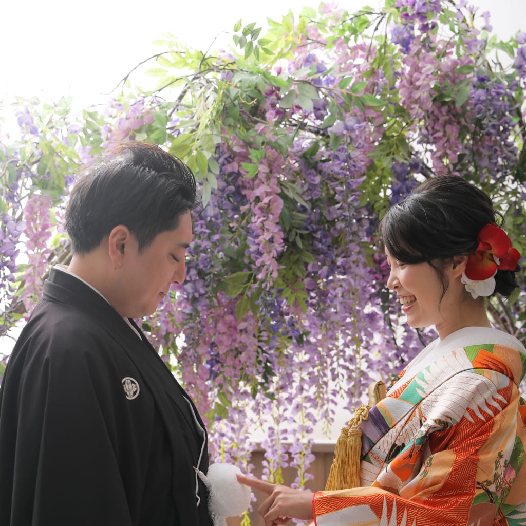 お次は和装洋装どちらも撮れるハウススタジオのご紹介! こちらは壁一面に淡い色味の花が散りばめられたフラワーウォール◎