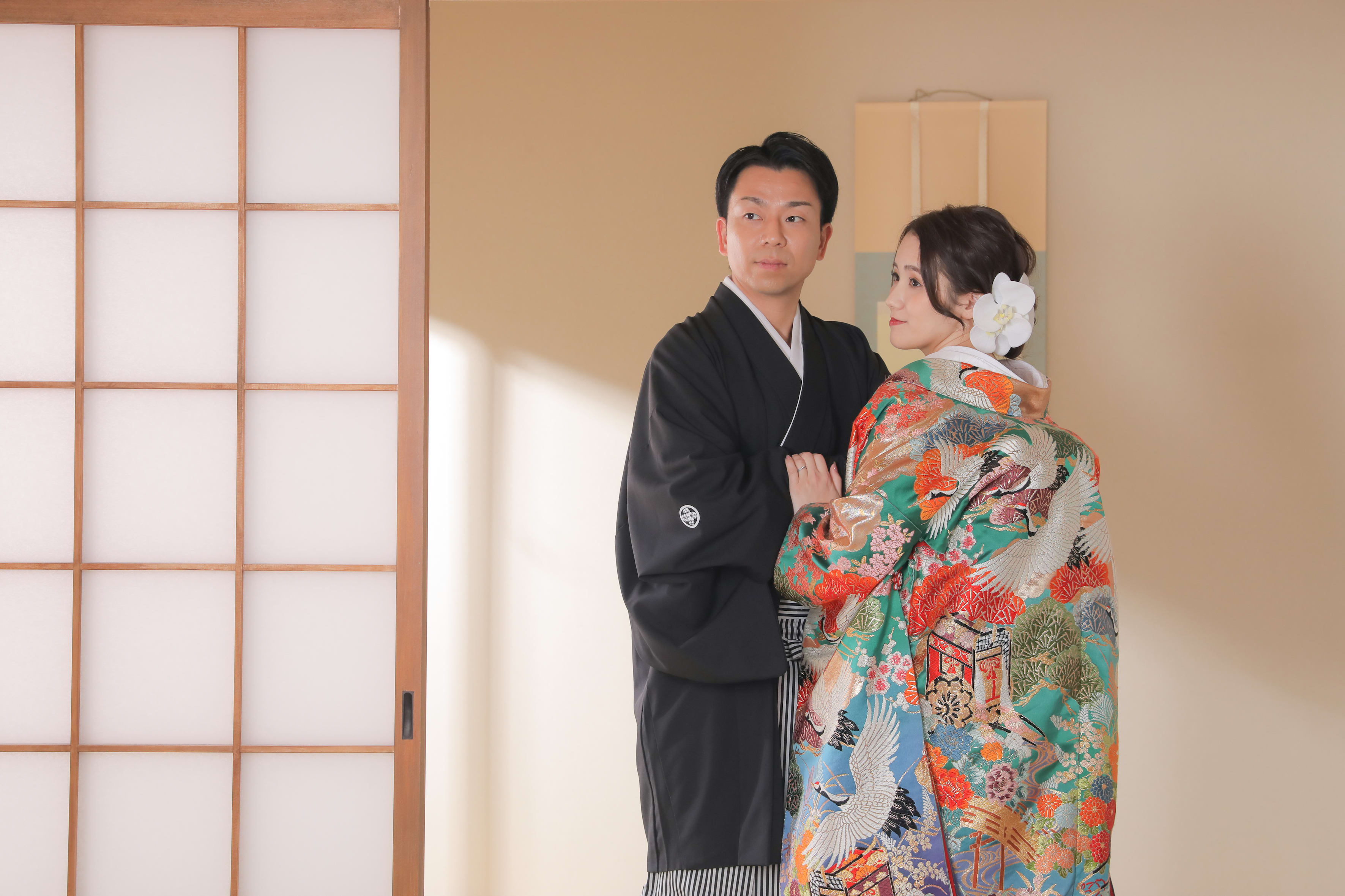 華やかなお衣装と和傘を持って撮影♪ お二人の素敵な笑顔、ありがとうございました♡