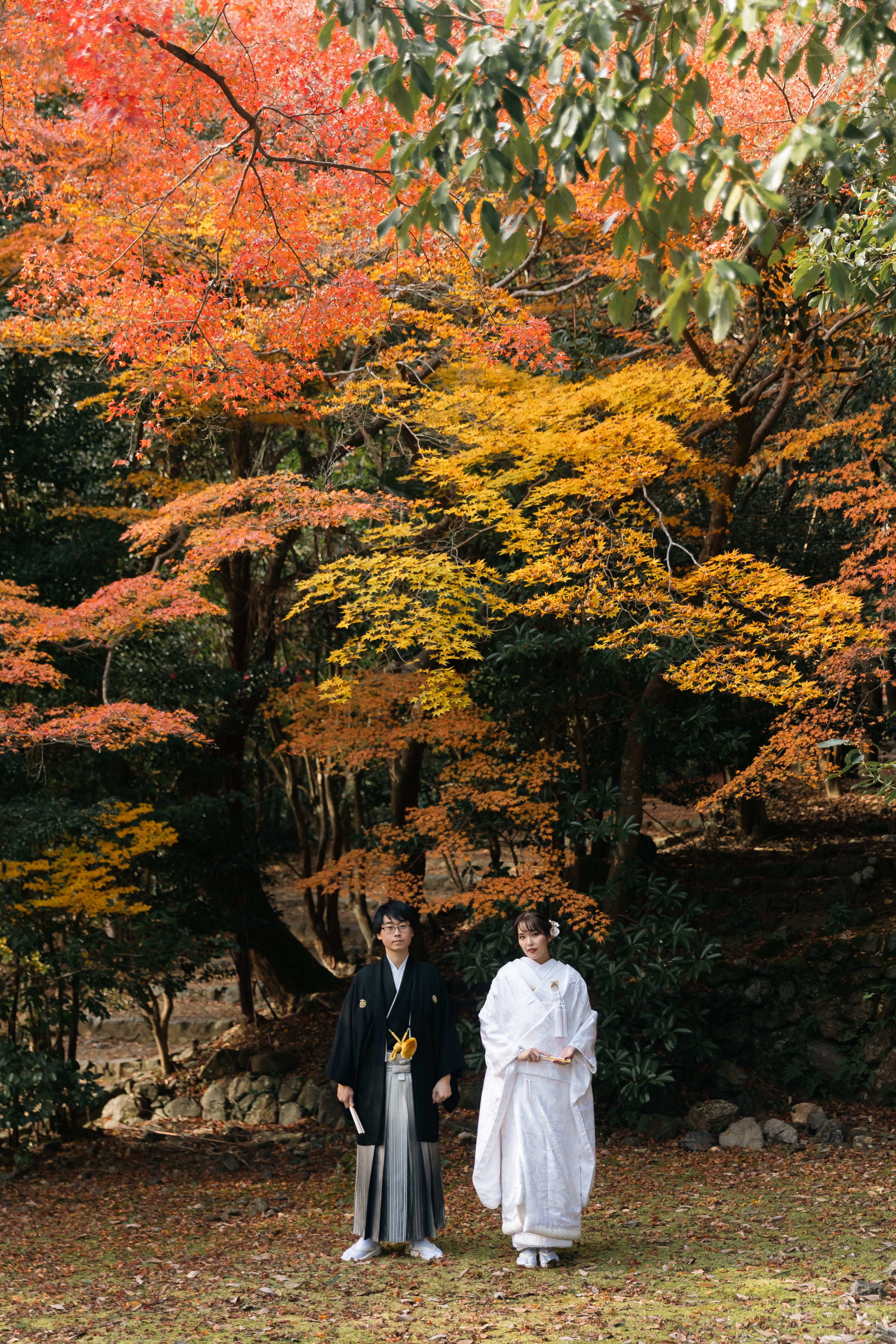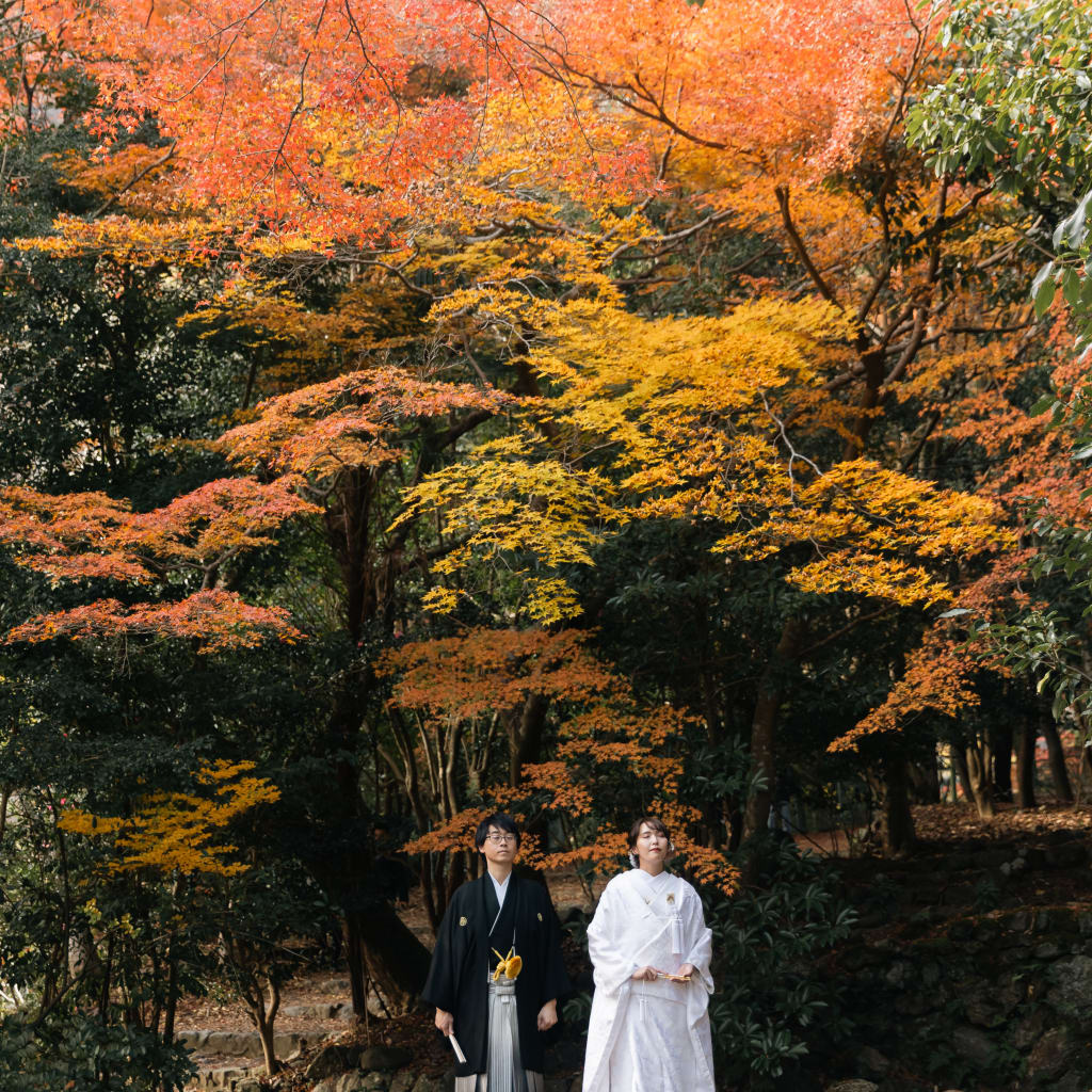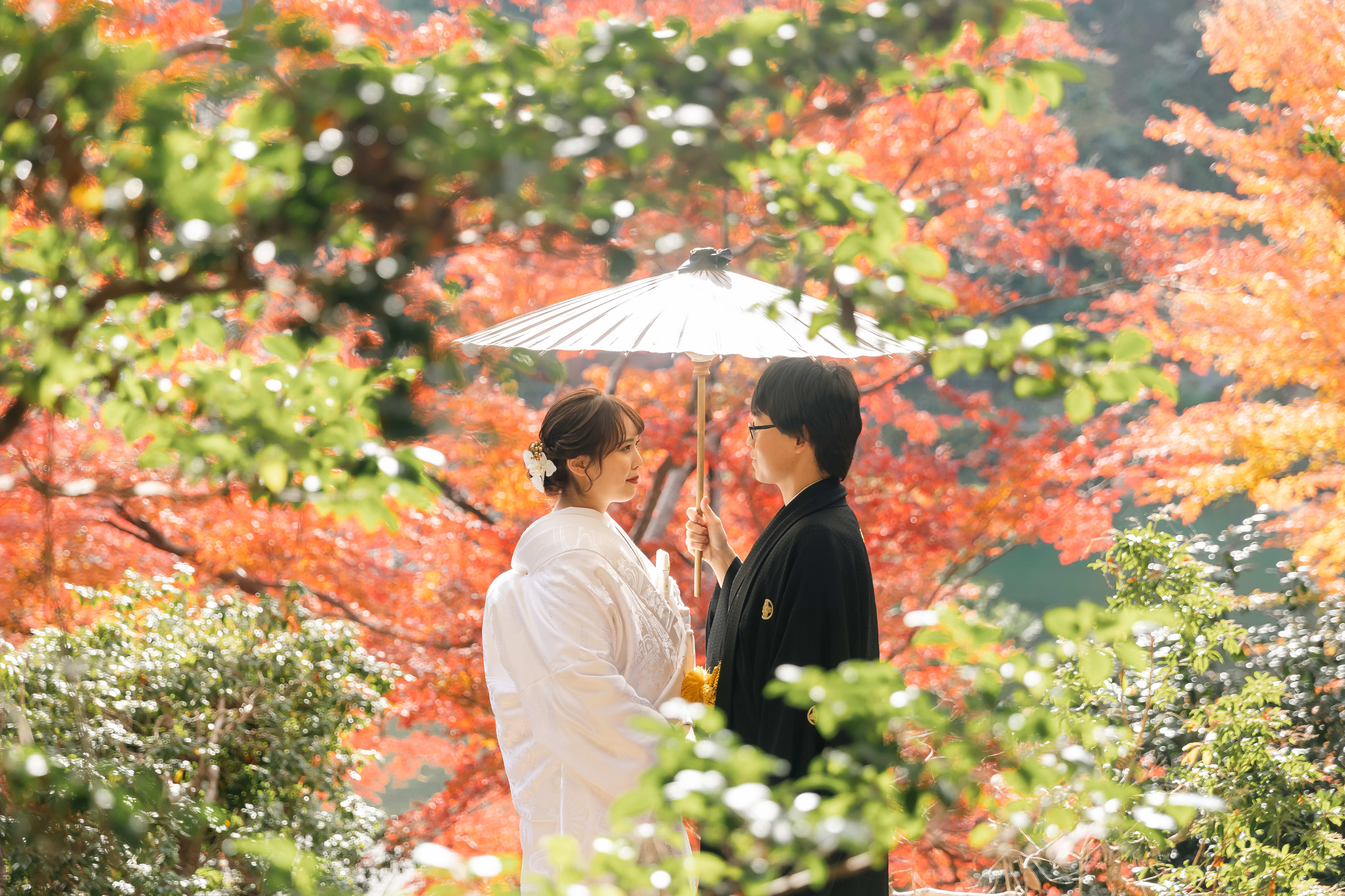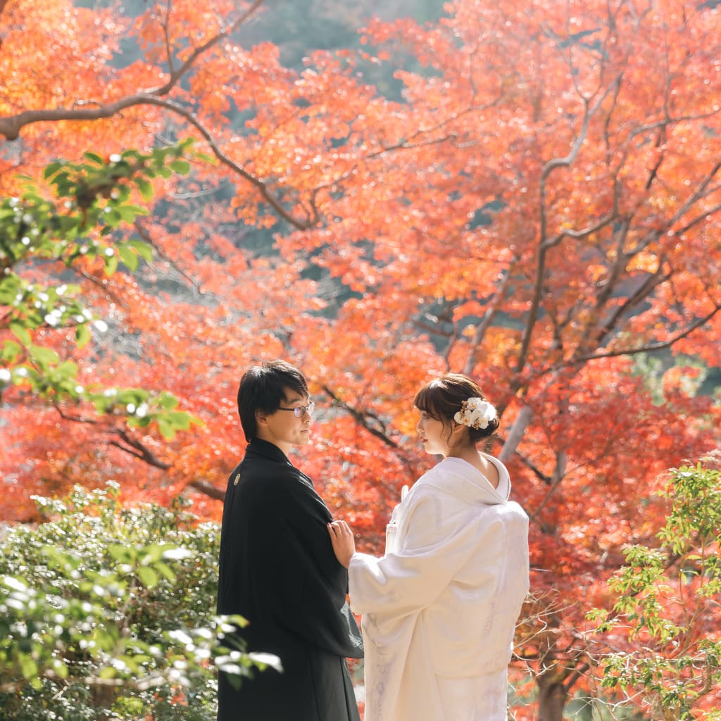 緑と赤のコントラストが美しい中に白無垢が映えます♡
