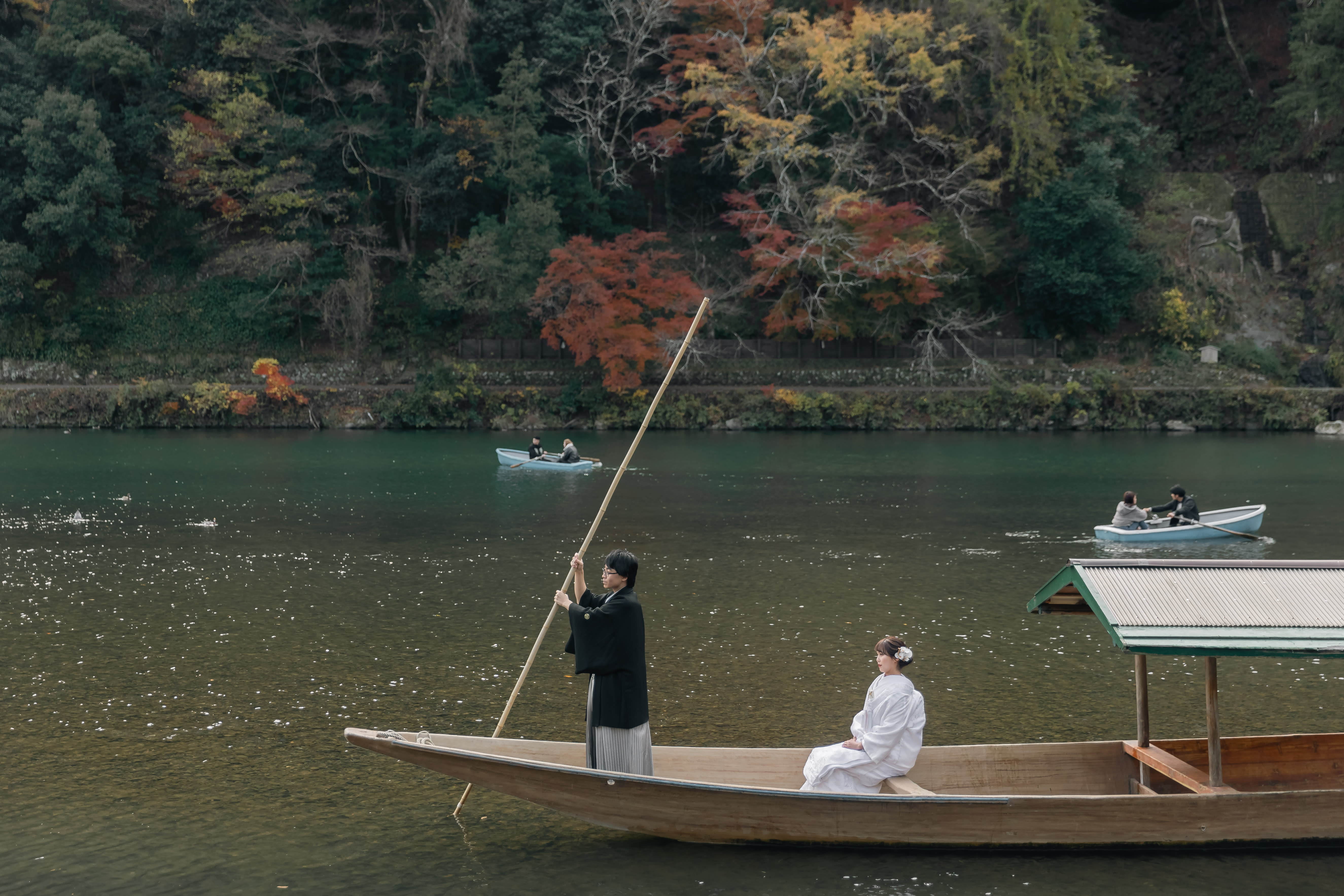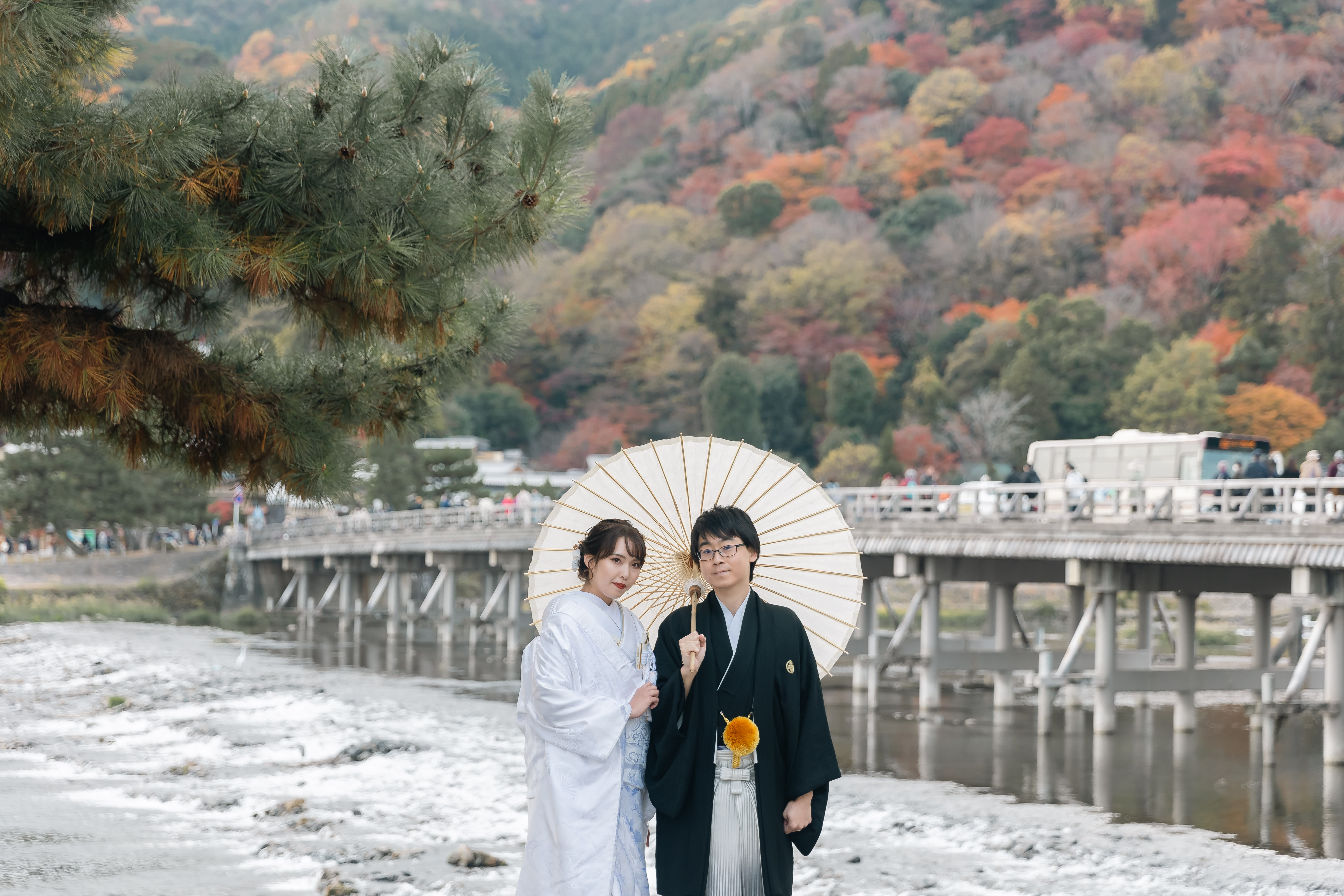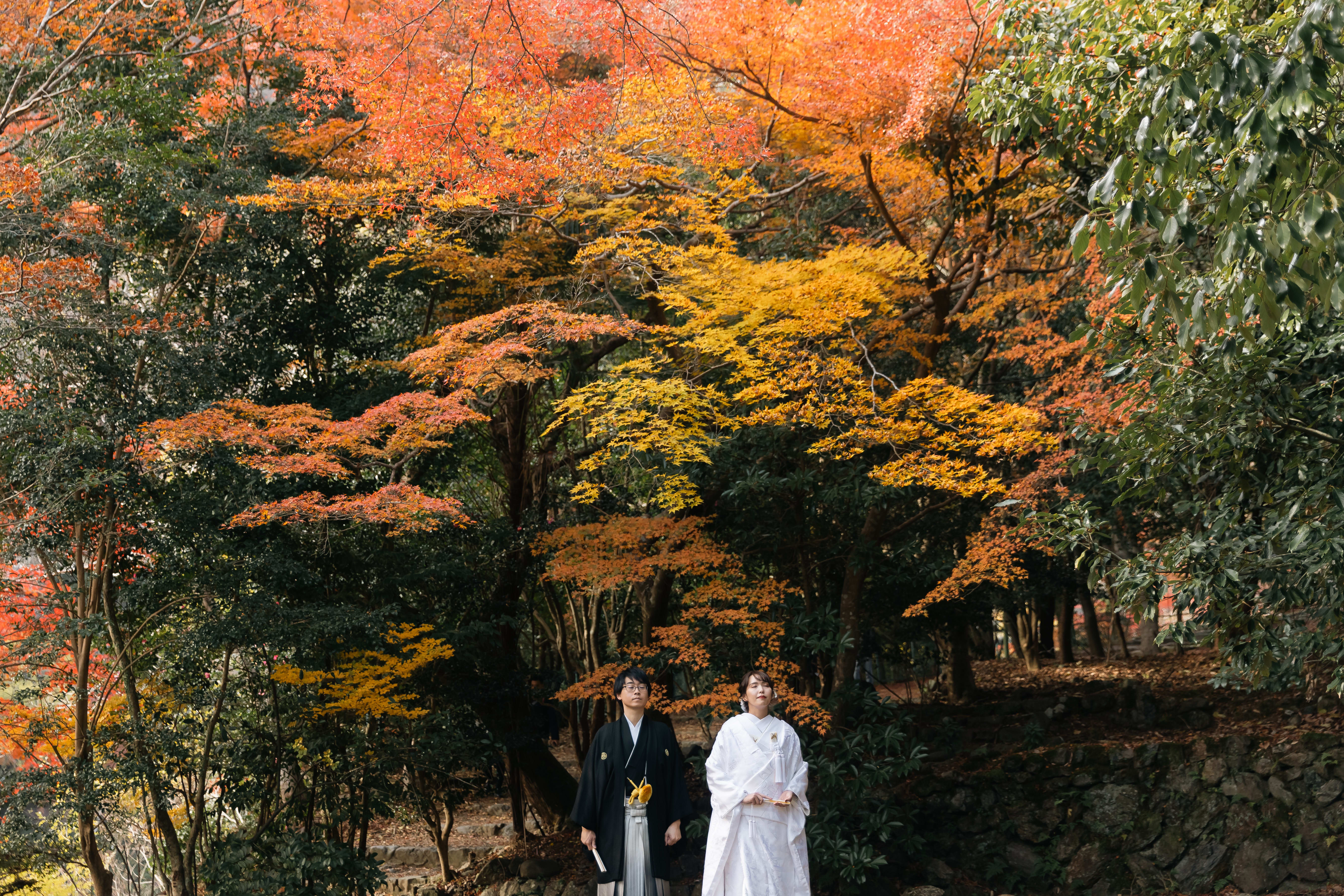 緑と赤のコントラストが美しい中に白無垢が映えます♡