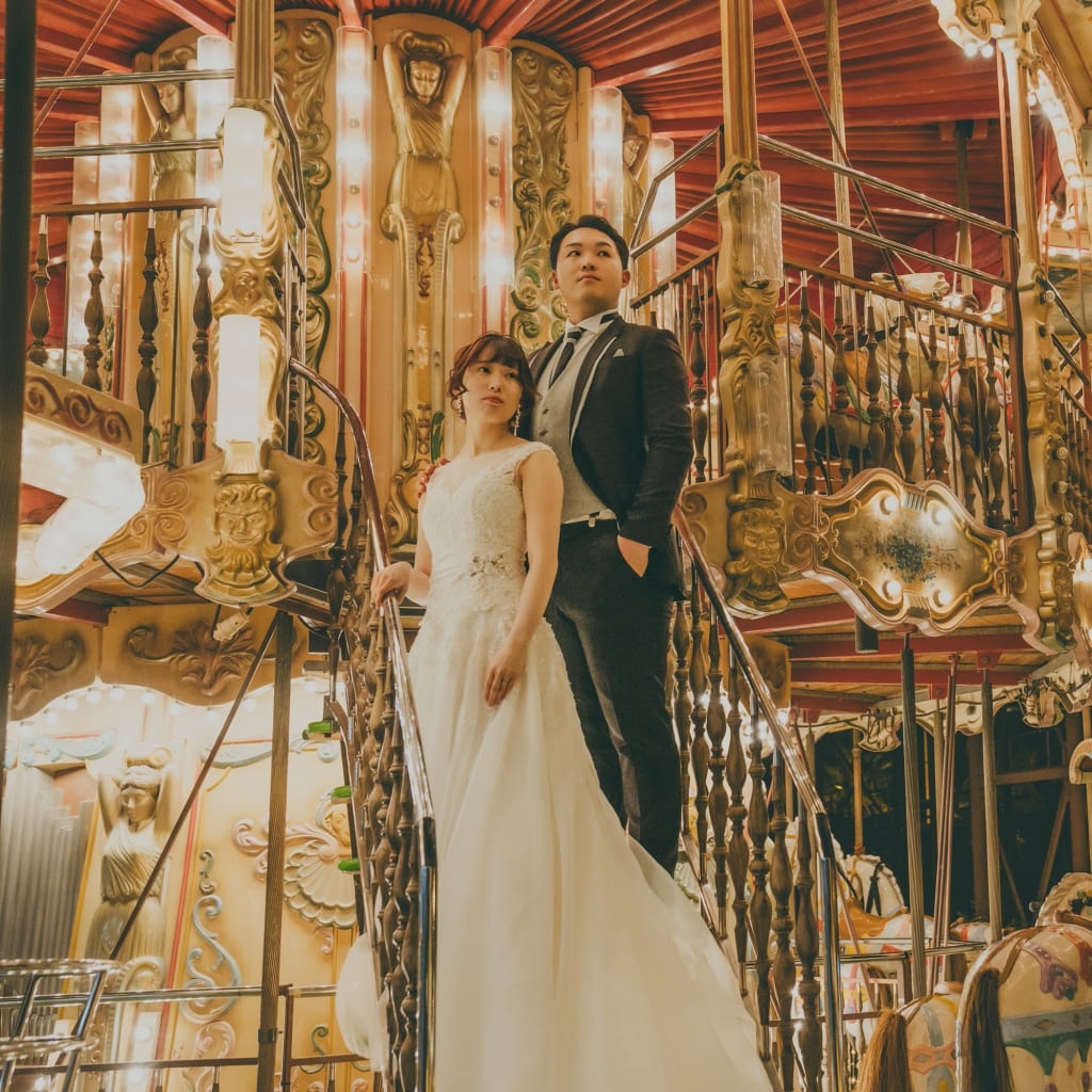 遊園地で前撮り写真