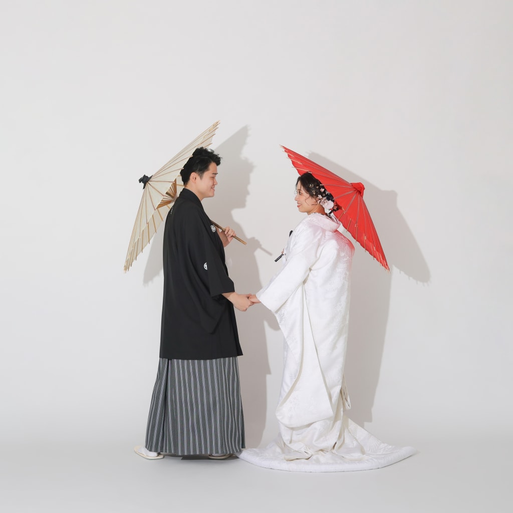 シンプルな背景に和傘が映えます。後ろ姿も数枚あると何かと便利でおすすめです。