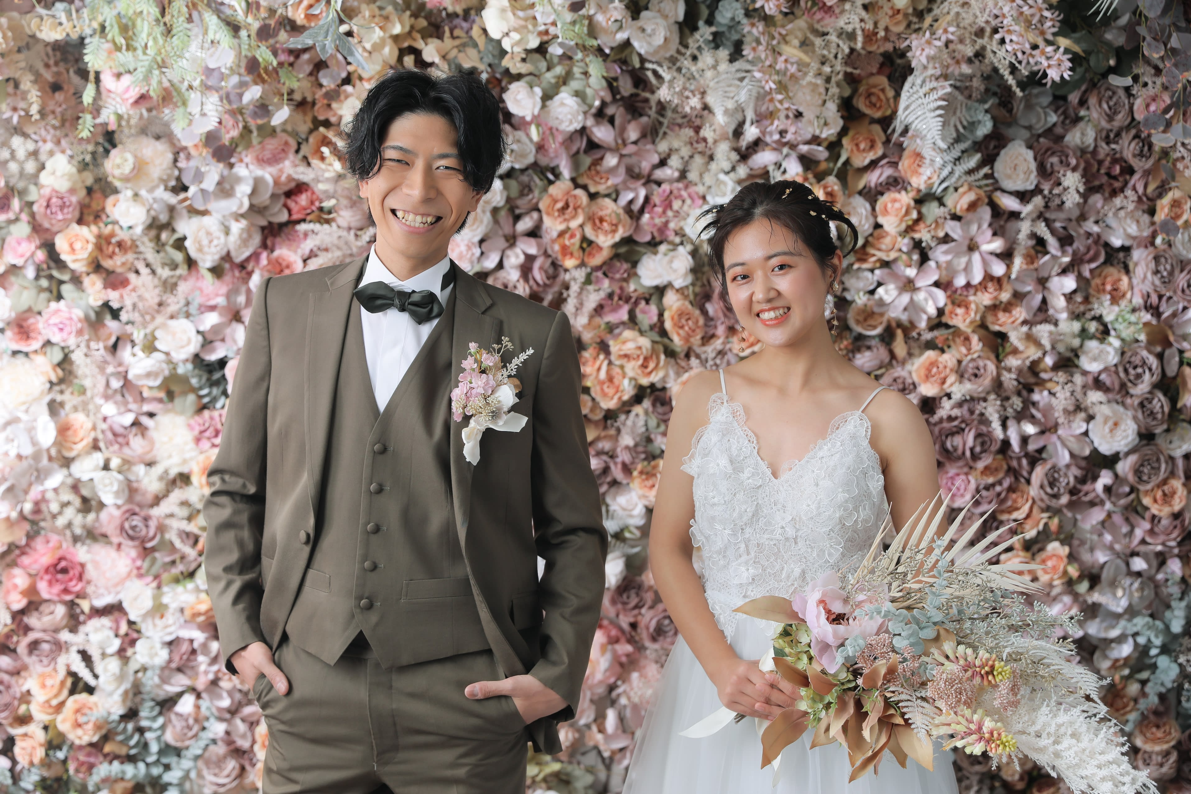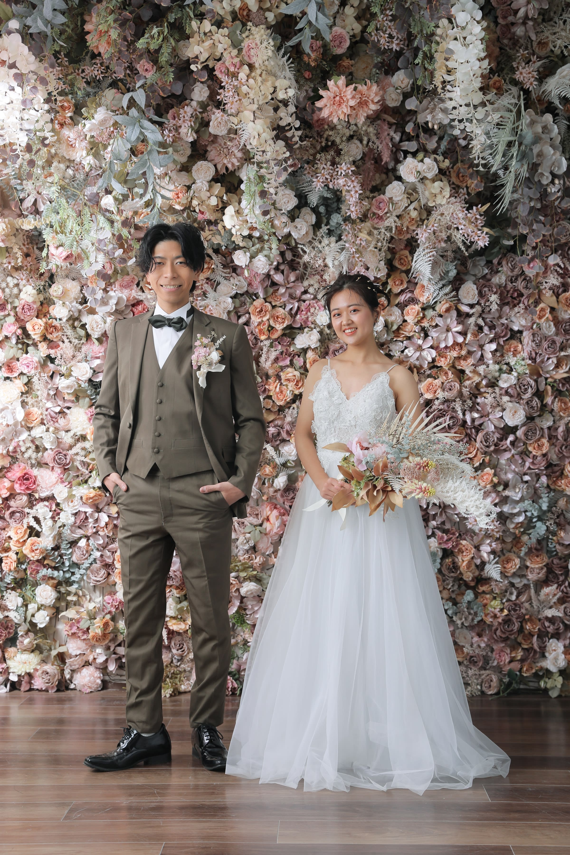 お次は背景を変えて洋装の撮影スタートです! フラワーウォールは一面に淡い花が散りばめられています!