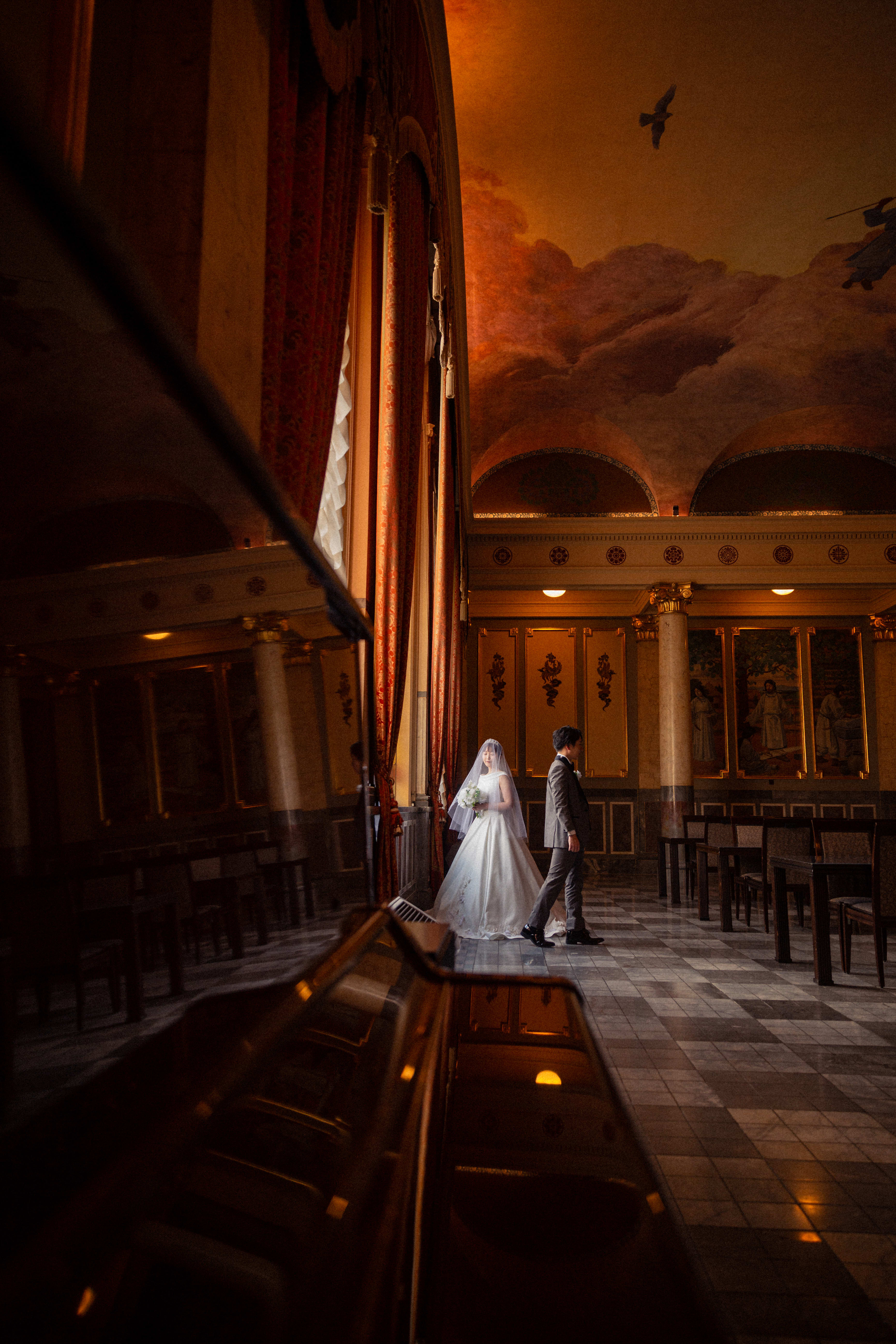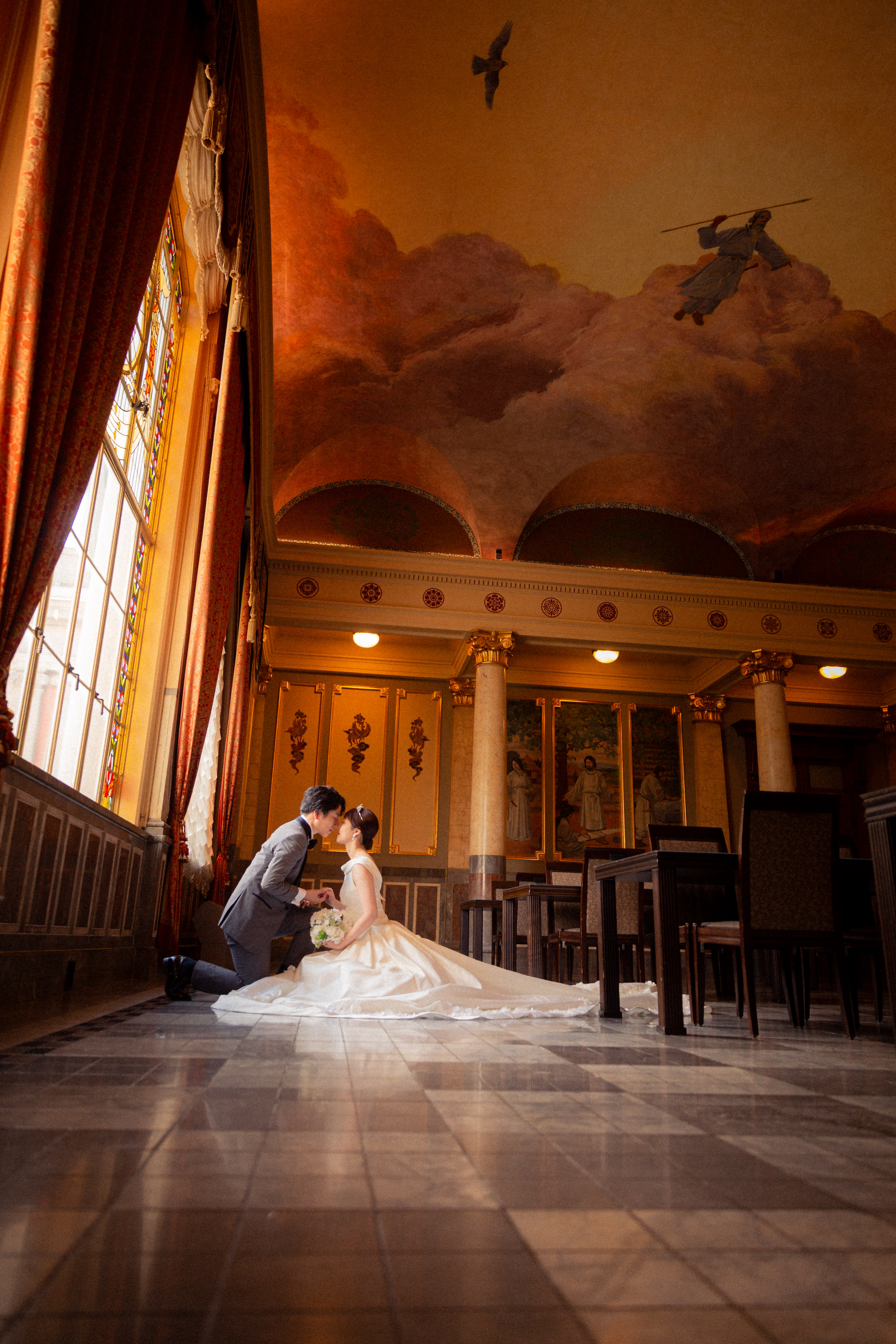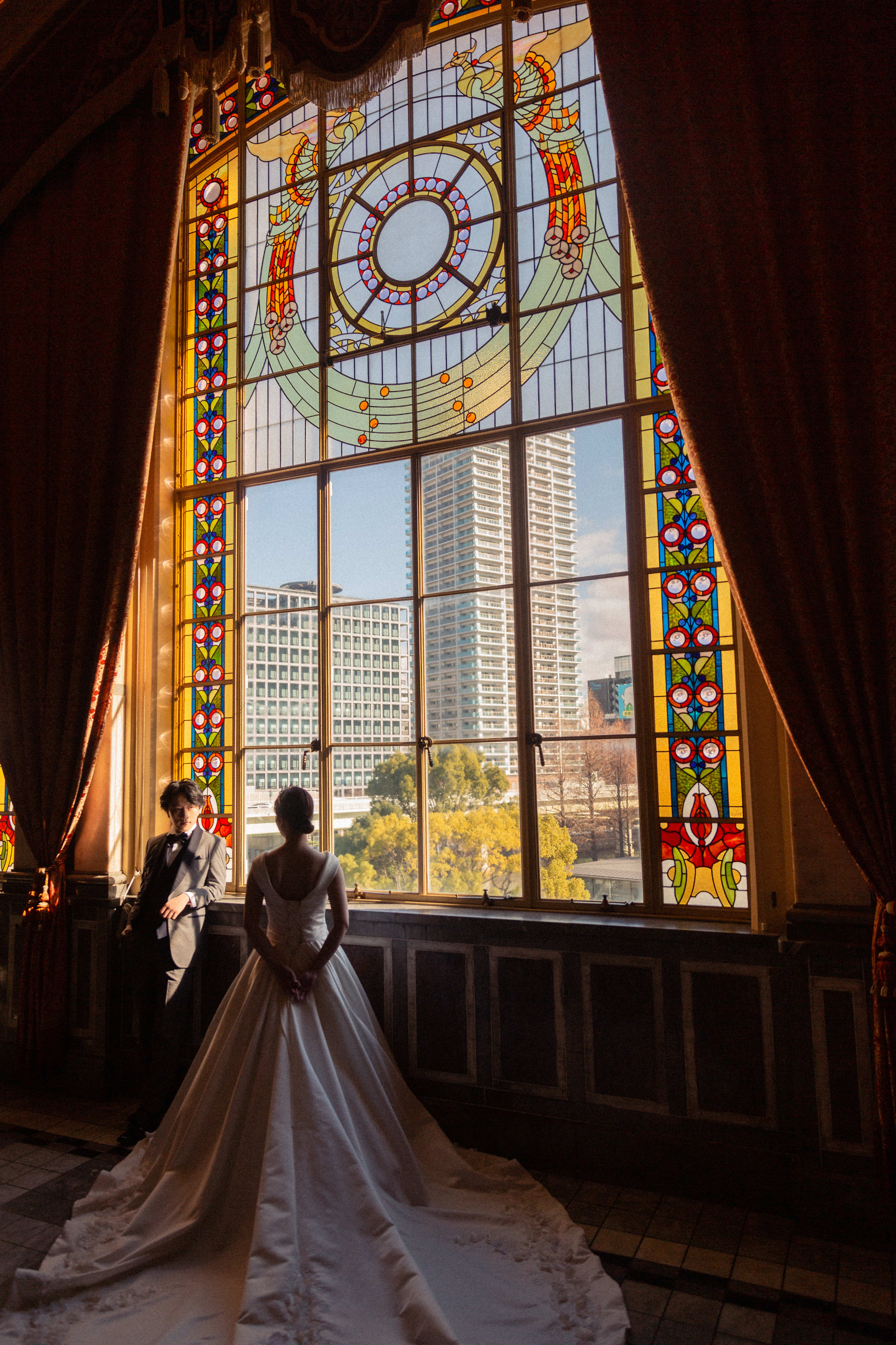 窓一面のステンドグラスや、ヨーロッパ宮殿を思わせる意匠の建物