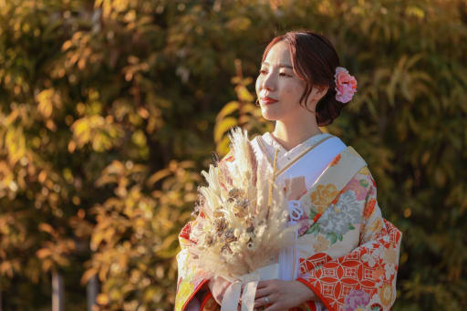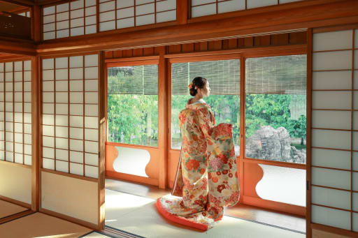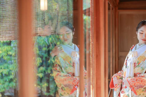 佇む新婦様の後ろ姿が雰囲気あってとっても素敵です。着物は後ろも主役と言われています。