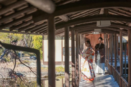 指輪をつけた手を触れ合って。しっとり和装らしい情緒のある写真も残します!