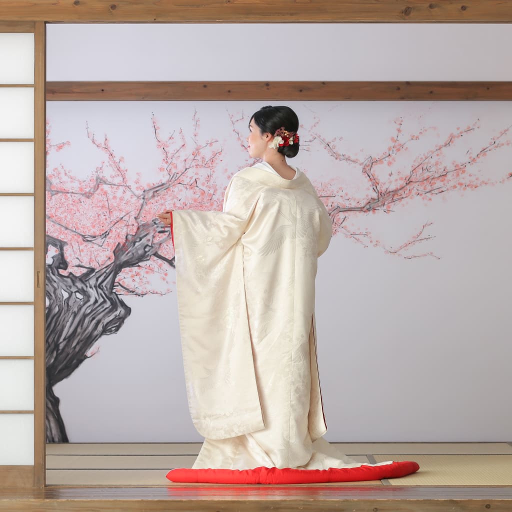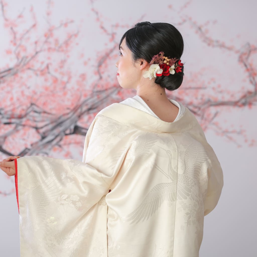 同じポージングのまま、表情やヘアセットもまとめて1枚に!ご新婦様本人からは見れない背中側には、一羽の大きな鶴が飛んでいます♪
