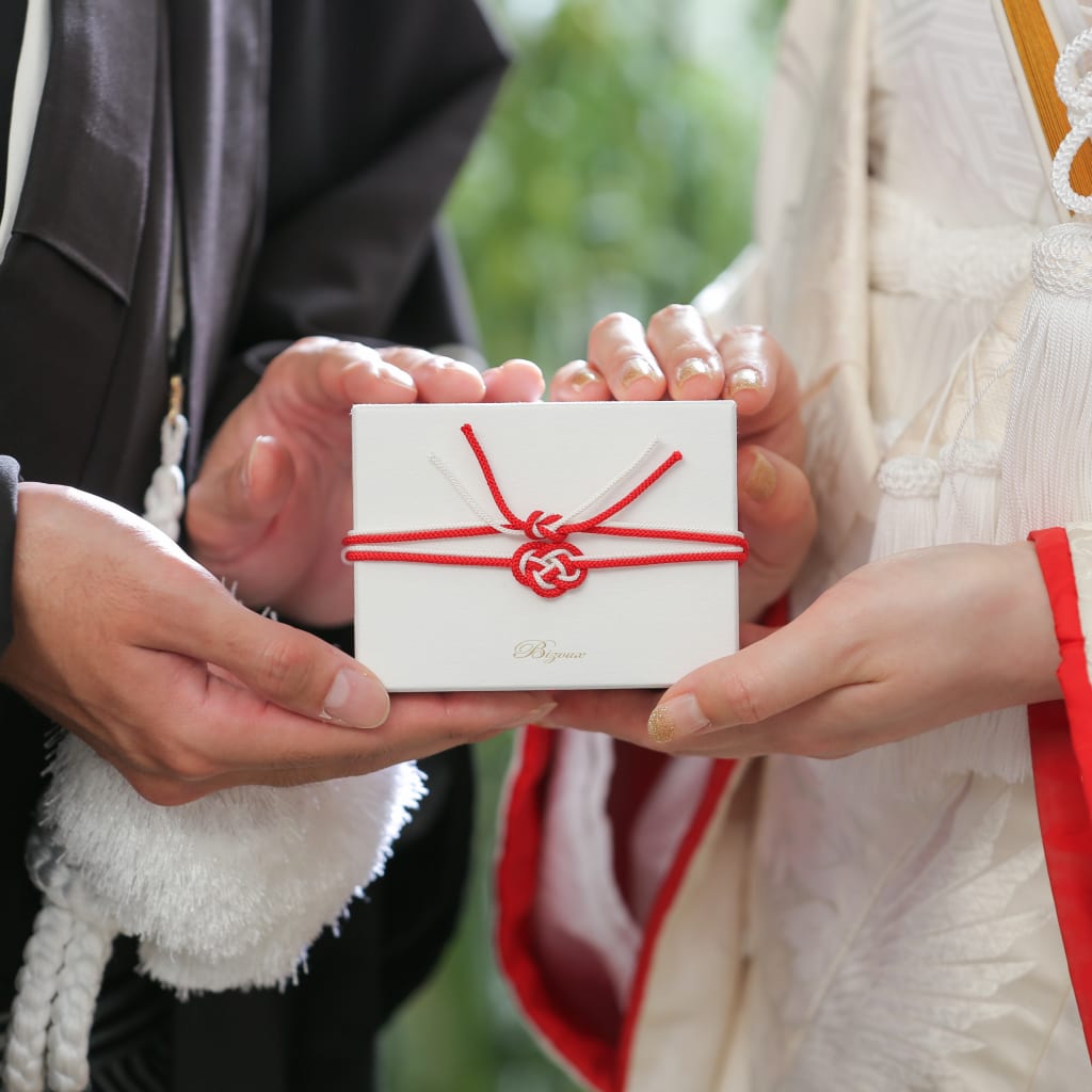お衣装(赤比翼)とぴったりデザインの指輪ケースを持って一枚!
