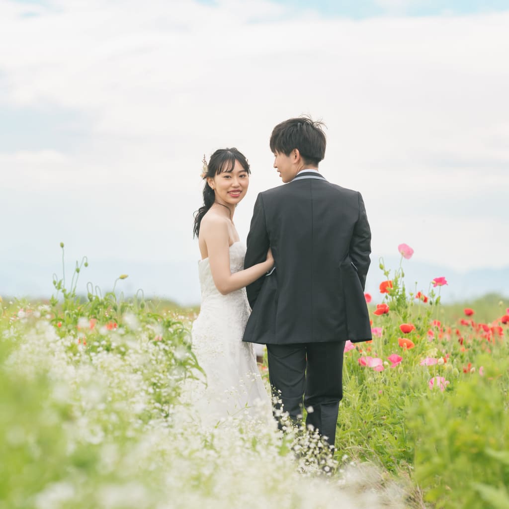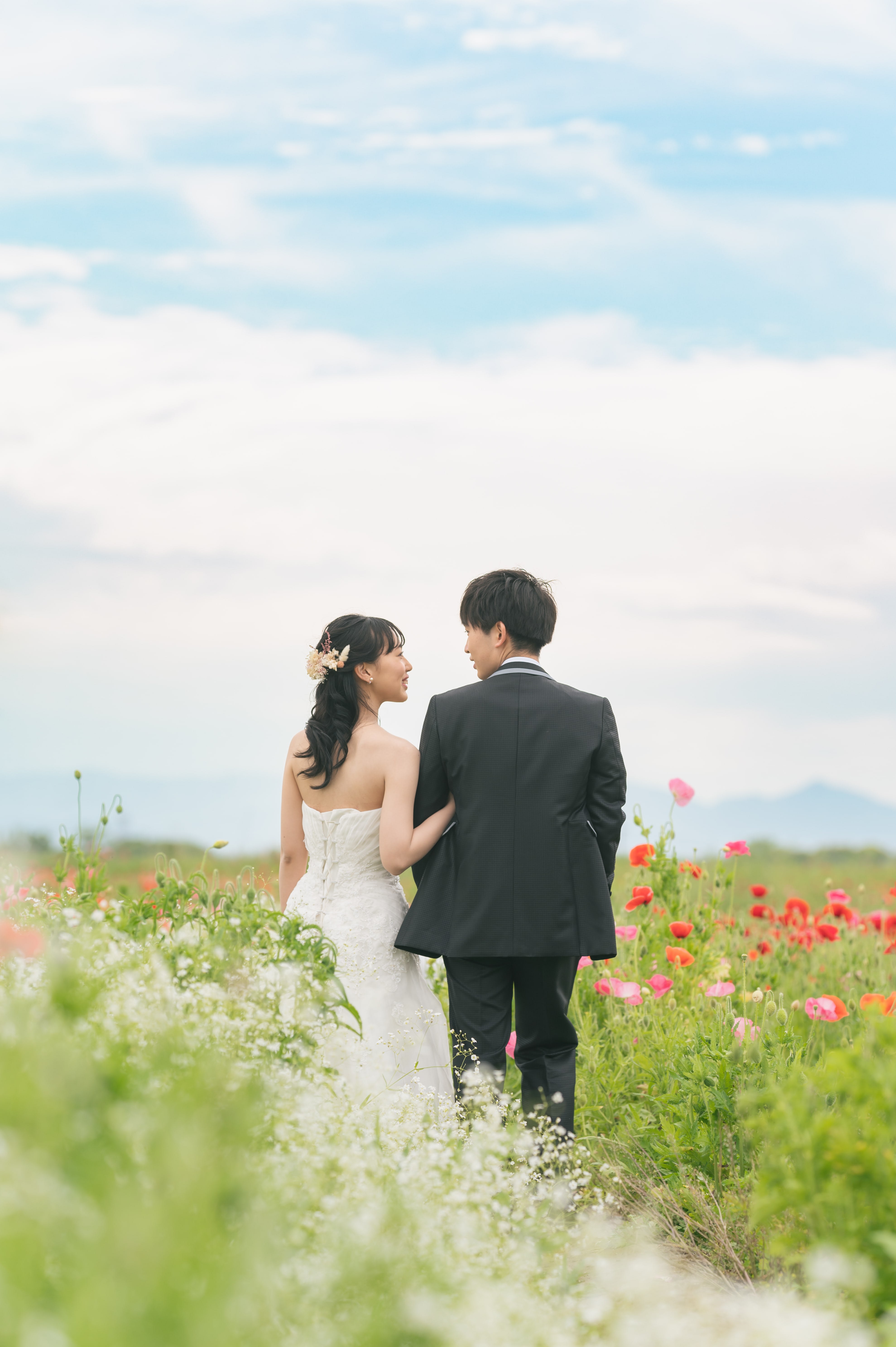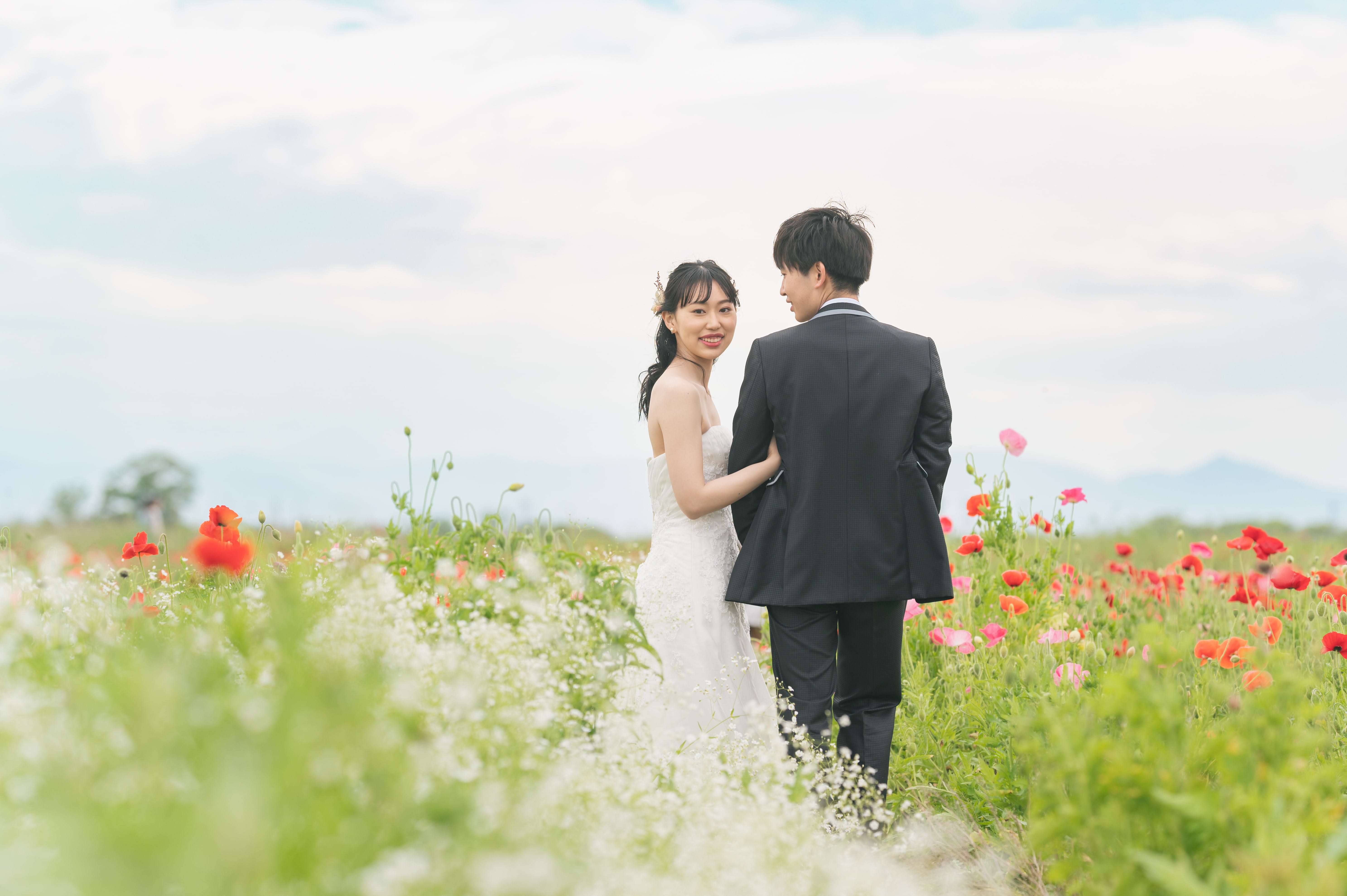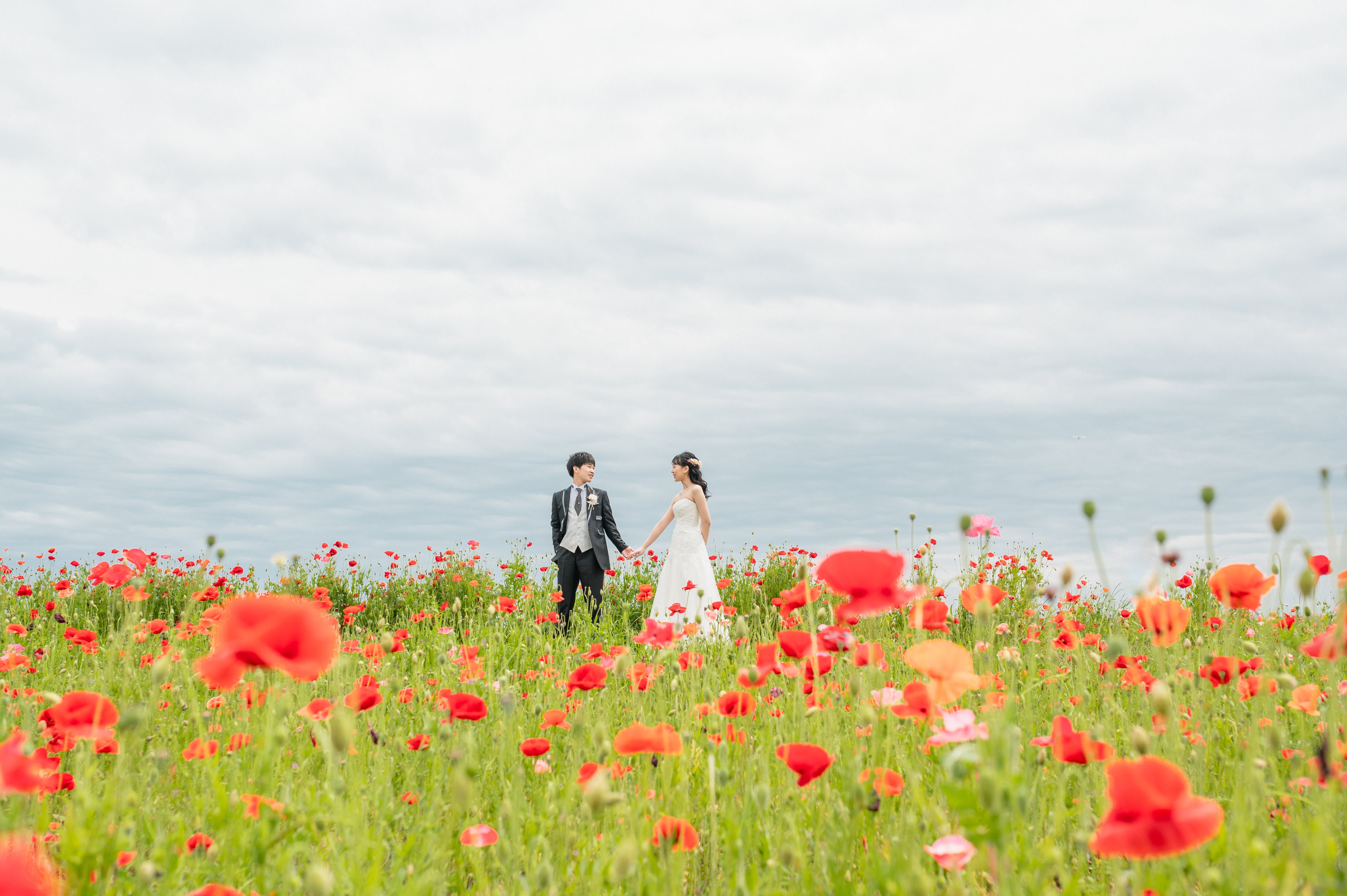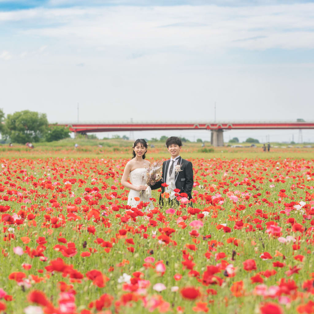 お二人の笑顔も緑とポピーが合わさりより引き立ちますね!