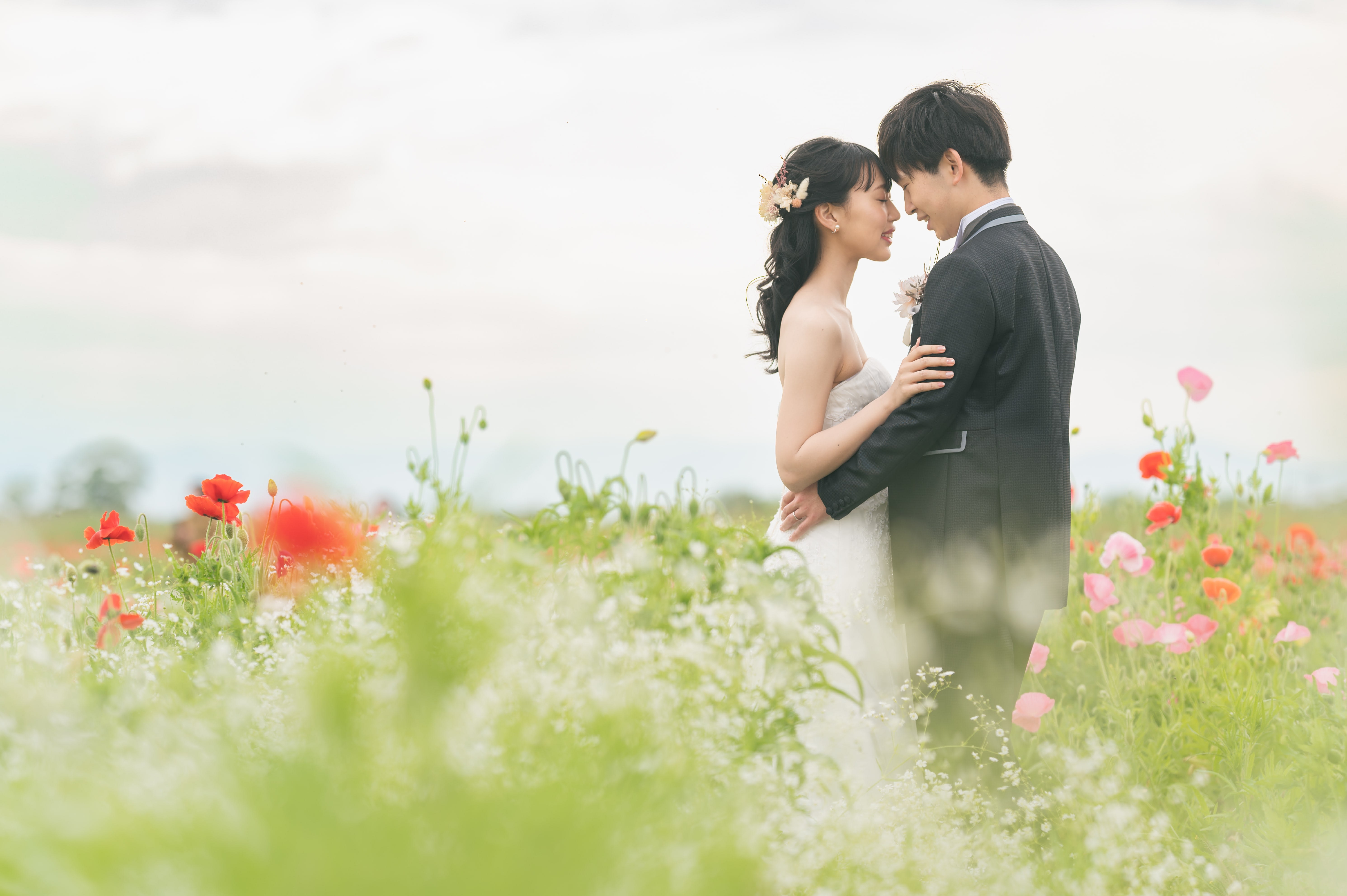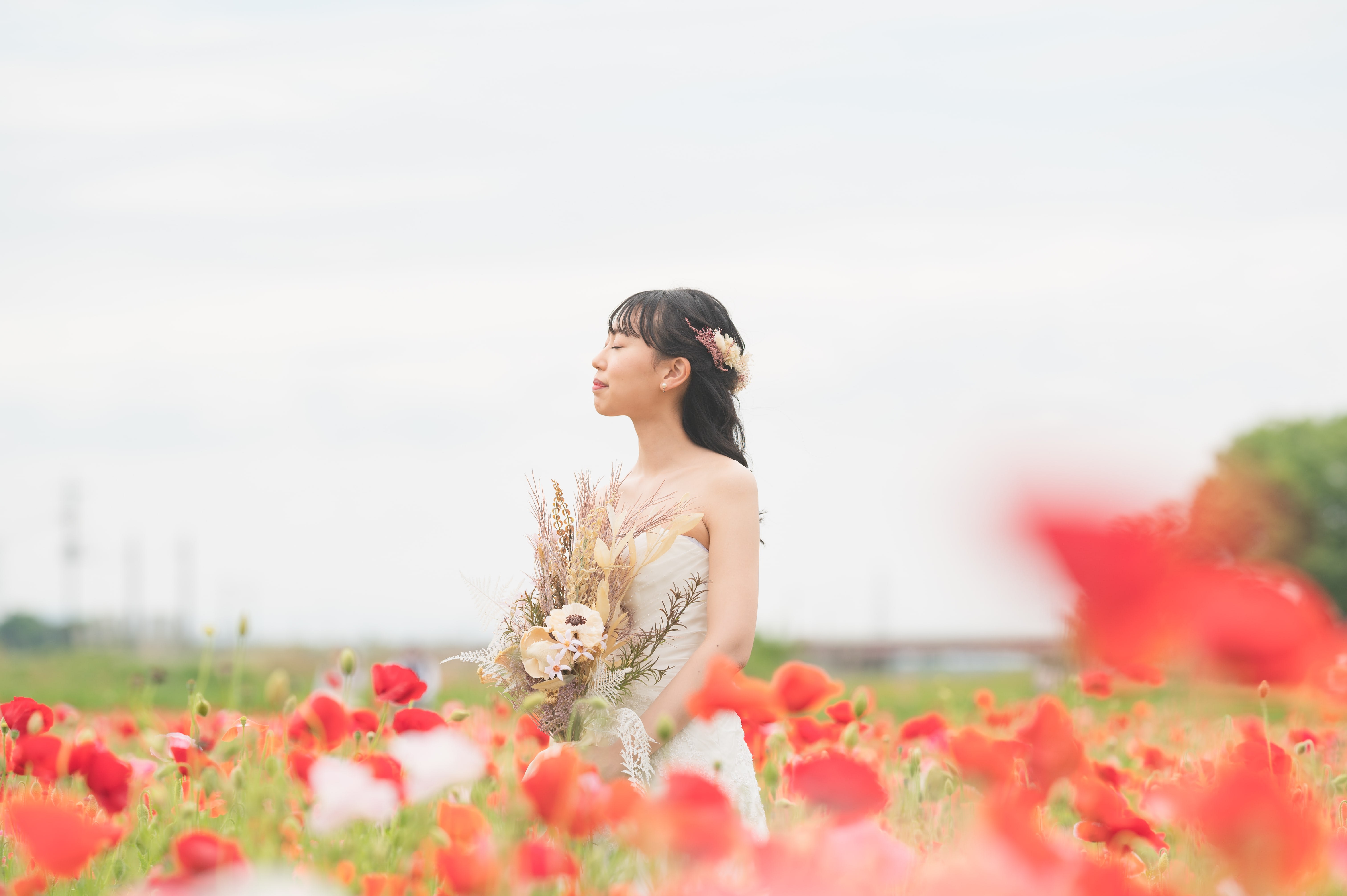 白い花と赤いポピーがお二人を包む、素敵で幻想的な写真が撮れました!