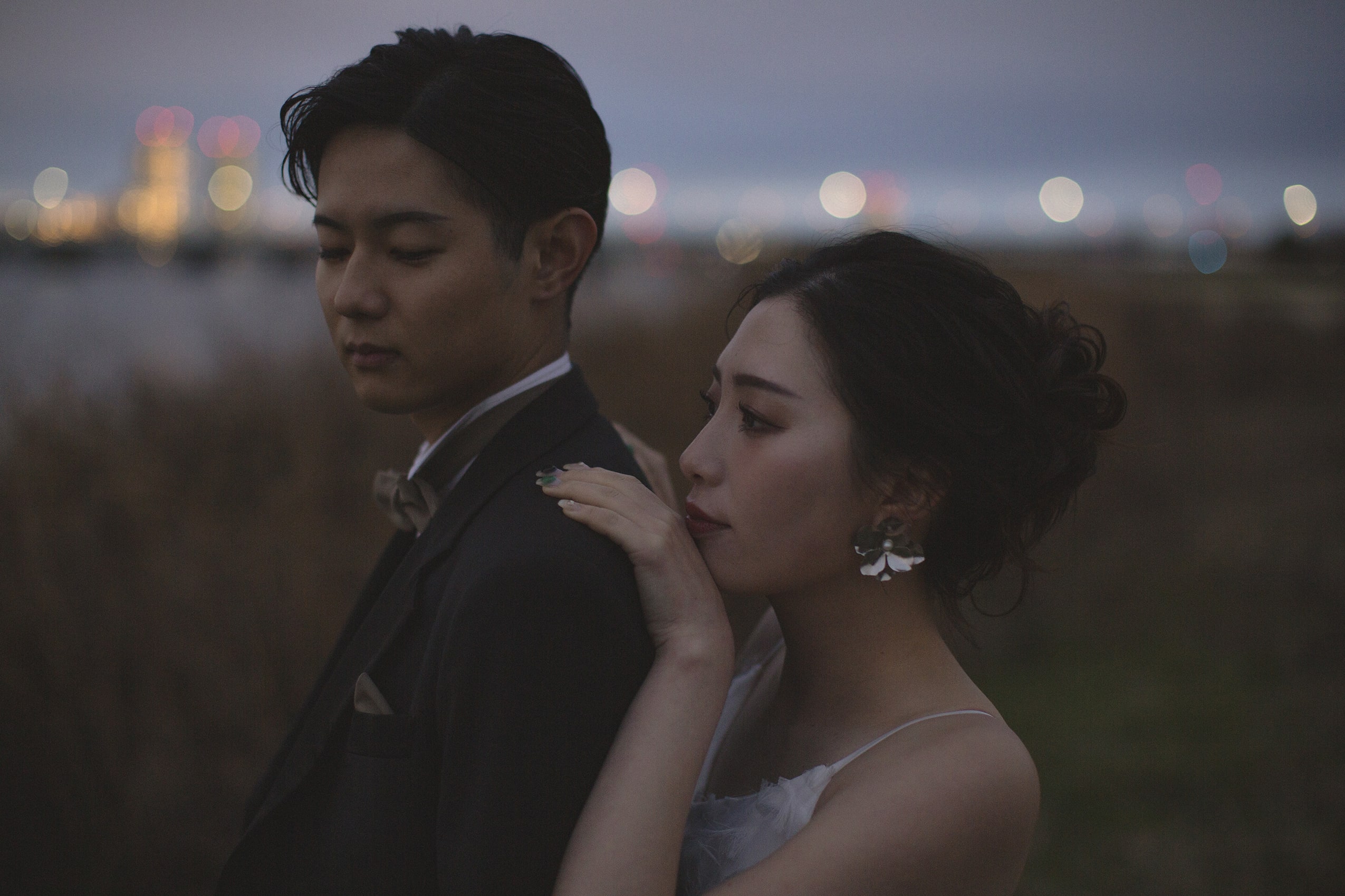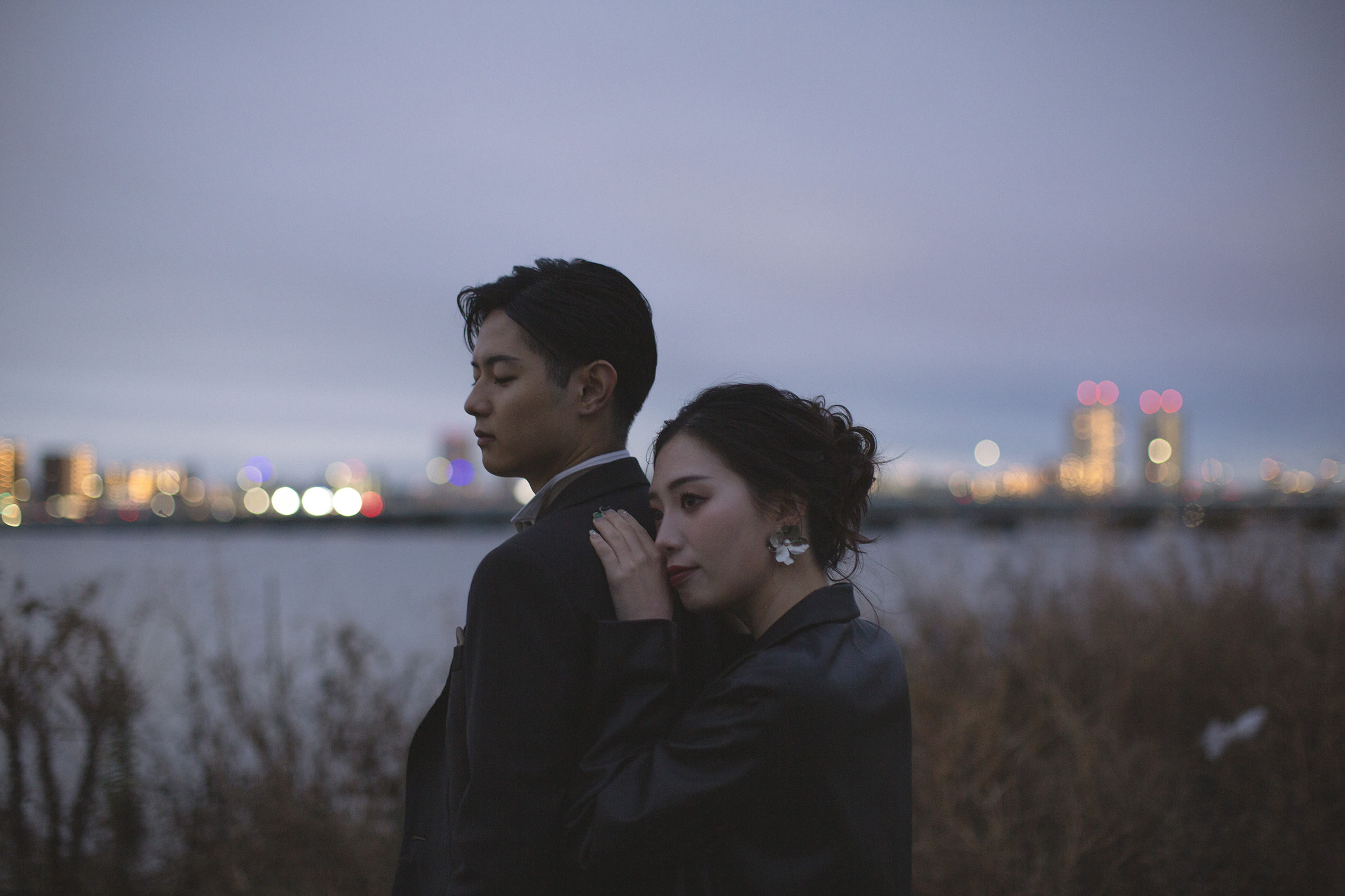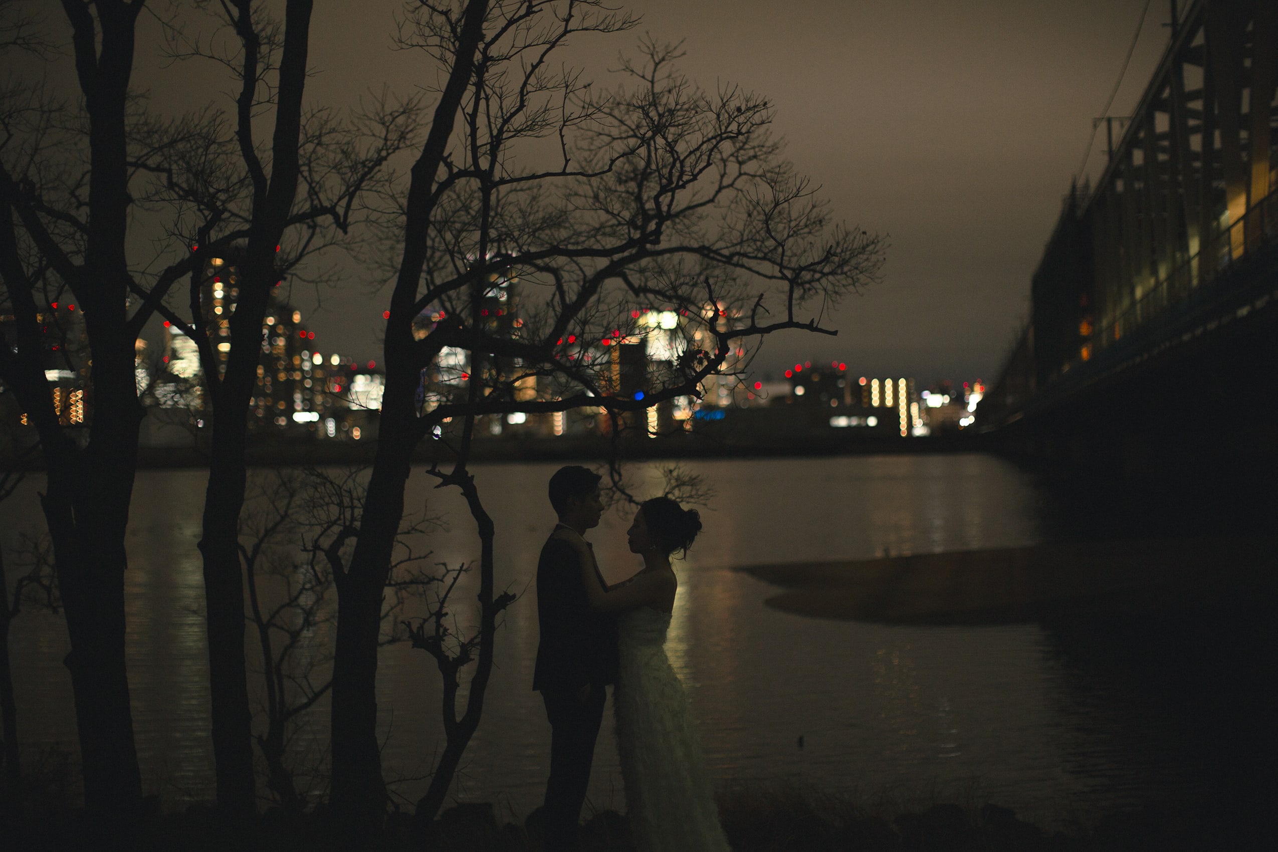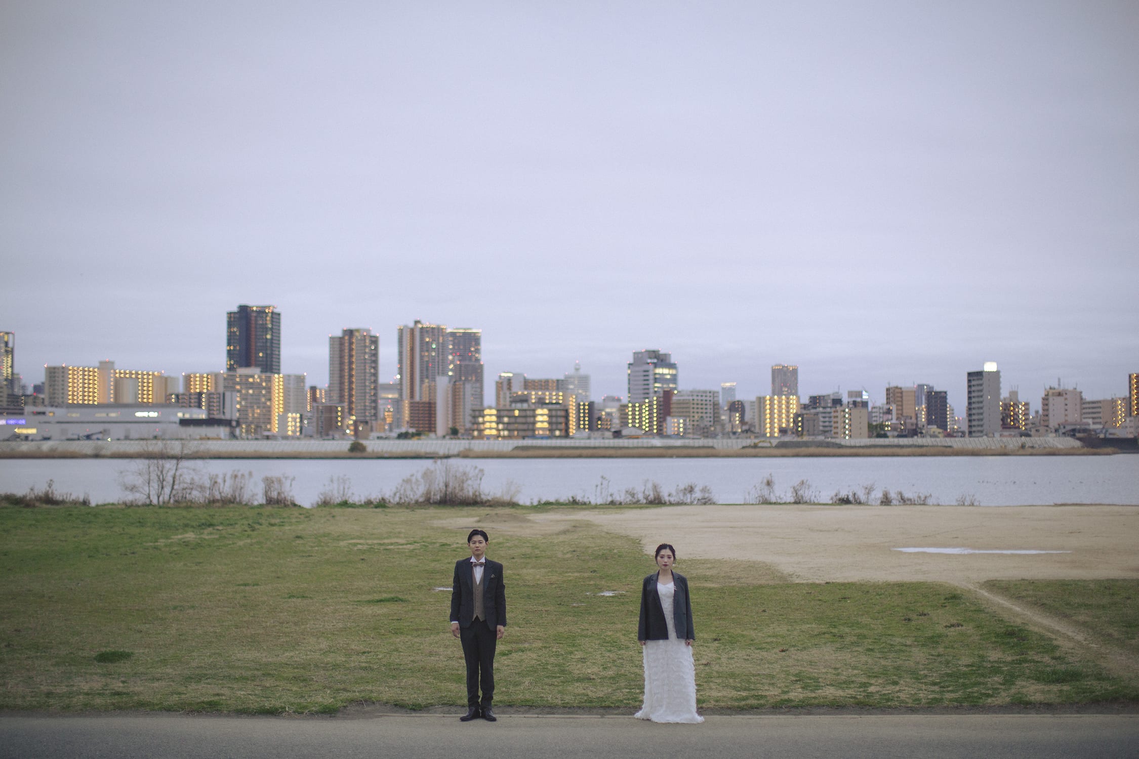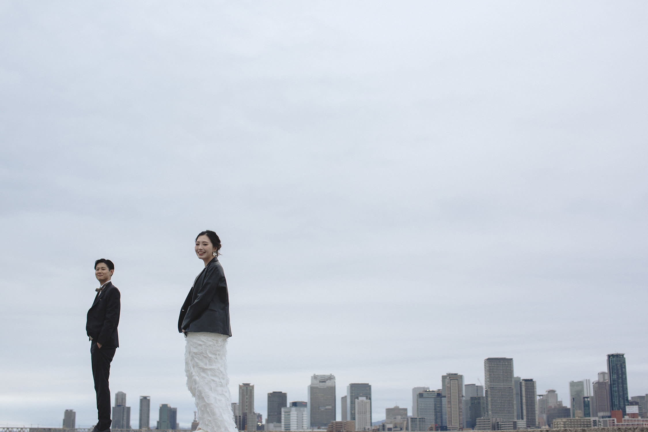 淀川の対岸に見える大阪・梅田の街並みがきらきらしてドラマティックなフォトウェディングに仕上がりました。