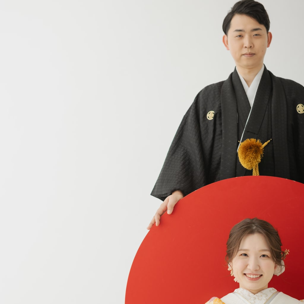 ライティングの工夫で落ち着いたグレーの背景も演出可能です。きっちりした和装結婚写真はご家族様にもお喜びいただけますよ。