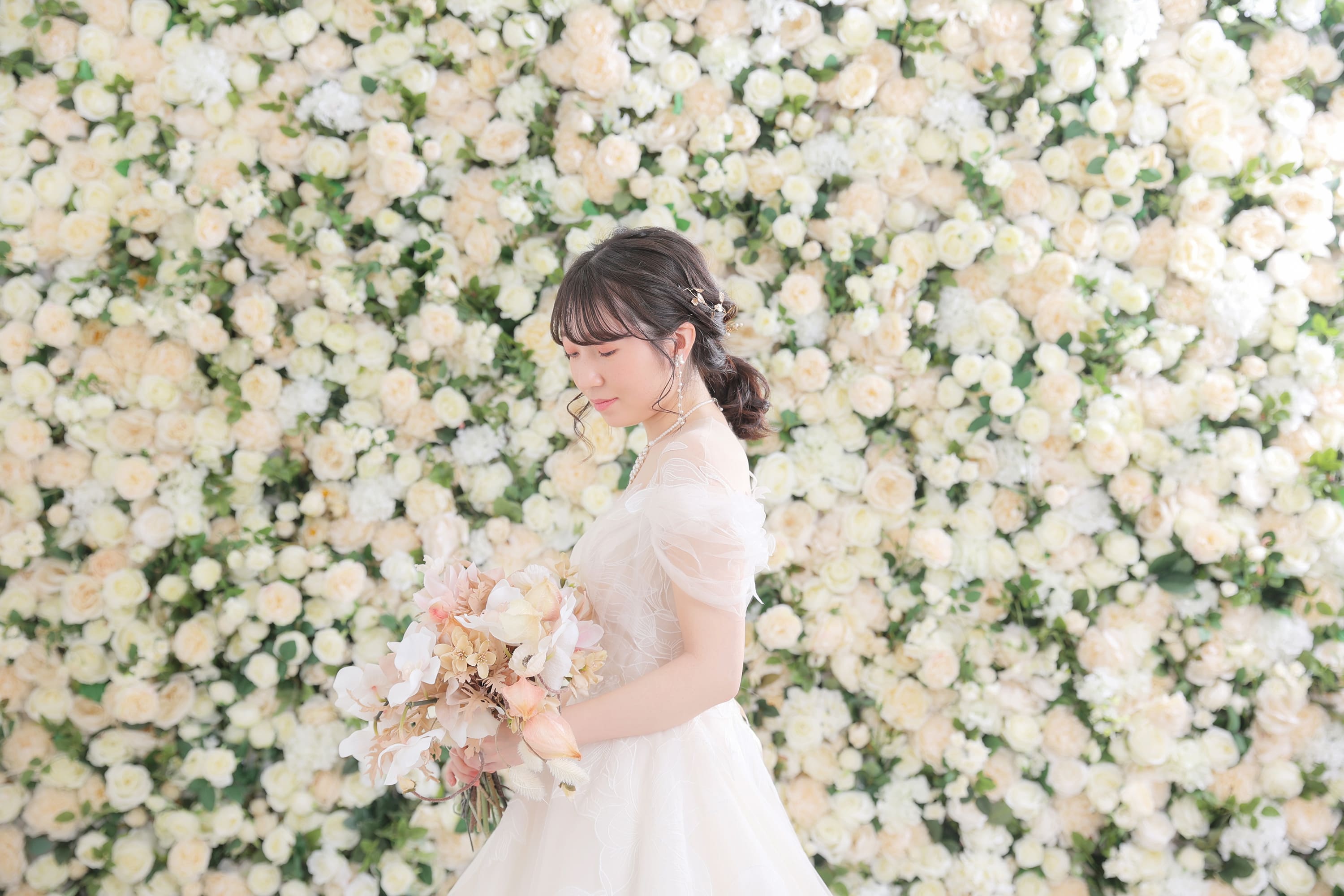 横浜には【駅前店】と【みなとみらい店】がありますがハウススタジオの白バラのフラワーフォールで撮影できるので選ばれるみなとみらい店です!