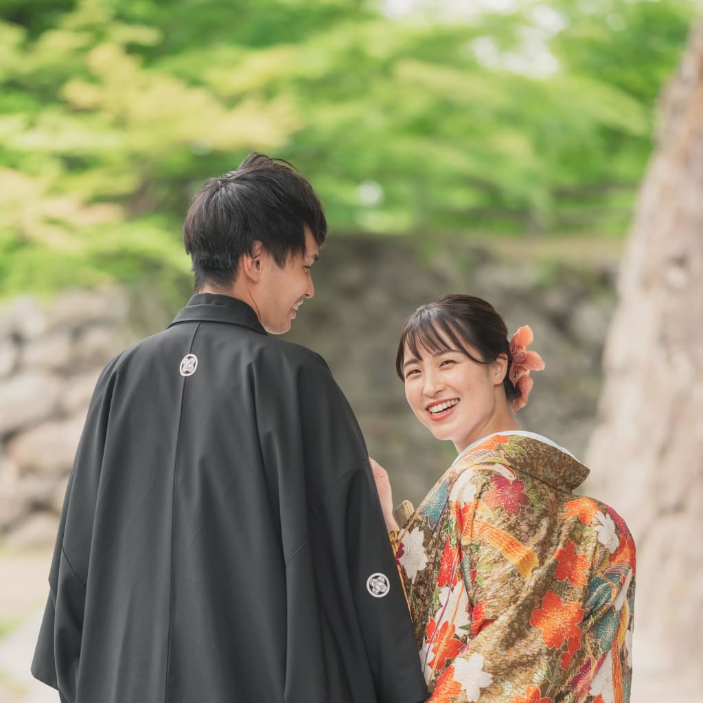 新婦様が後ろから新郎様へ声を掛けている一枚。 不意な写真が見た時に笑顔が漏れる写真だったりしますよね!