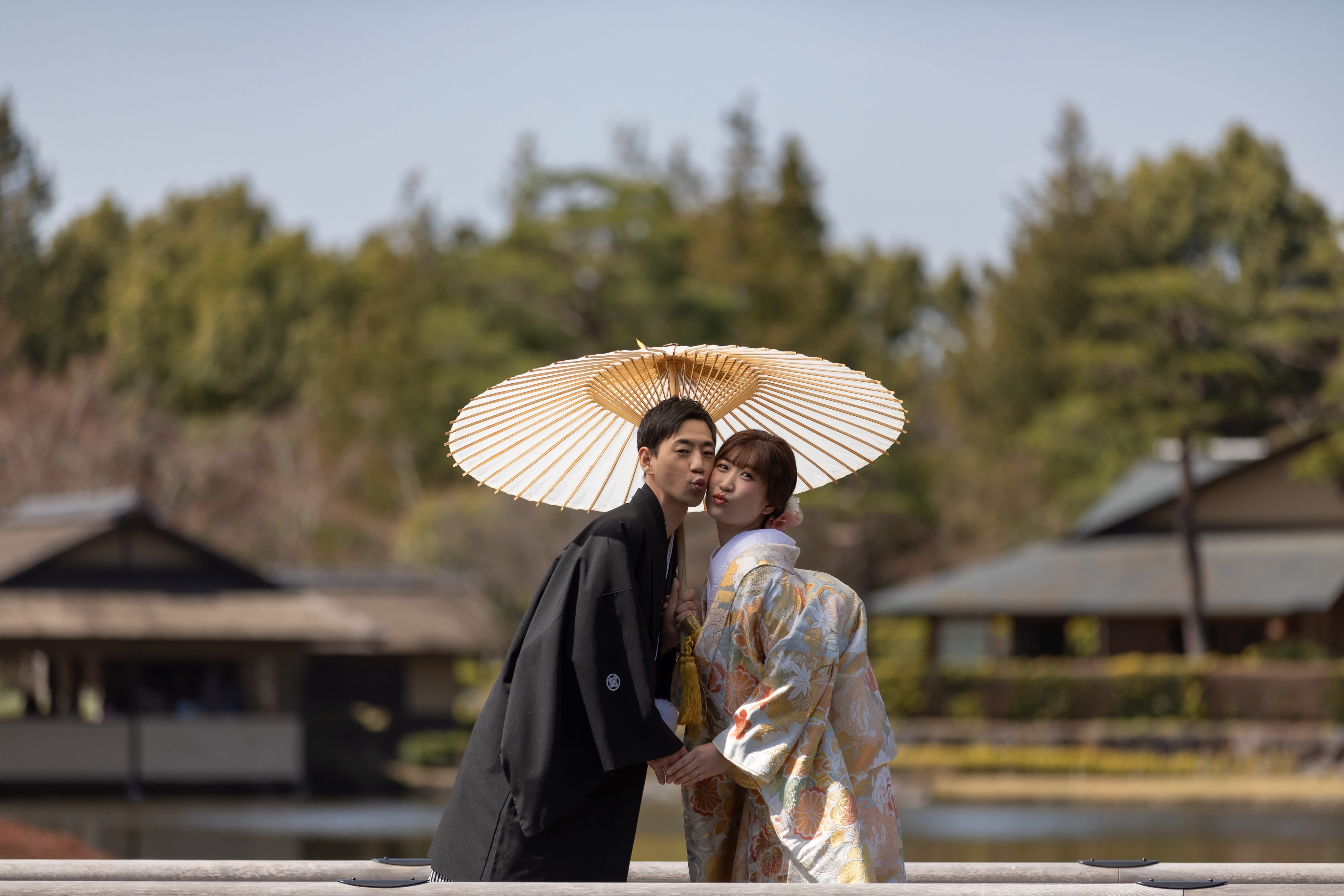 この日は雲1つない澄んだ青空。 池には反射したお二人の姿。