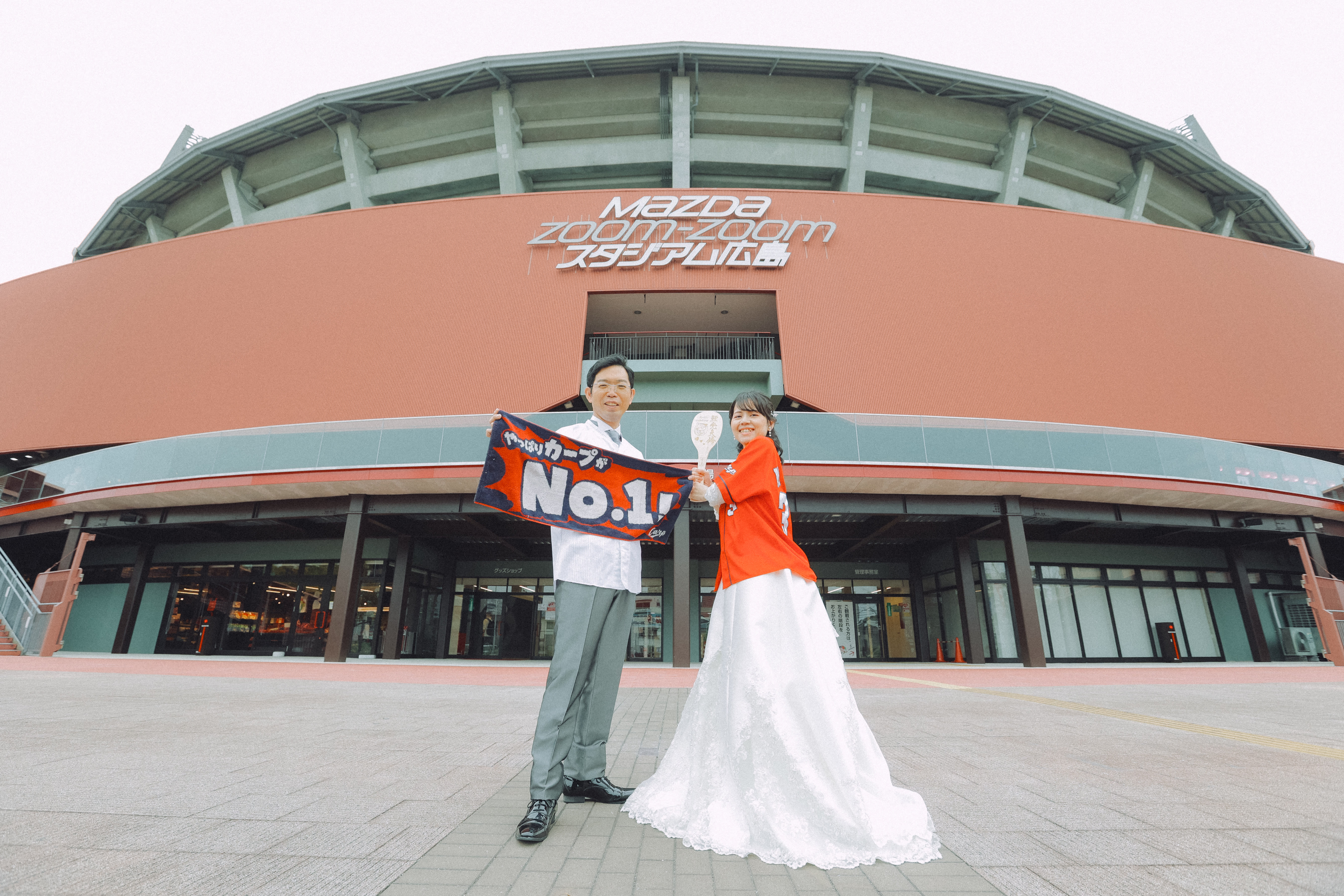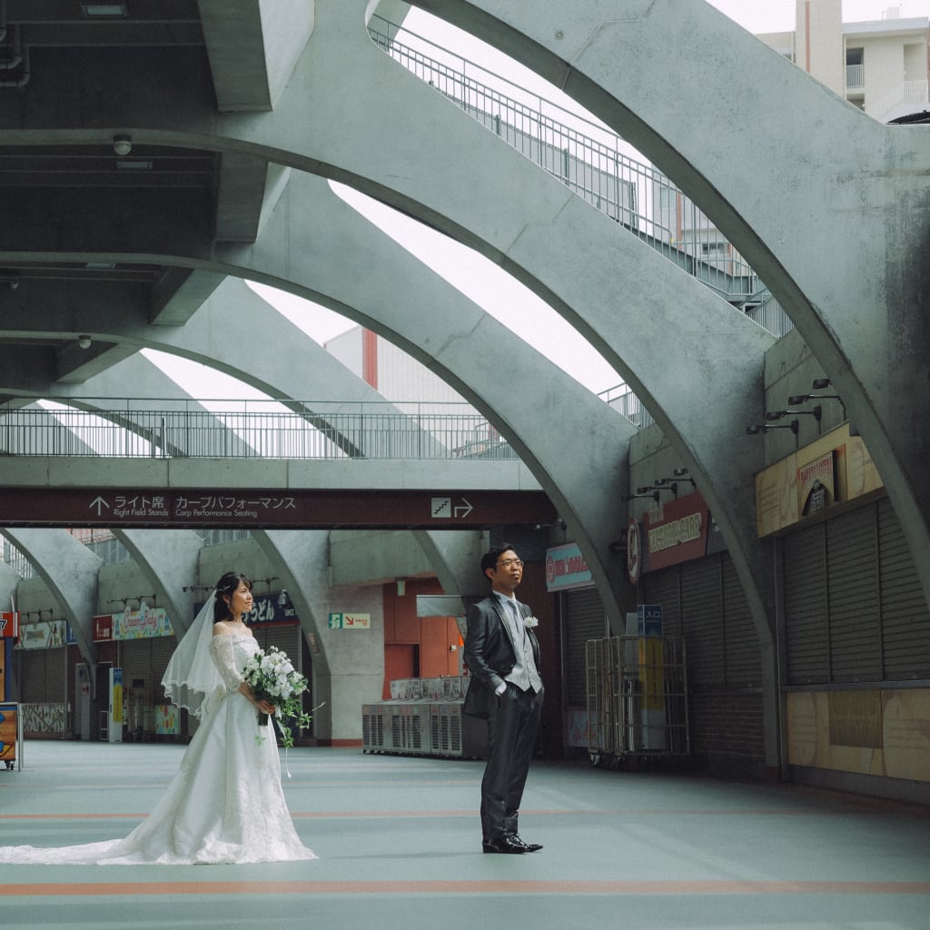 広島といえばカープ!そんなカープ好きのお二人が選んだ場所は、広島市内にある球場マツダスタジアム! まるで今から観戦に行くような雰囲気の中、撮影スタートです!
