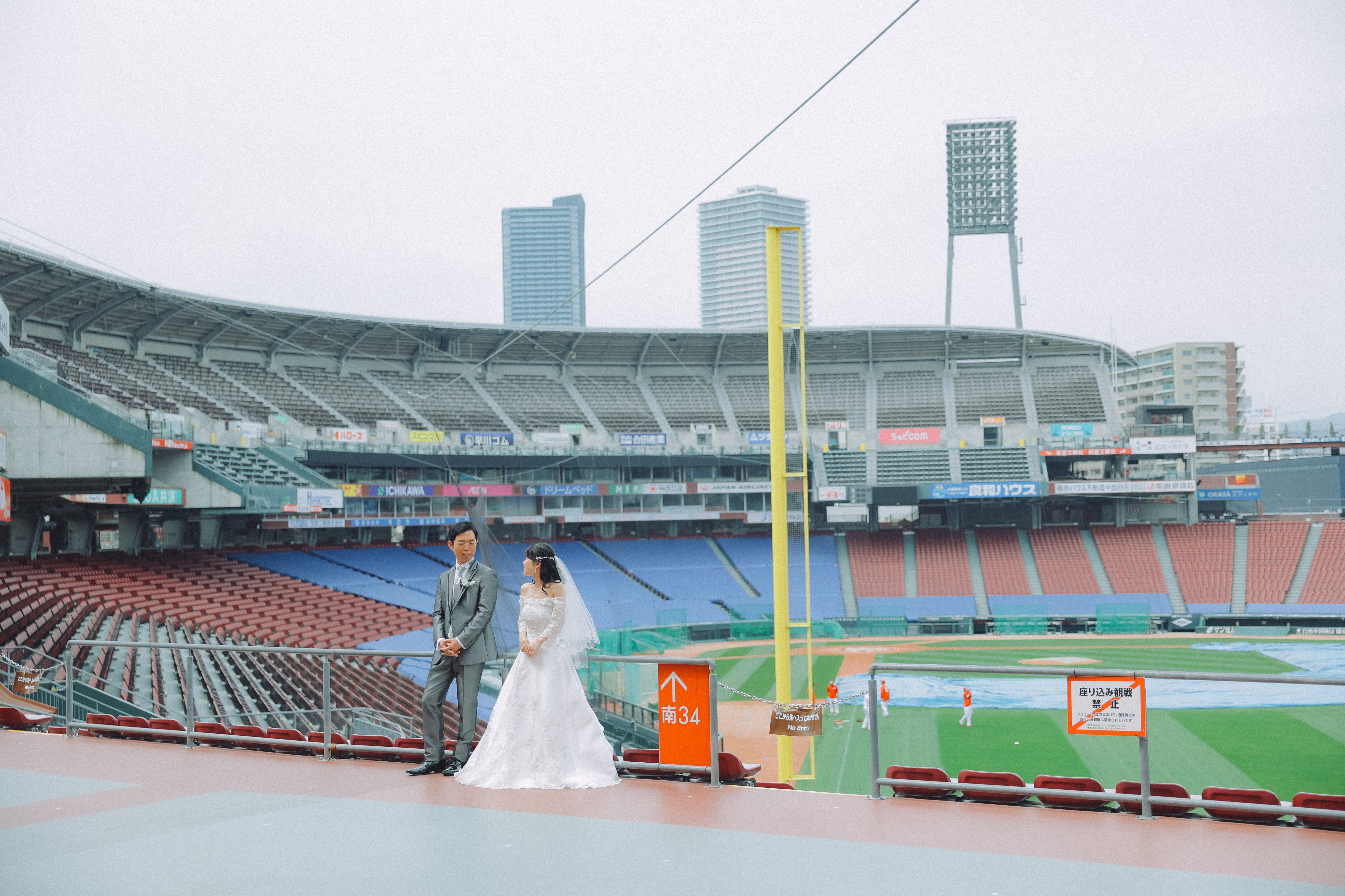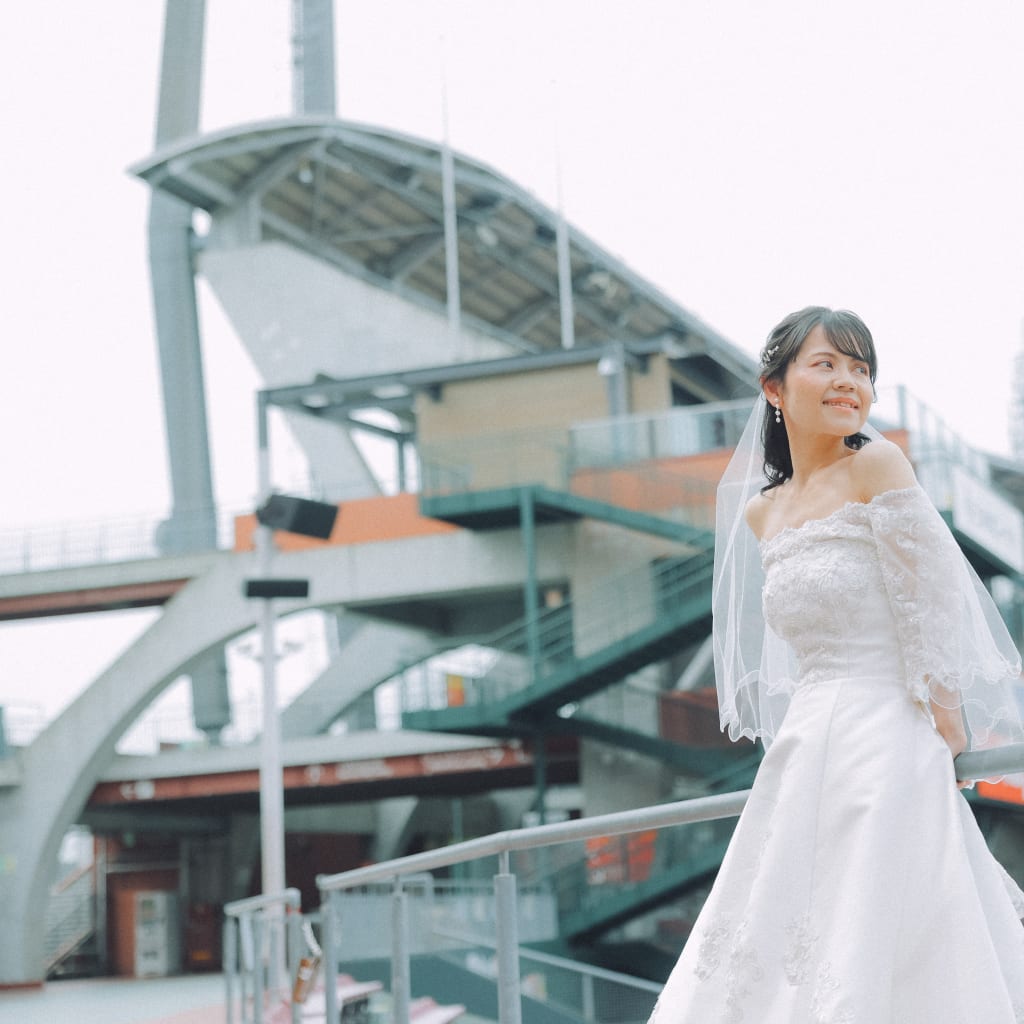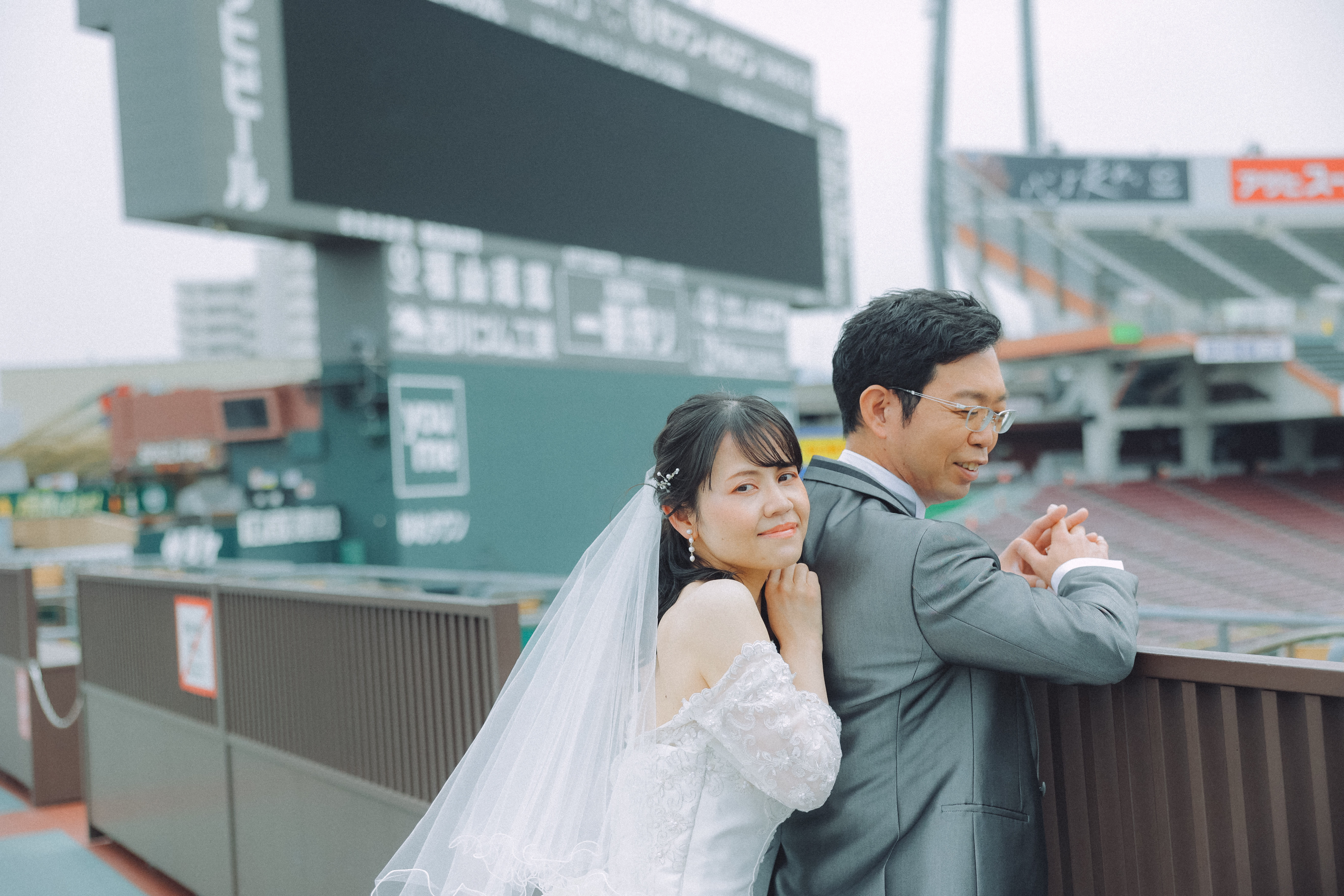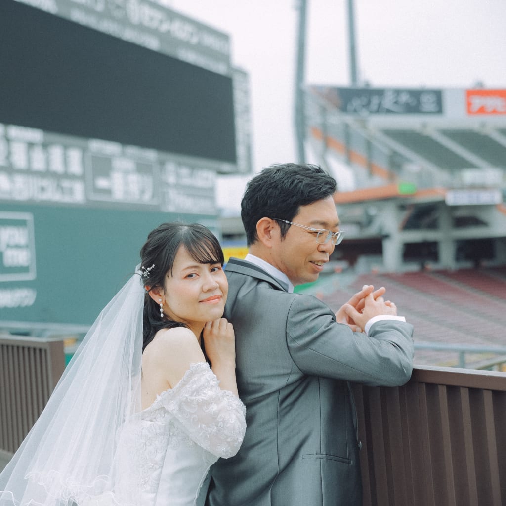 最後は、大きな看板の前パシャリ!!おふたりの野球好き魂が良きウエディング写真になったとこで、 無事、撮影を終えることができました!!