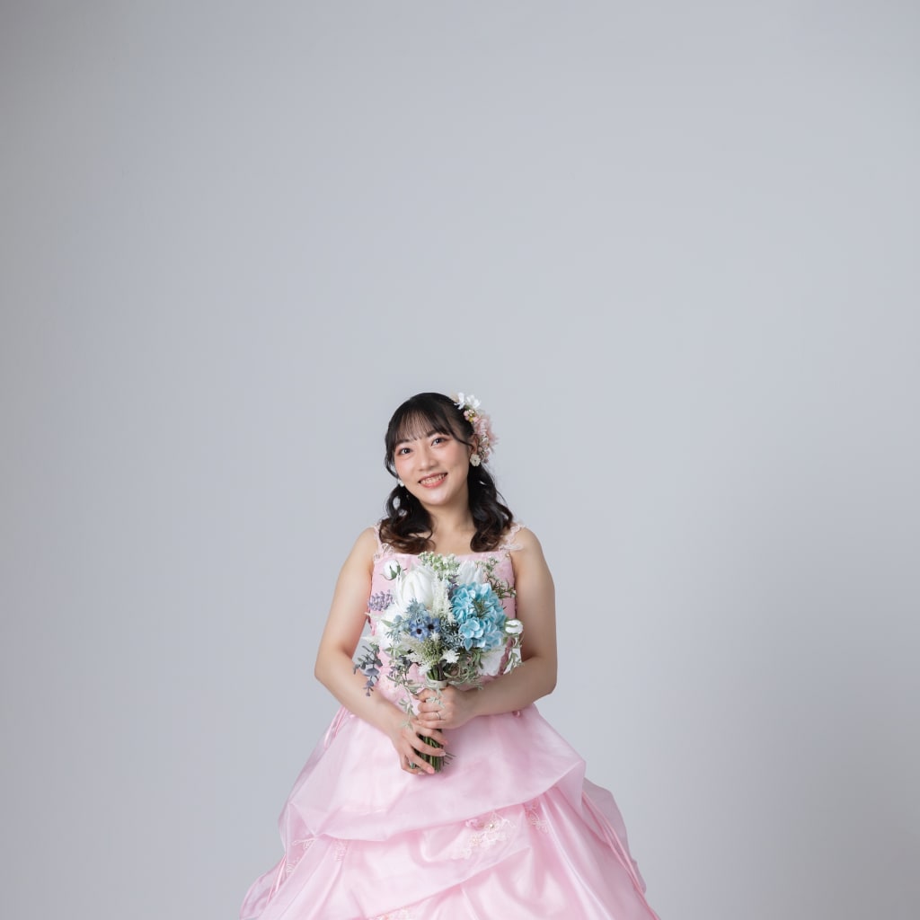 ご新郎様からブーケを貰ってにこにこなご新婦様♡ 水色のブーケとピンクのドレス、色鮮やかでとても可愛い♫