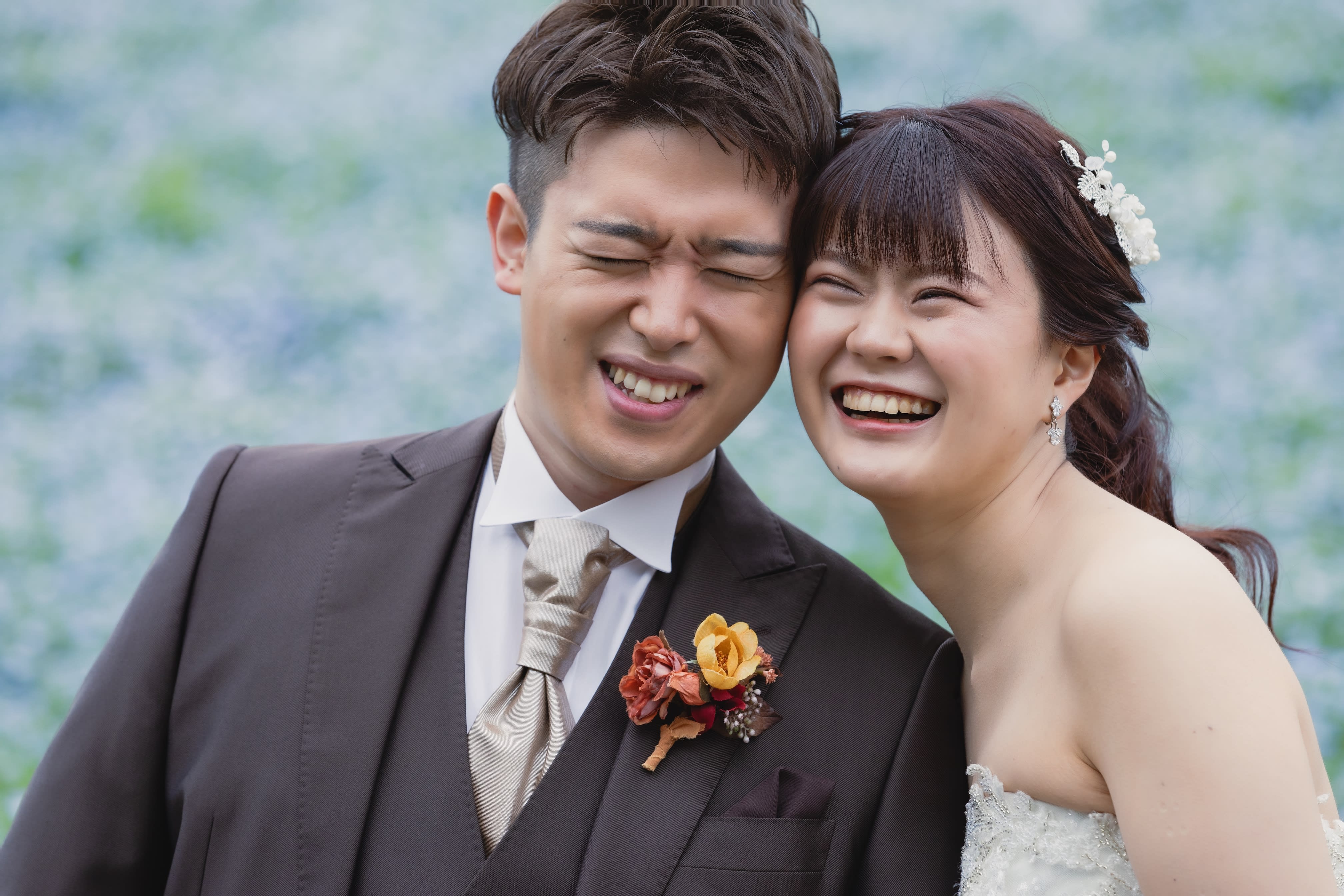 結婚しましたの指輪見せショット♡ 見つめ合うお二人の笑顔が素敵です♫