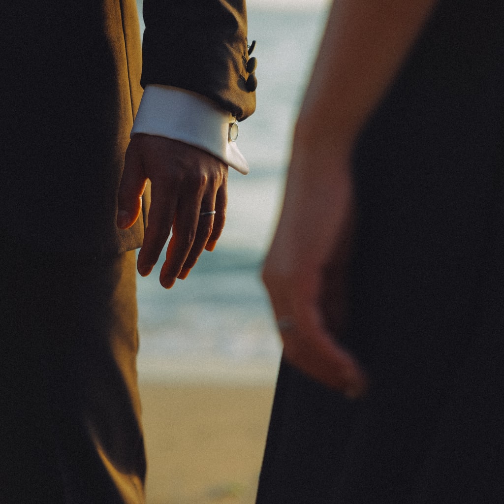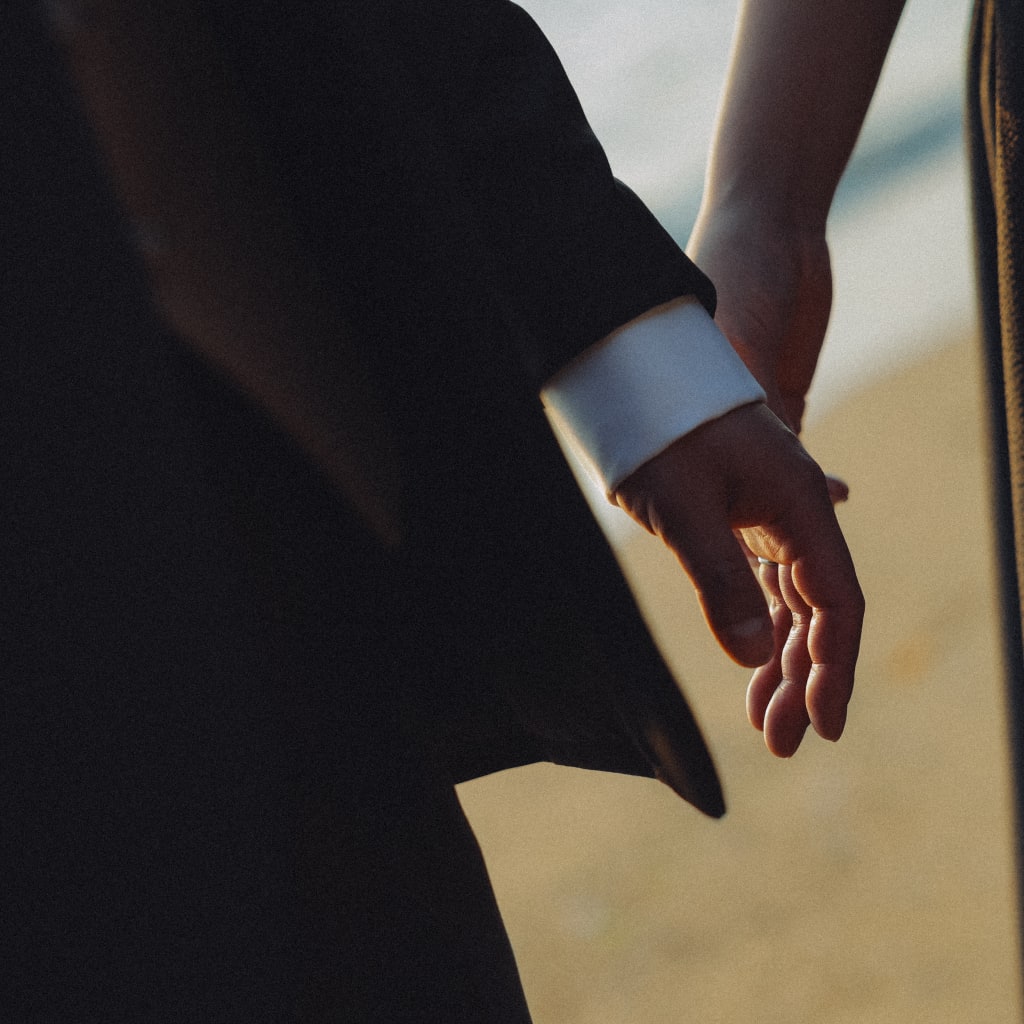 新婦様の黒ドレス姿も新郎様のタキシード姿もとてもお似合いです! 遠くを見ている姿がまるでおふたりのこれからを見ているよう…!
