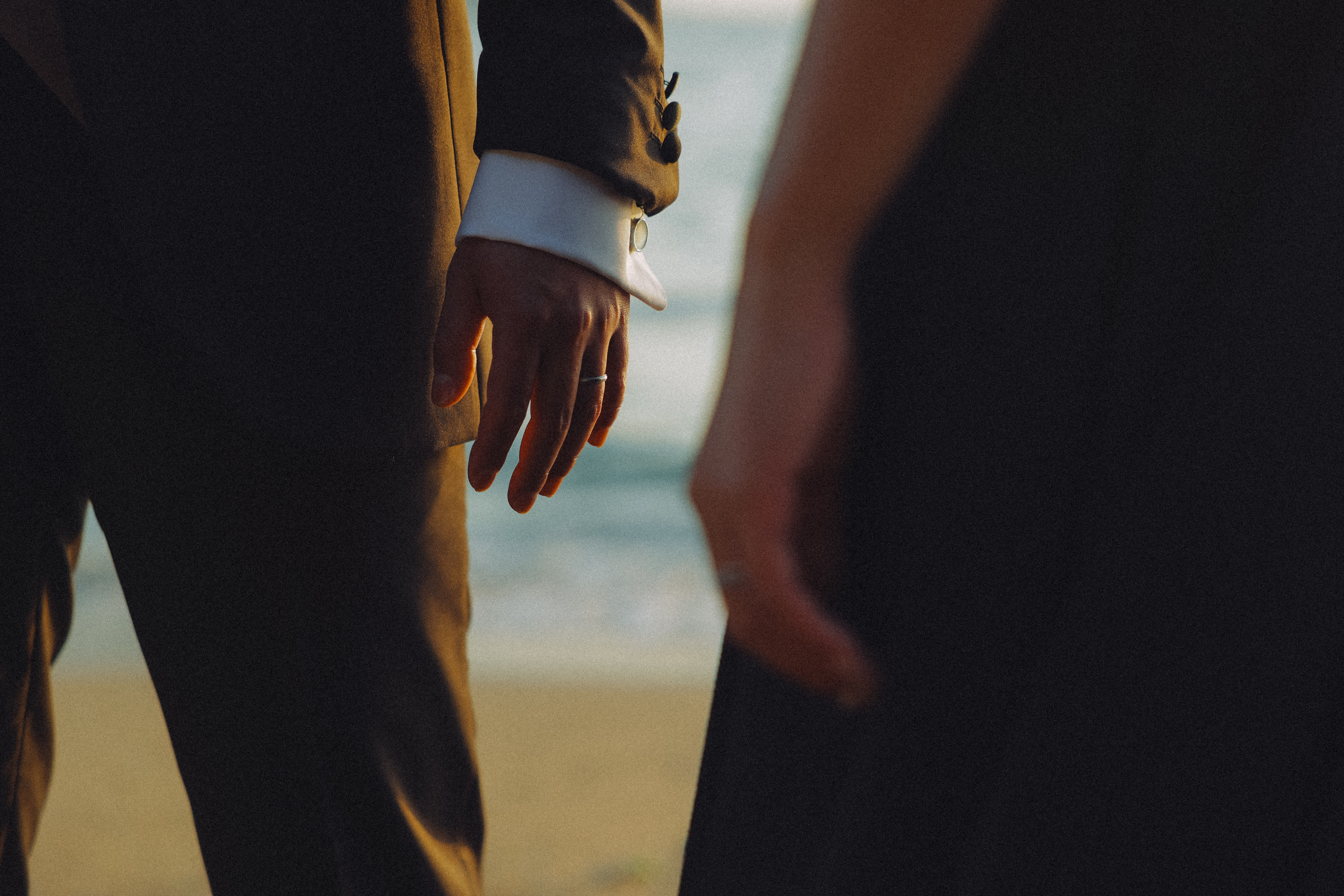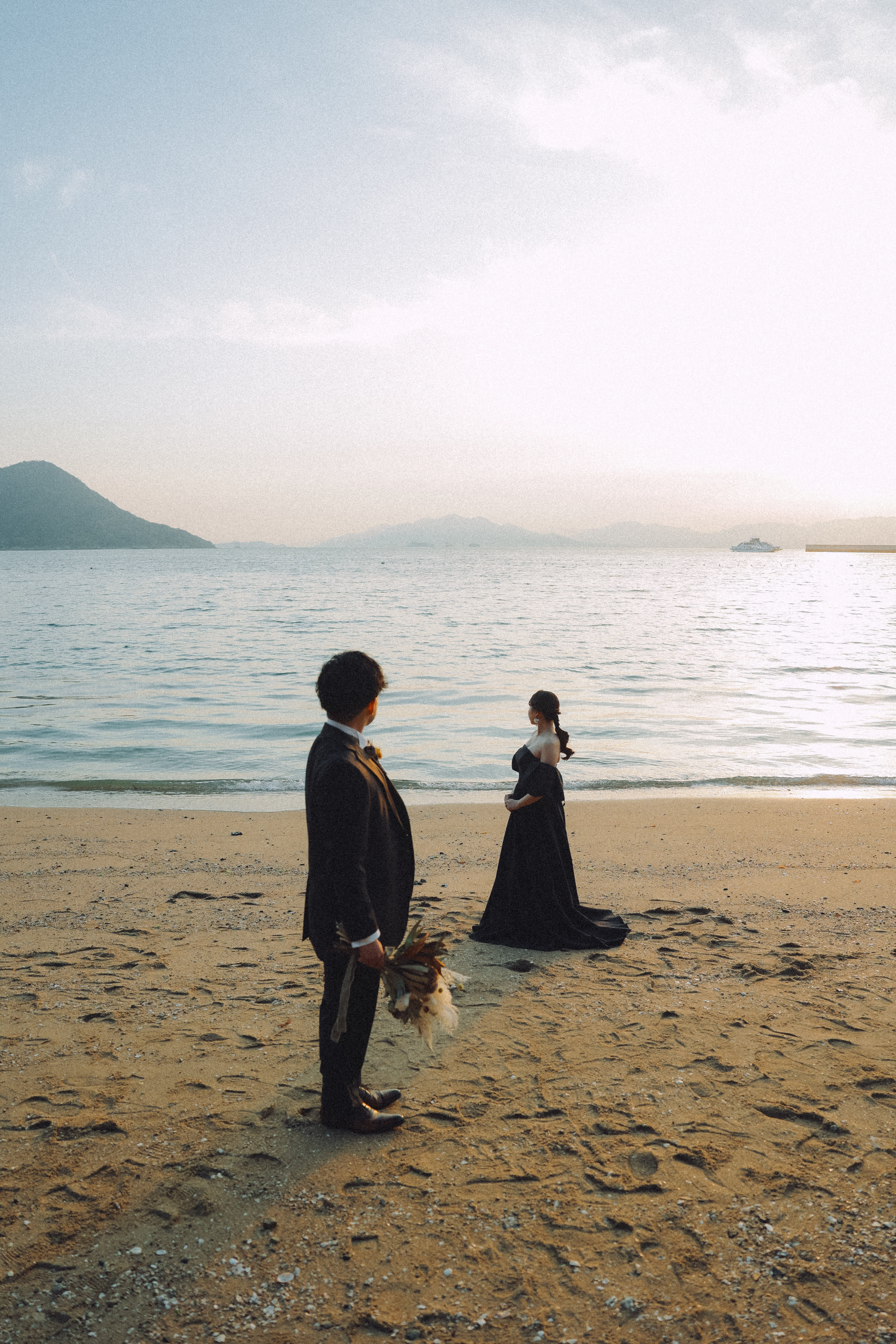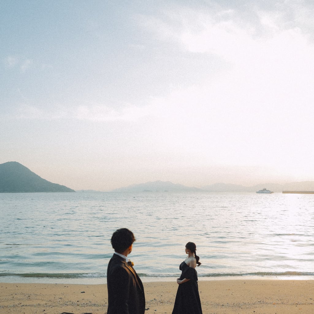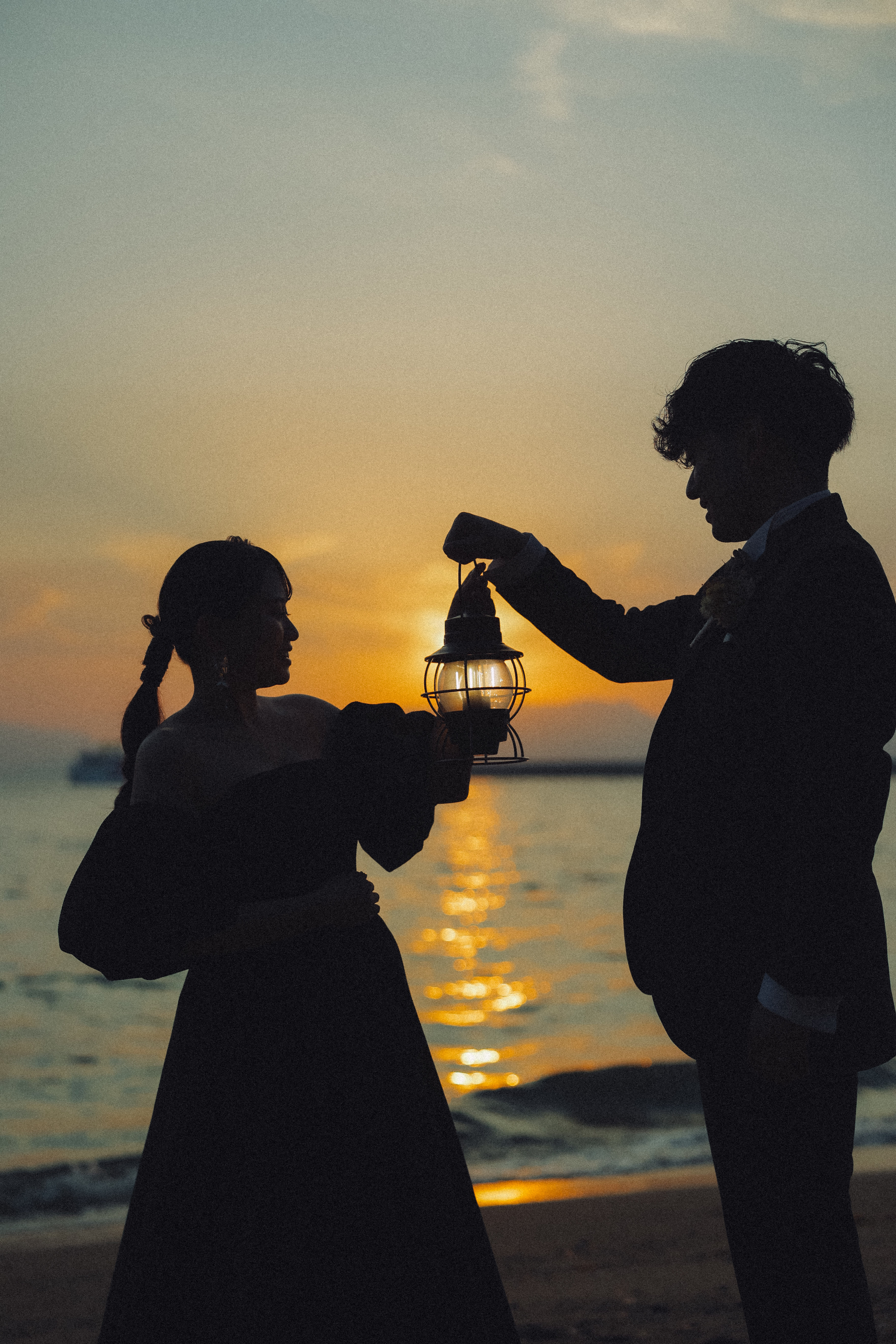 仲良く背中を合わせて撮影! 夕日が海にかかりおふたりのシルエットが素敵です!