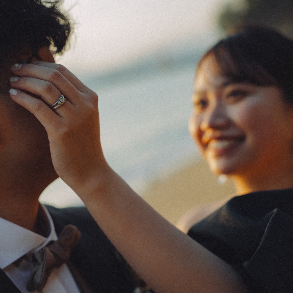 新婦様の笑顔の先には新郎様の笑顔が…!? キラキラした指輪やネイルも可愛いです!
