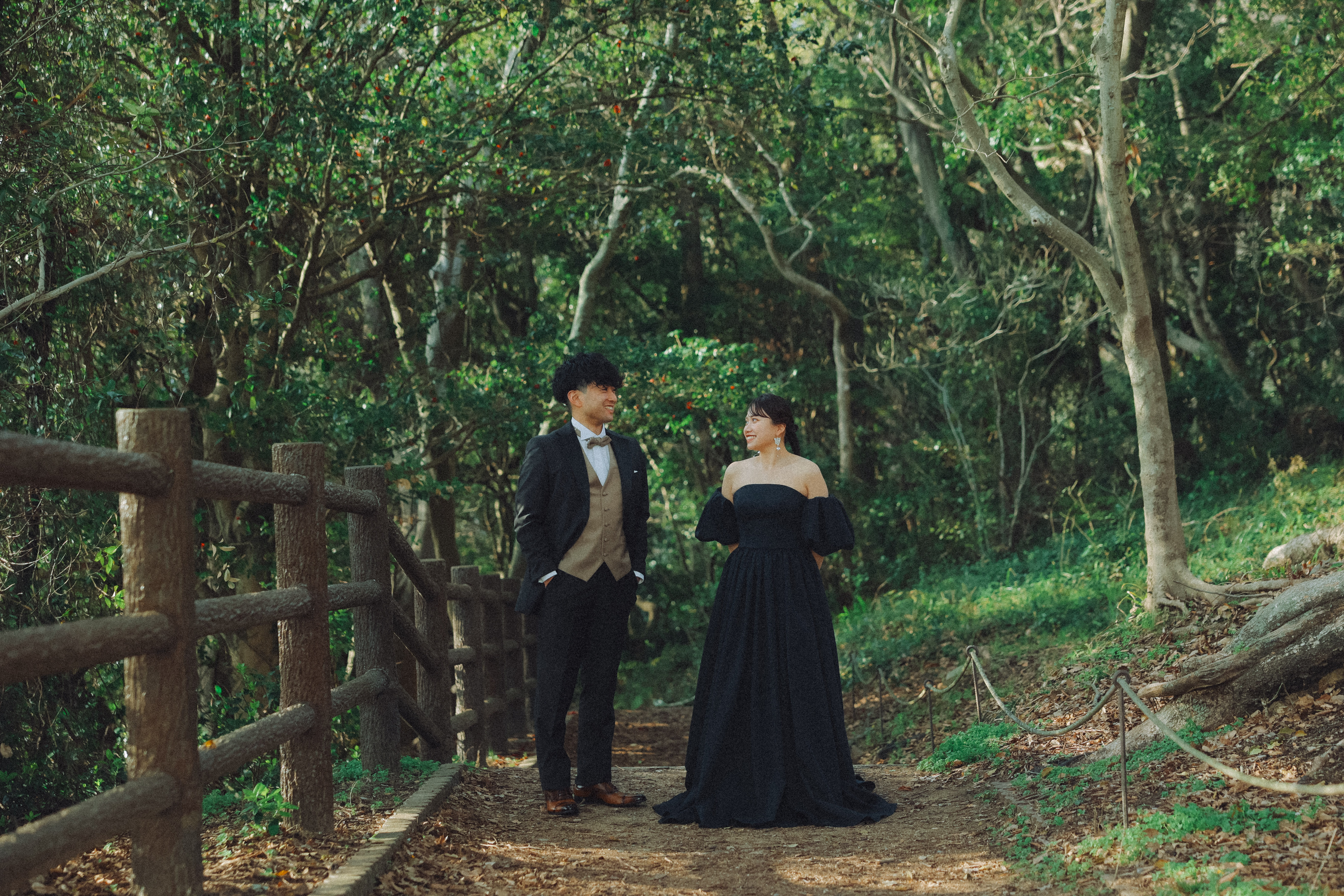 緑の中でおふたり見つめ合っての撮影! おふたりの笑顔が可愛らしいです!