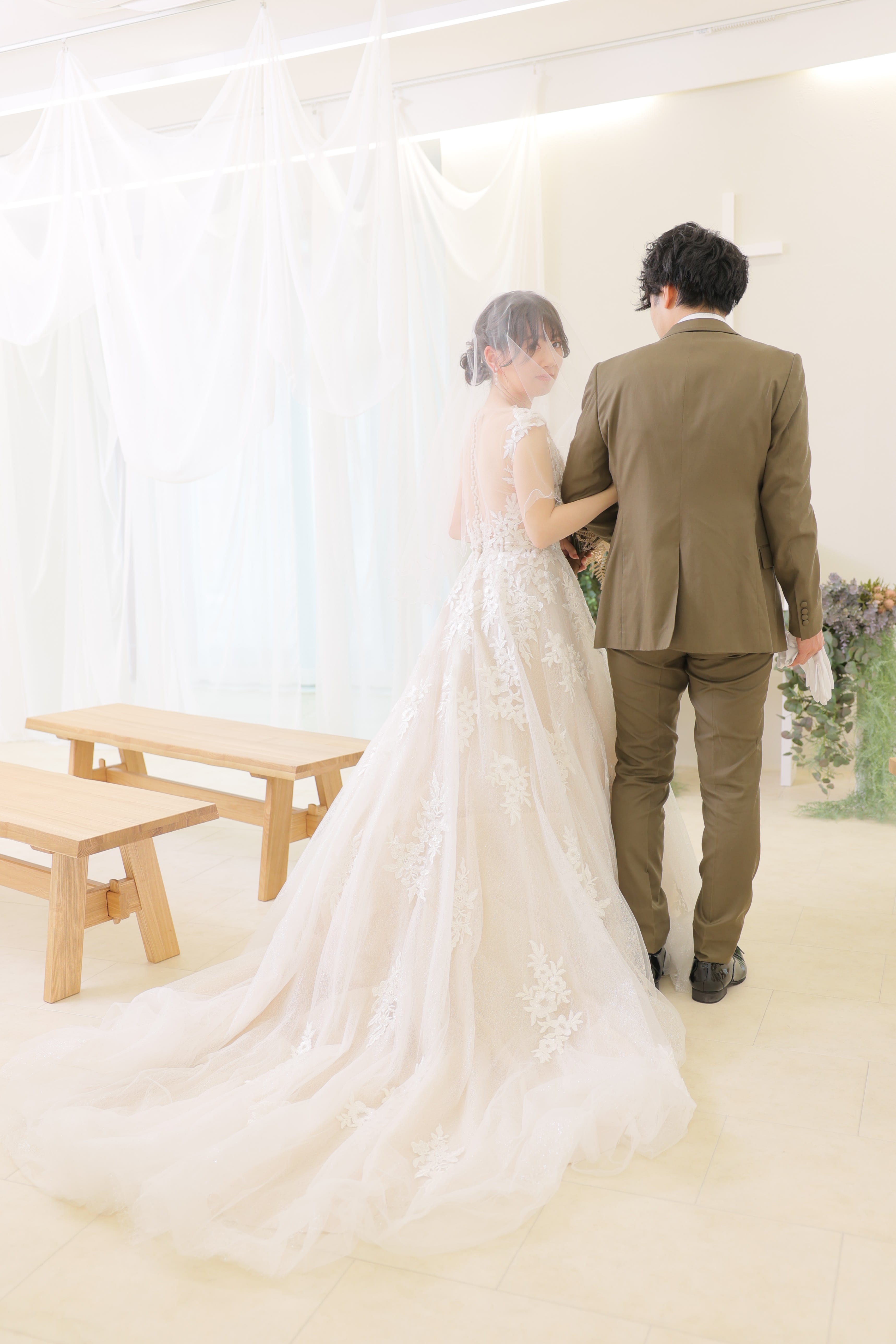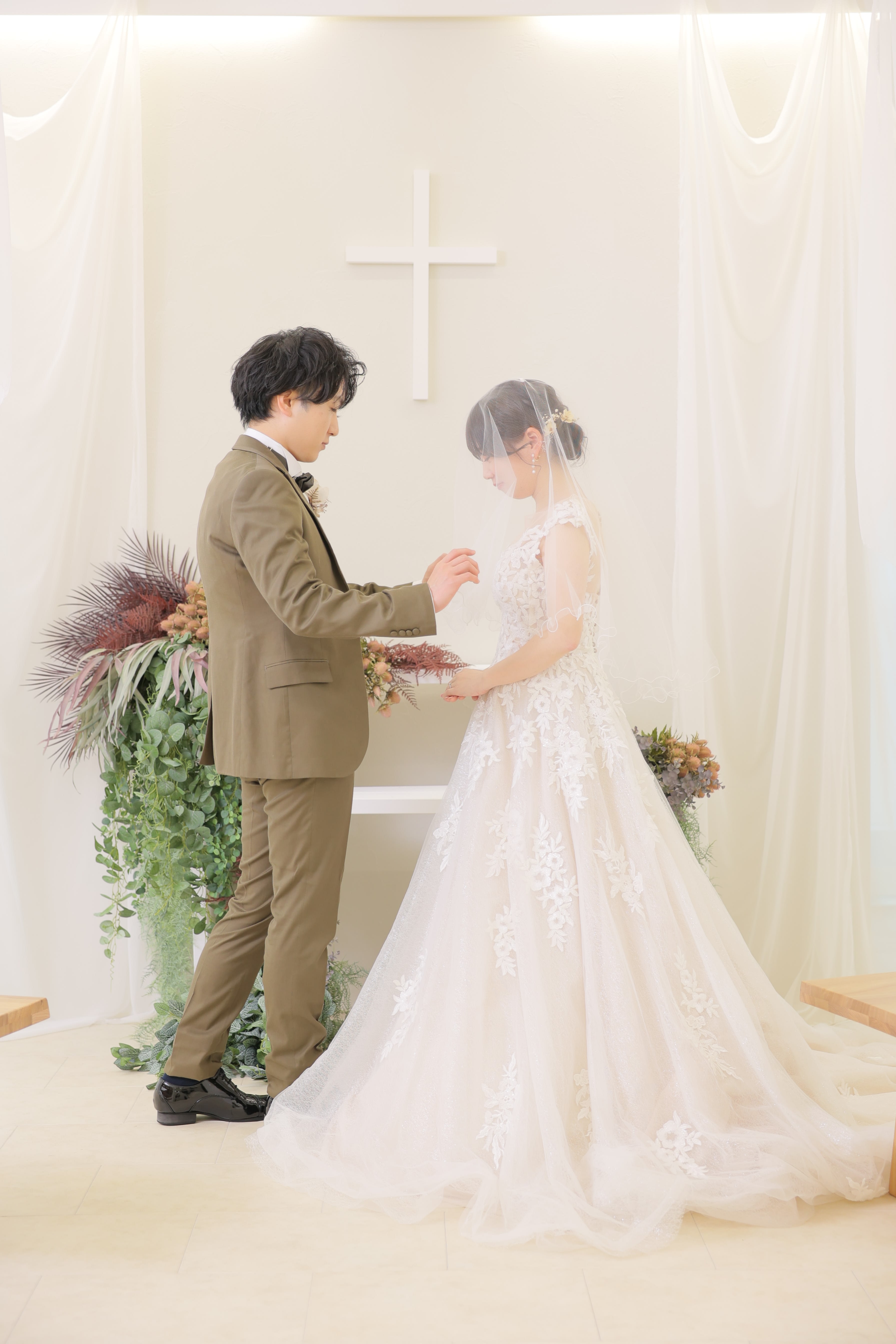 これも式ではお馴染みですよね♪ステキな白のドレスとベールに包まれた新婦様のベールを、アップする新郎様に姿をパシャリ!!
