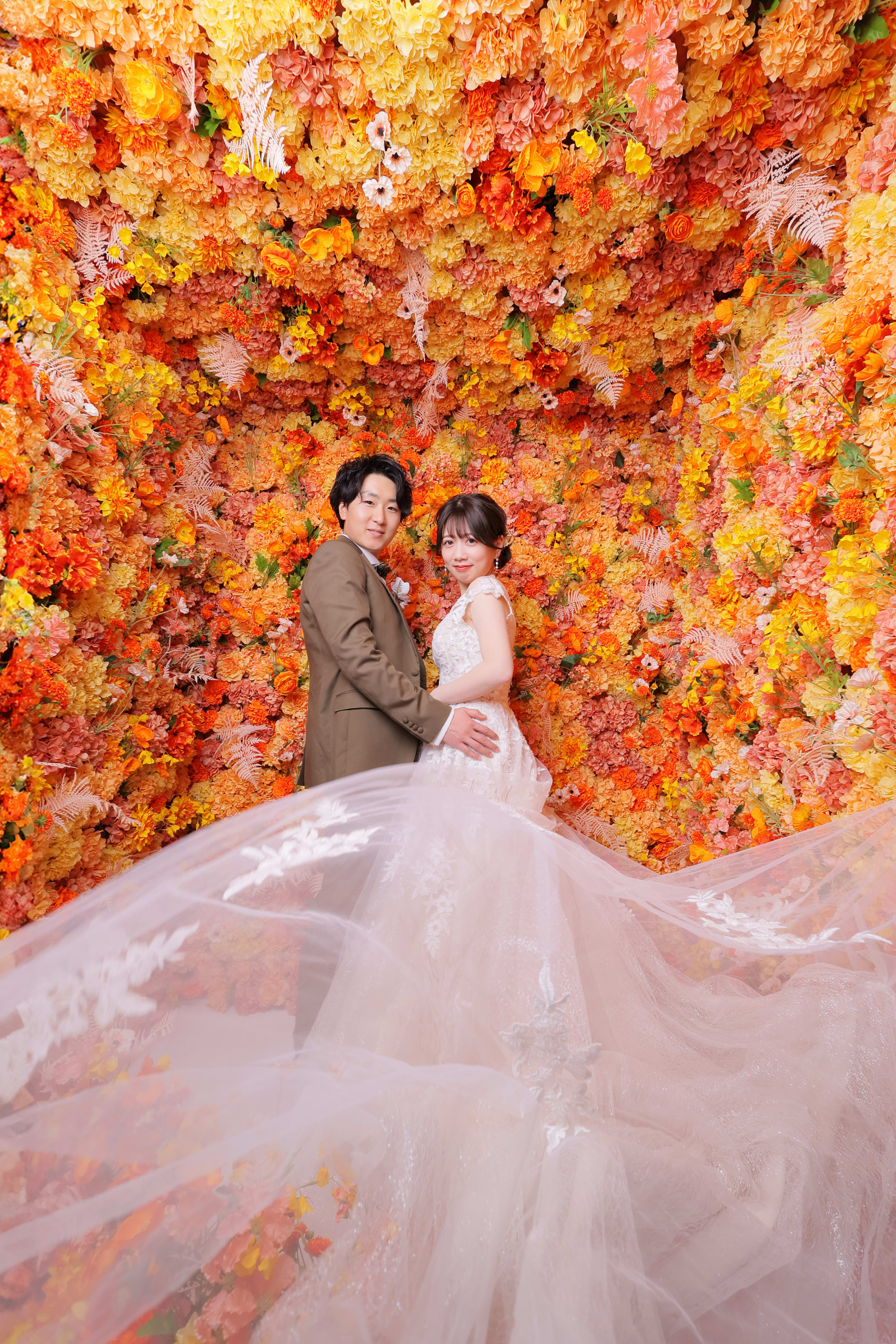 まるで風が吹いたかのように、ドレスを靡かせてお花の中でパシャリ!!