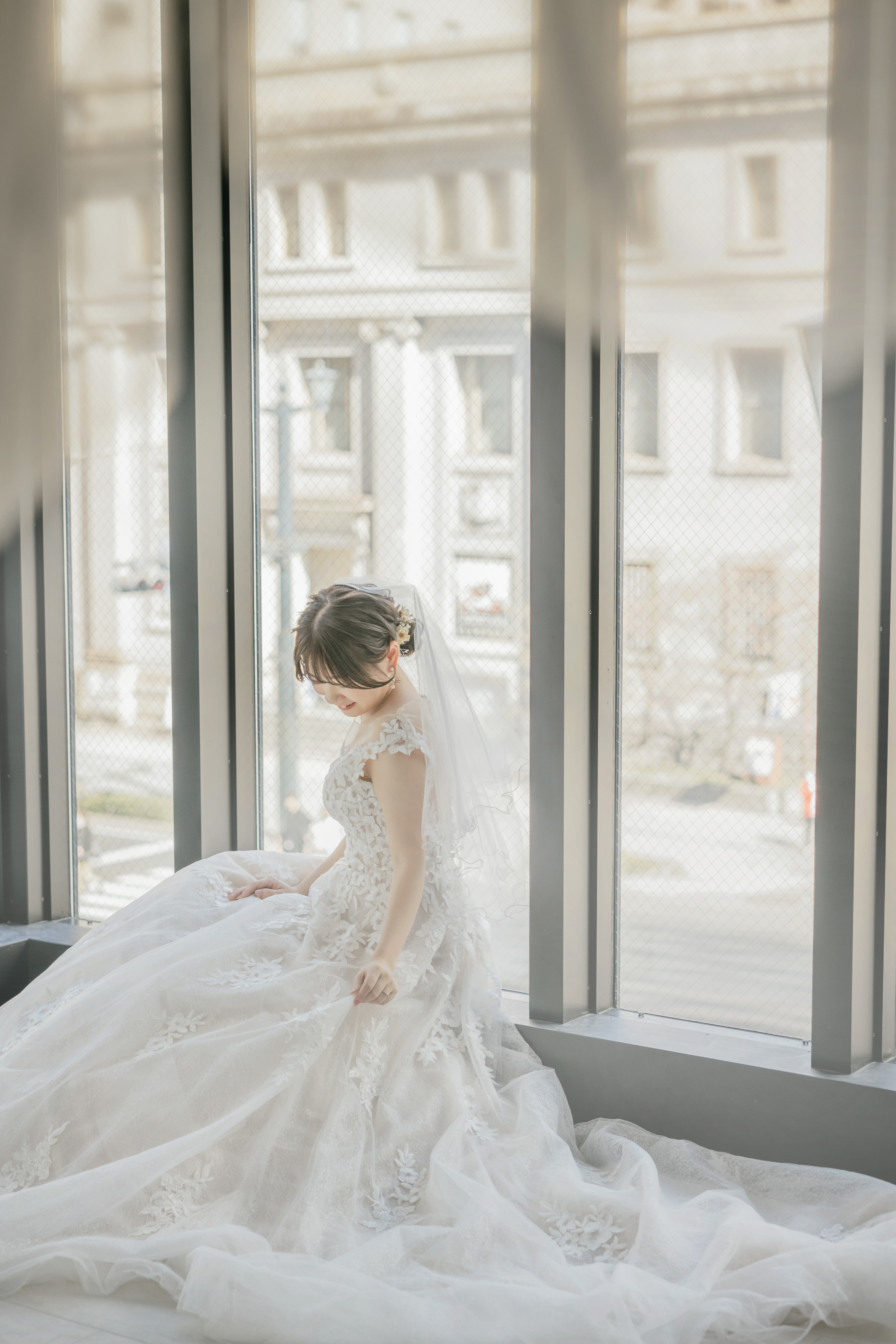 当店にある窓を使って白ドレスを身に纏った新婦様をパシャリ!とても綺麗でドレスがお似合いでした♪