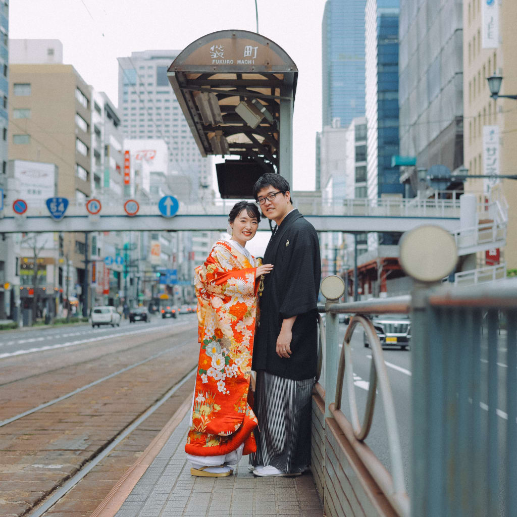 最後に、おふたりが行き着いた場所は....出発地点の電停前でした!! ぼやっと映るおふたりを写真に残し、無事撮影を終えました♪