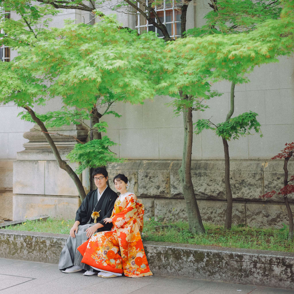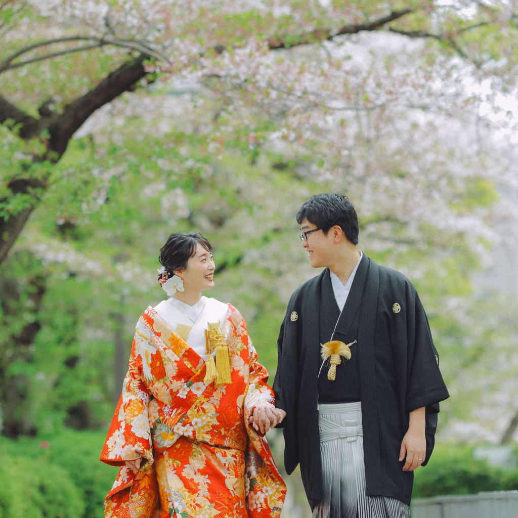 おふたりが撮影された時期が、まだ少し桜が残ってる頃だったので桜の木の下で相笠♪