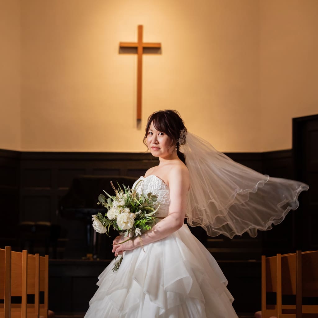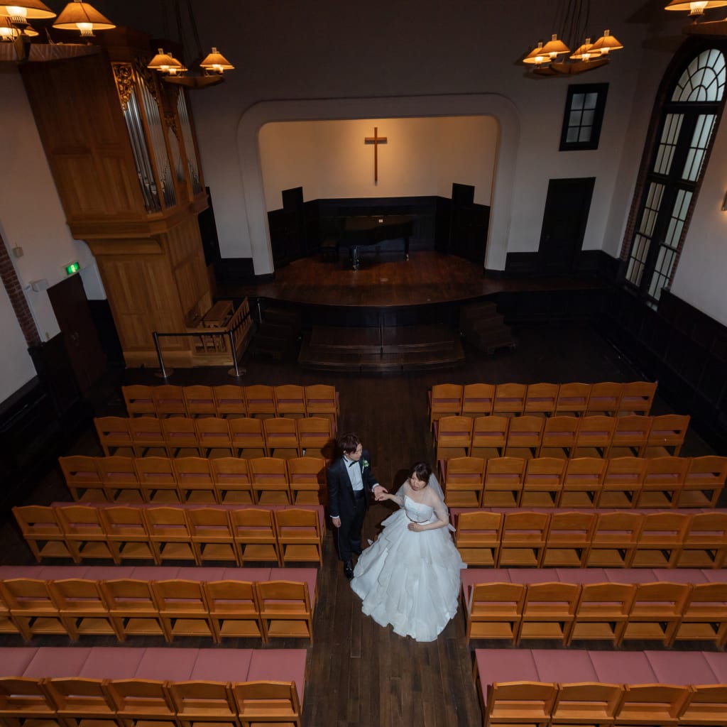 東京都歴史的建造物に指定されたスコットホール。歴史ある建物での写真はより特別感に
