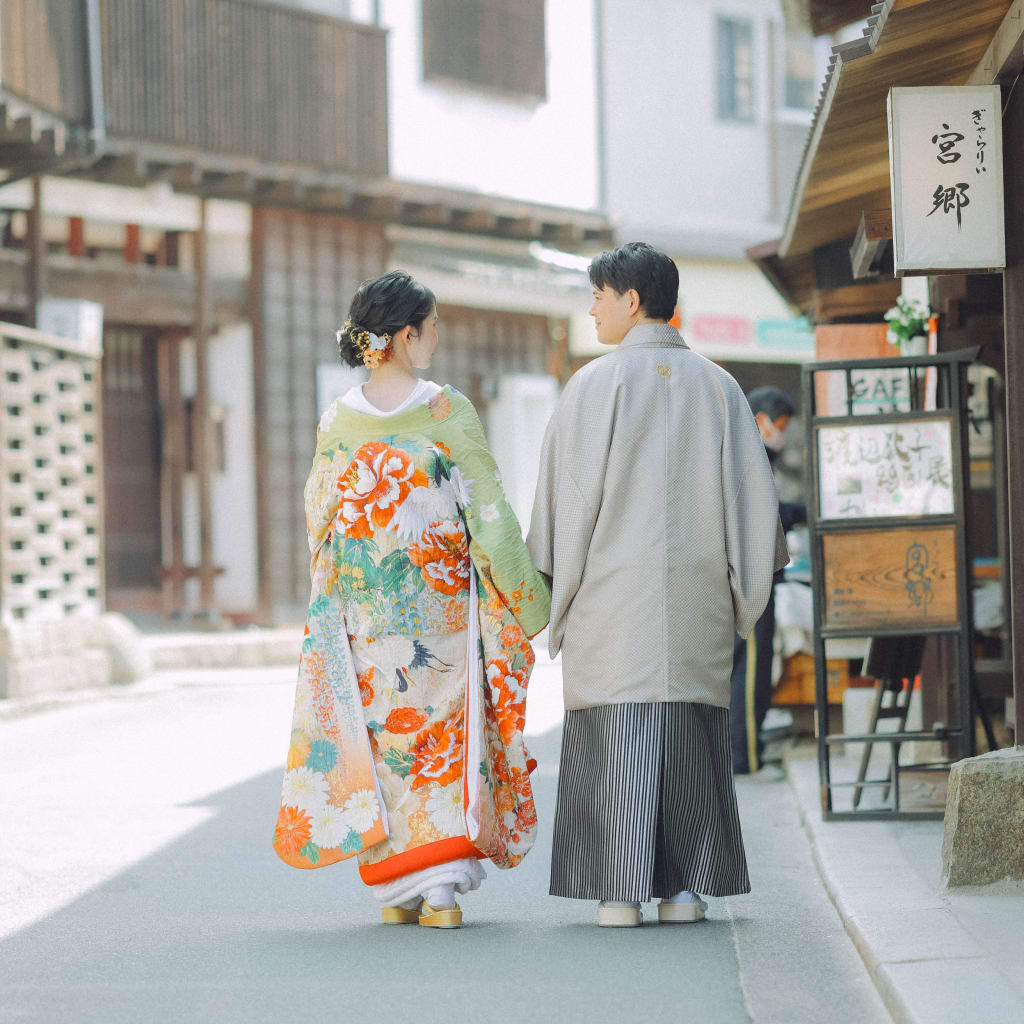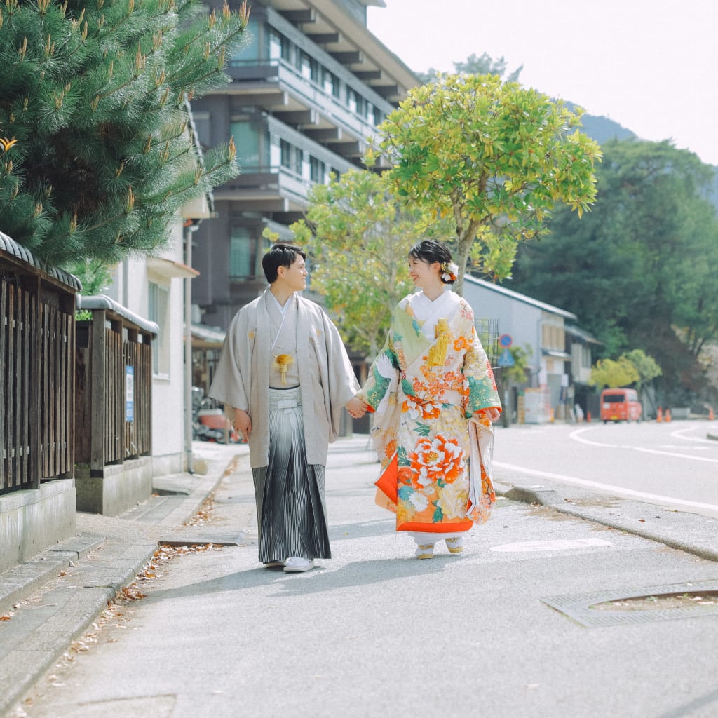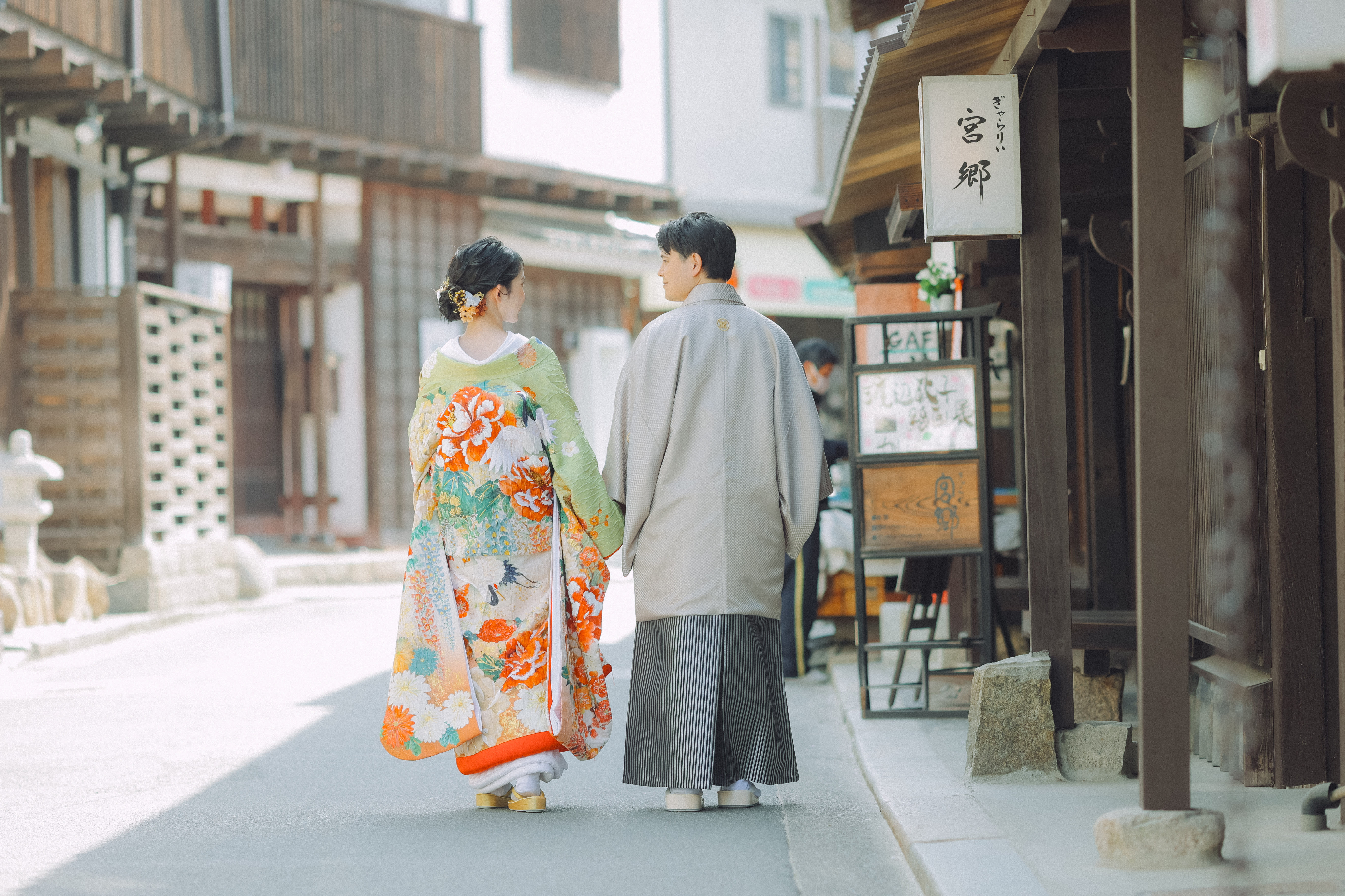 手を繋いで、まずは宮島周辺を散策中のおふたり!!会話しながらどこか楽しげな表情♪