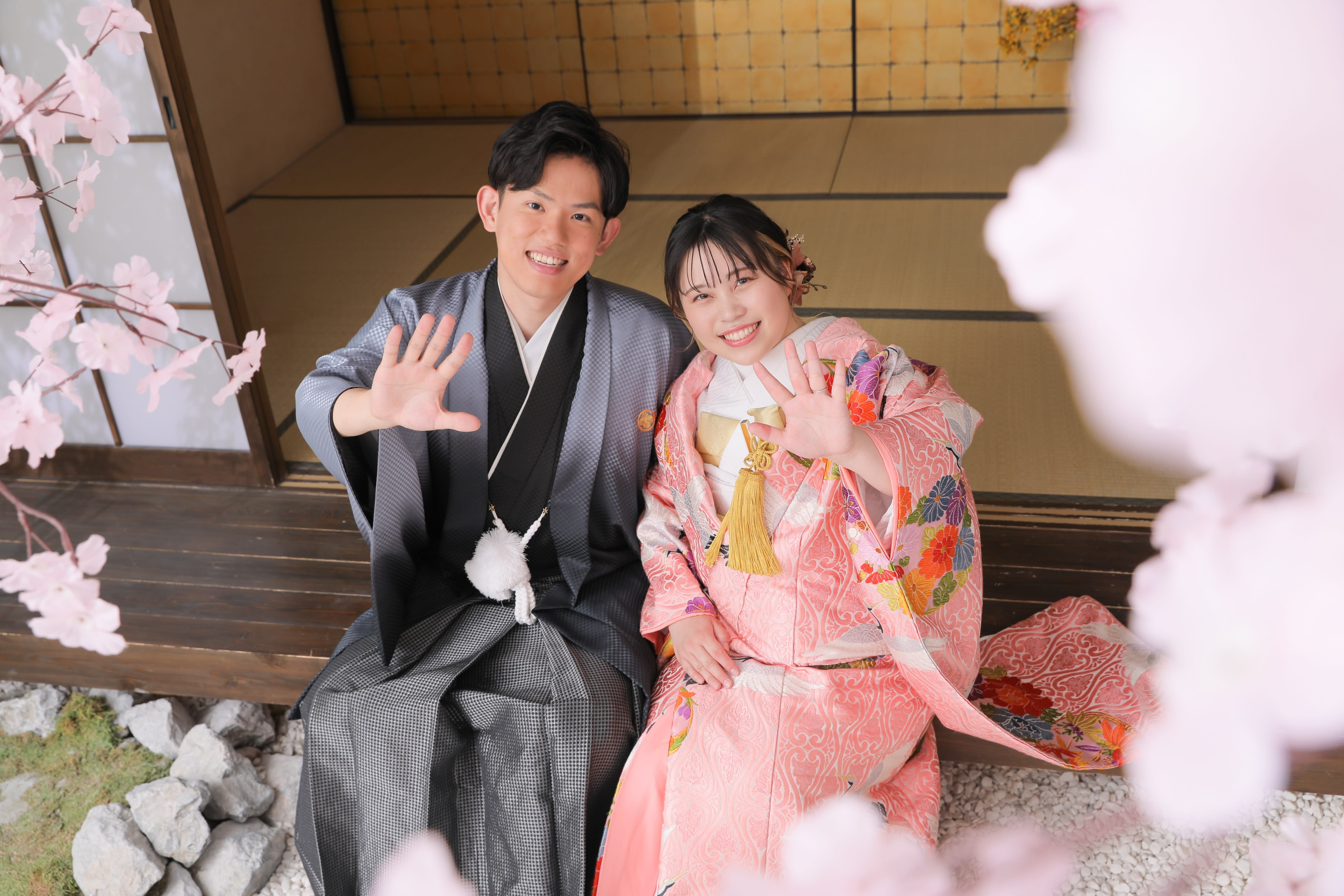 ご新婦様のピンクのお着物に合わせて、桜でお花見している雰囲気でお撮りしました!!お二人の柔らかい笑顔もすごく素敵!!