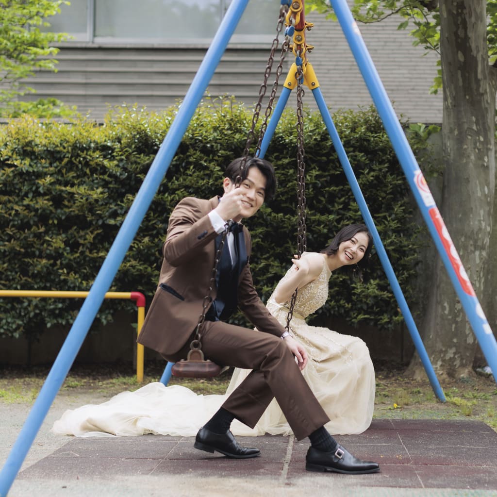 緑深く地形を生かした公園で撮影する洋装ロケーションプラン